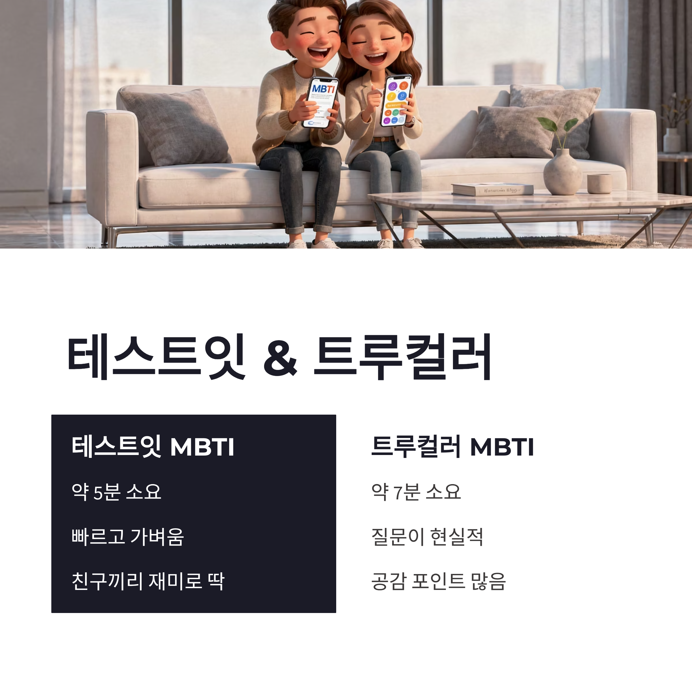 | 트루컬러 MBTI | 질문이 현실적, 공감 포인트 많음 | 약 7분 | 나 성향 좀 알고 싶은 사람 |