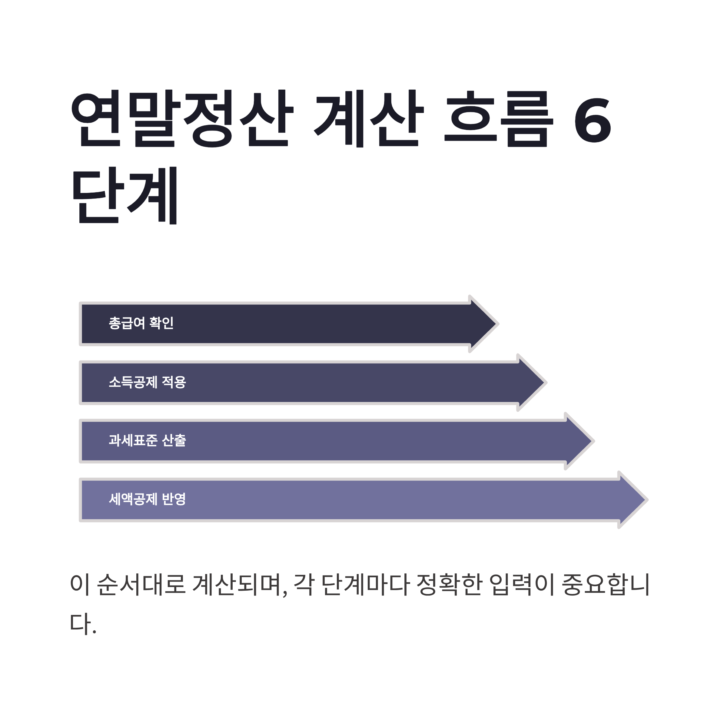 | 단계 | 내용 | | -- | --------- | | 1 | 총급여 확인 | | 2 | 소득공제 적용 | | 3 | 과세표준 산출 | | 4 | 세액공제 반영 | | 5 | 결정세액 계산 | | 6 | 기납부세액과 비교 |