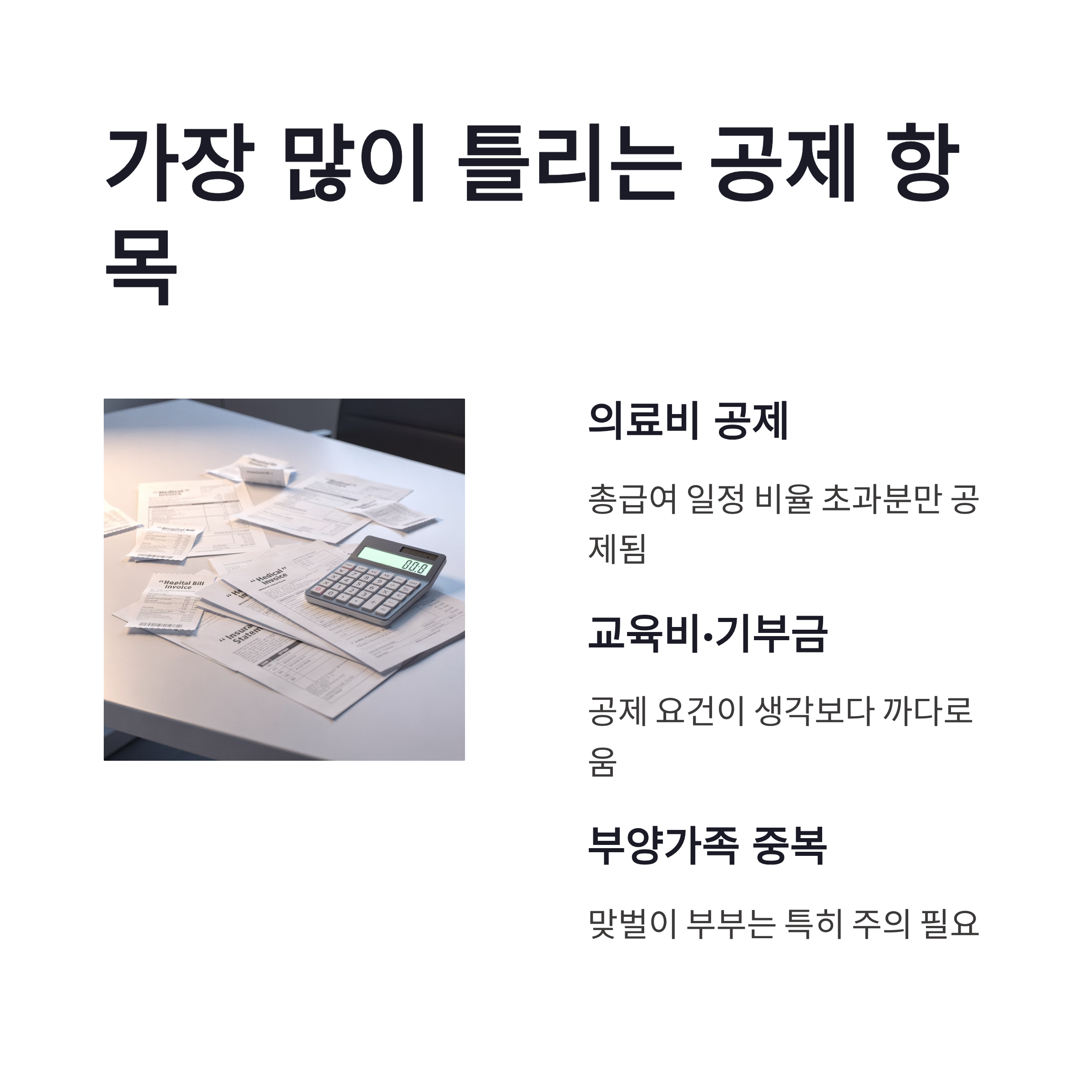 여기서 가장 많이 오류 나는 구간이 공제 항목이었어요. 의료비, 교육비, 기부금, 신용카드 공제 요건… 생각보다 조건이 빡셉니다. 예를 들면 의료비는 총급여의 일정 비율 초과분만 공제되고, 부양가족은 중복 공제가 진짜 많이 발생해요. 맞벌이 부부면 특히 주의해야 하구요. 저도 예전에 연말정산 결과 미리보기에서는 환급으로 나왔는데, 실제 결정세액 보니까 추가납부 떠서 멘붕 왔던 적 있었거든요 ㅠㅠ