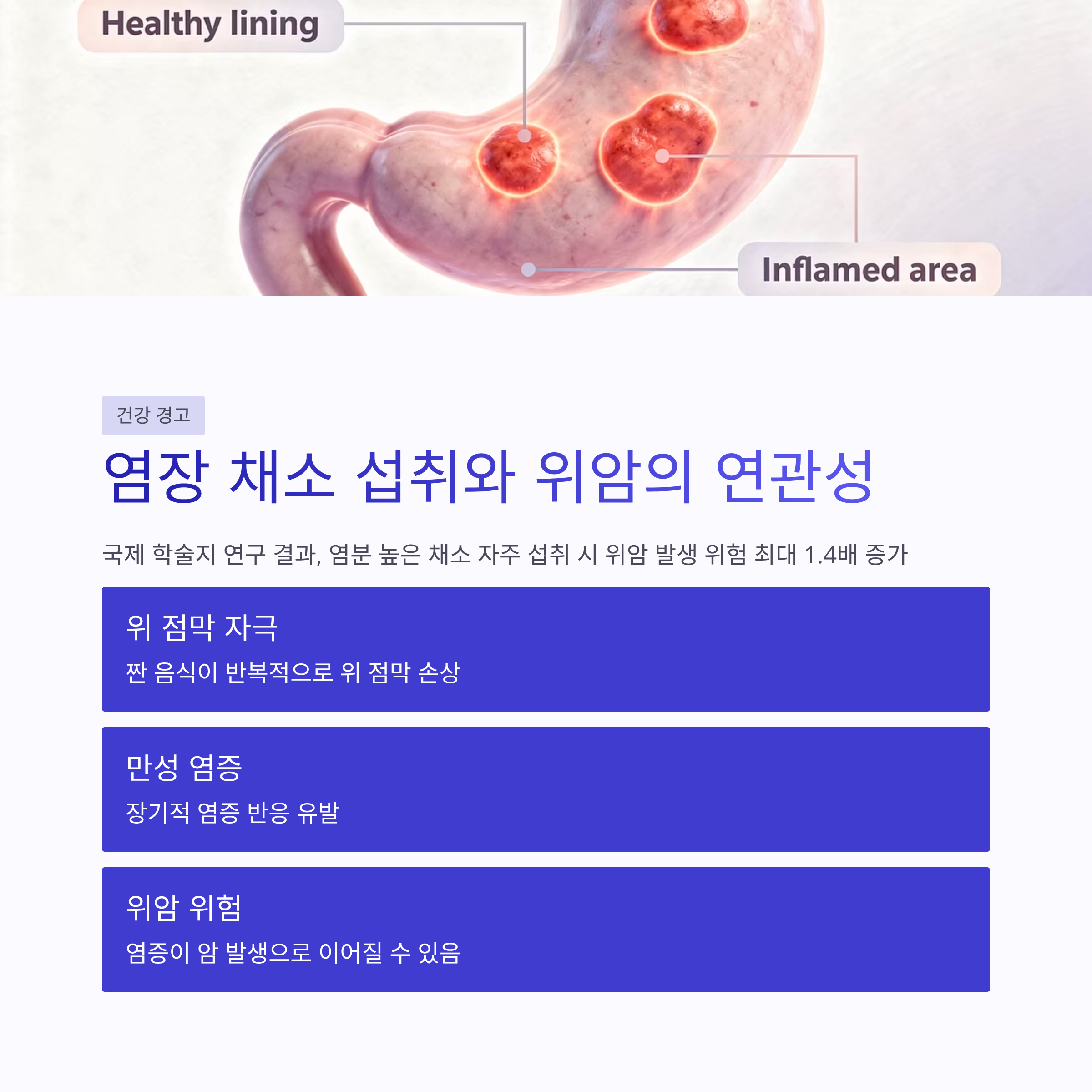 #염장채소 #염장채소위암위험 #위암예방 #저염식습관 #김치섭취 #짠음식주의 #위건강관리 #한국식단 #나트륨섭취 #식습관개선 #건강정보 #위암원인 #저염김치 #채소섭취 #2026건강