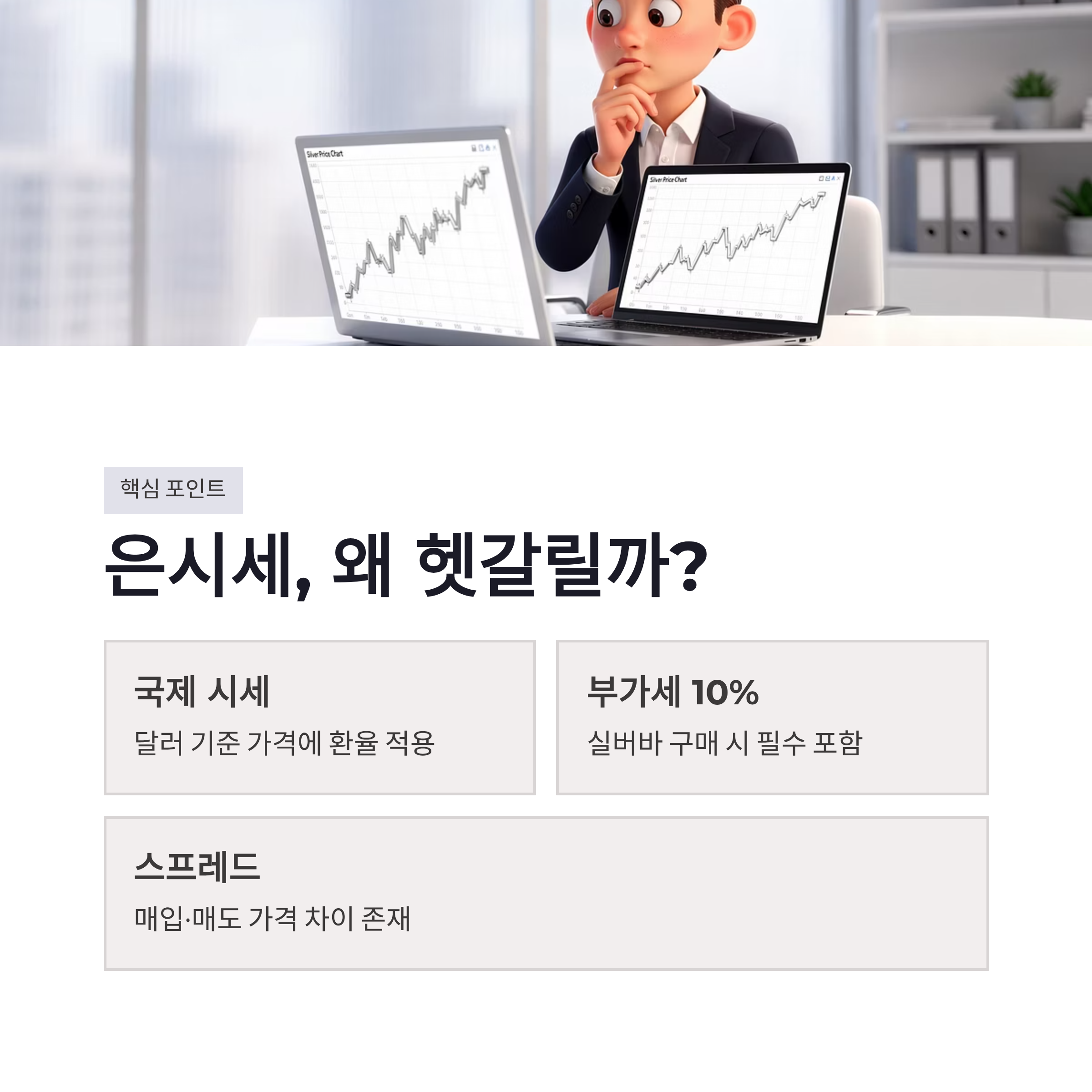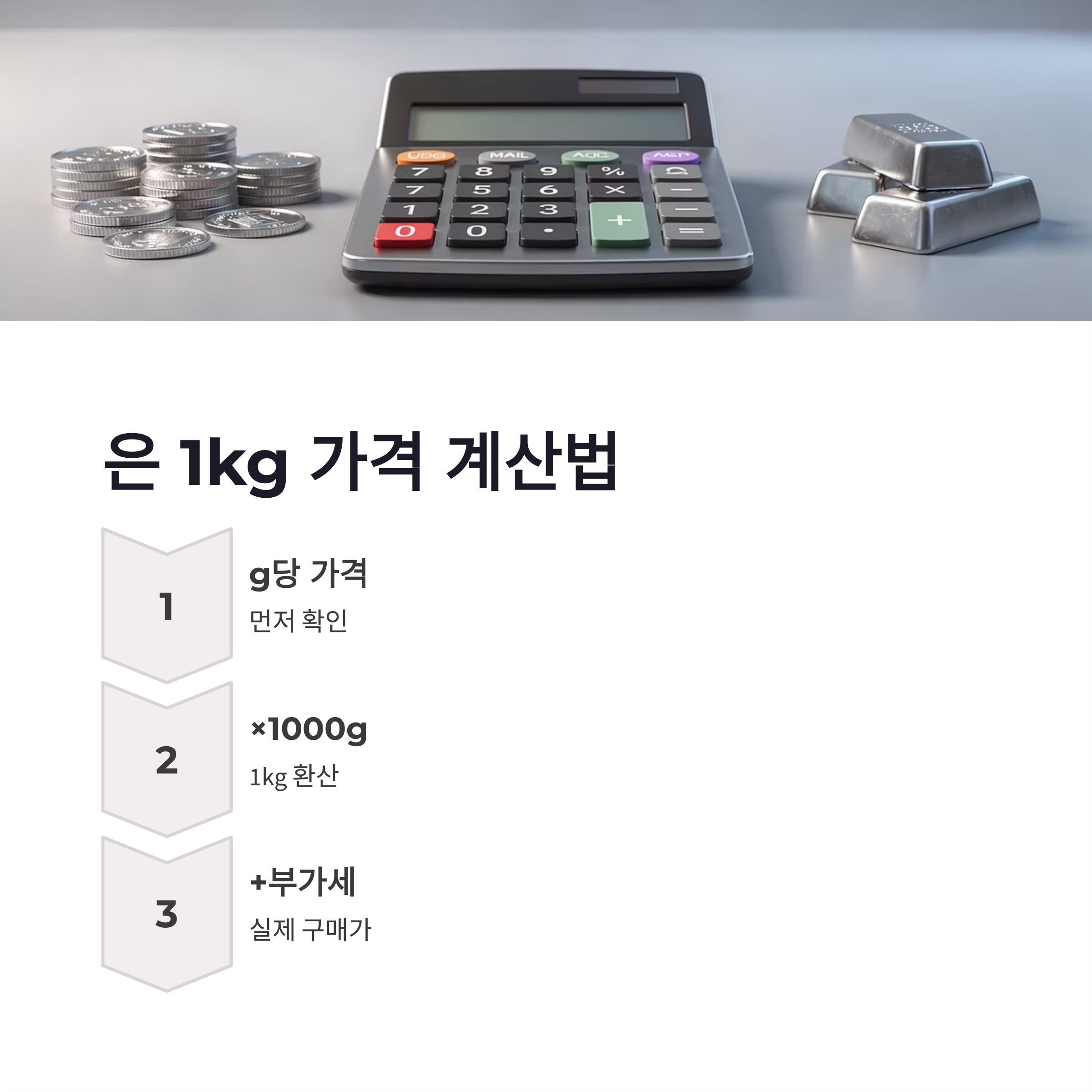 은을 살 때 기준은 생각보다 단순한 듯하면서도 함정이 있어요. 국제 시세 그대로가 아니라는 점. 실버바는 부가세 10% 포함이 기본이라 체감가가 확 올라갑니다. 제가 처음 살 때도 “어? 왜 이렇게 비싸?” 했던 기억이 나네요.