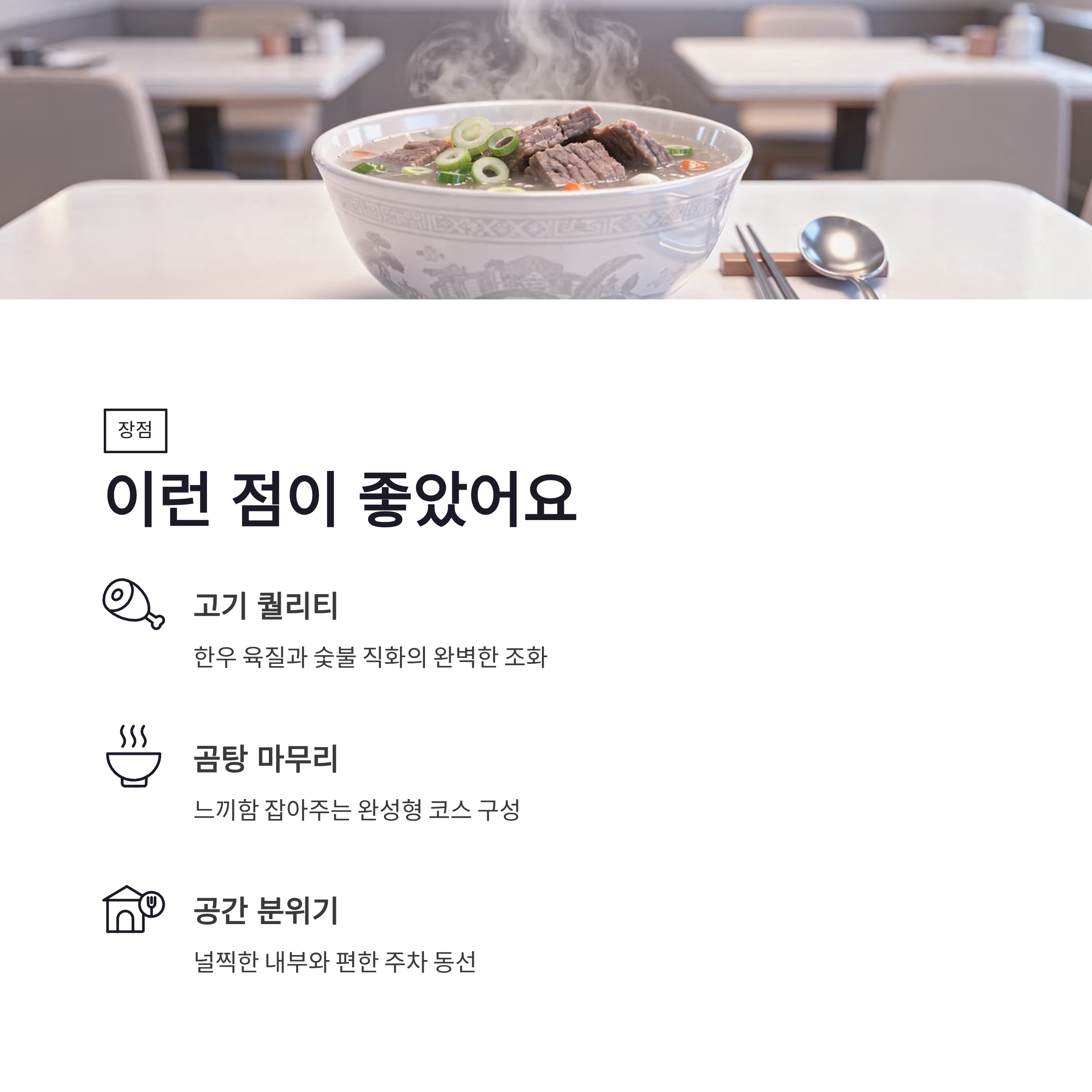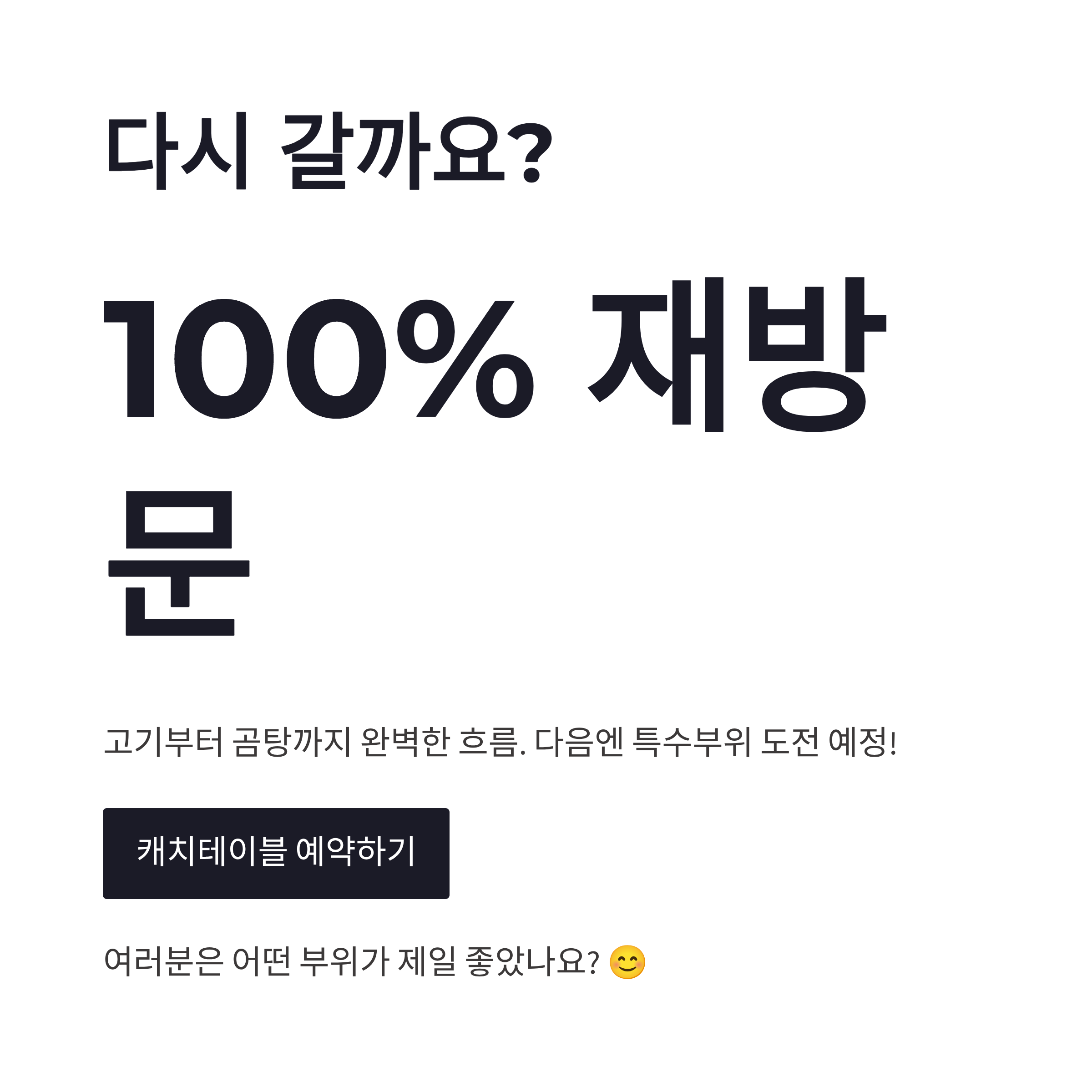 예약은 캐치테이블로 가능해요. 이거 진짜 중요… 그냥 가면 못 먹을 확률 높아요. 장점부터 말하면, 고기 퀄리티랑 숯향, 그리고 곰탕 마무리까지 흐름이 완성형이에요. “아 잘 먹었다”라는 말이 절로 나와요. 단점이라면… 회전이 빠른 편은 아니라서, 피크타임엔 살짝 기다릴 수 있어요. 그리고 고기 위주다 보니 가볍게 한 끼 느낌은 아니에요. 제대로 먹는 날에 가는 게 맞아요.