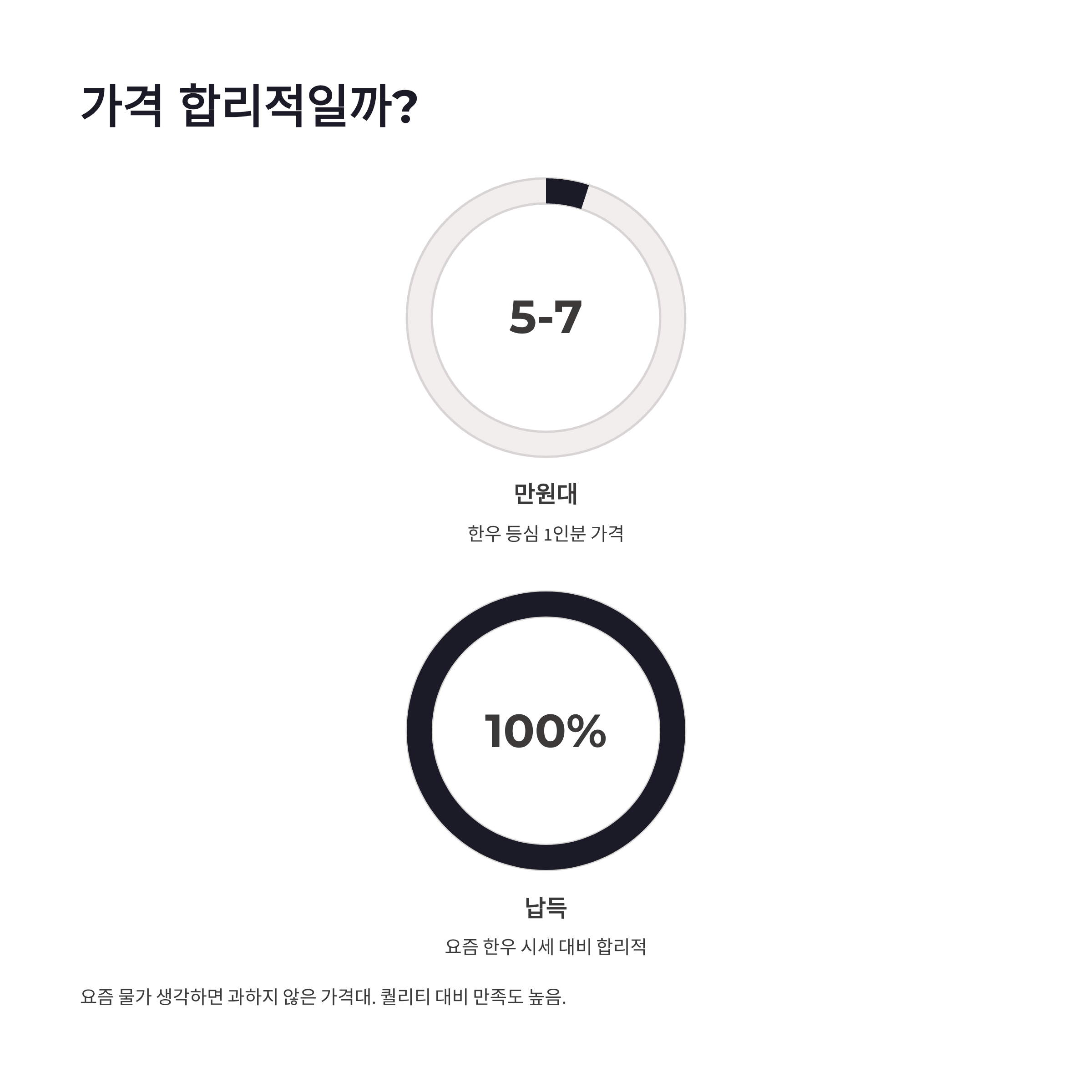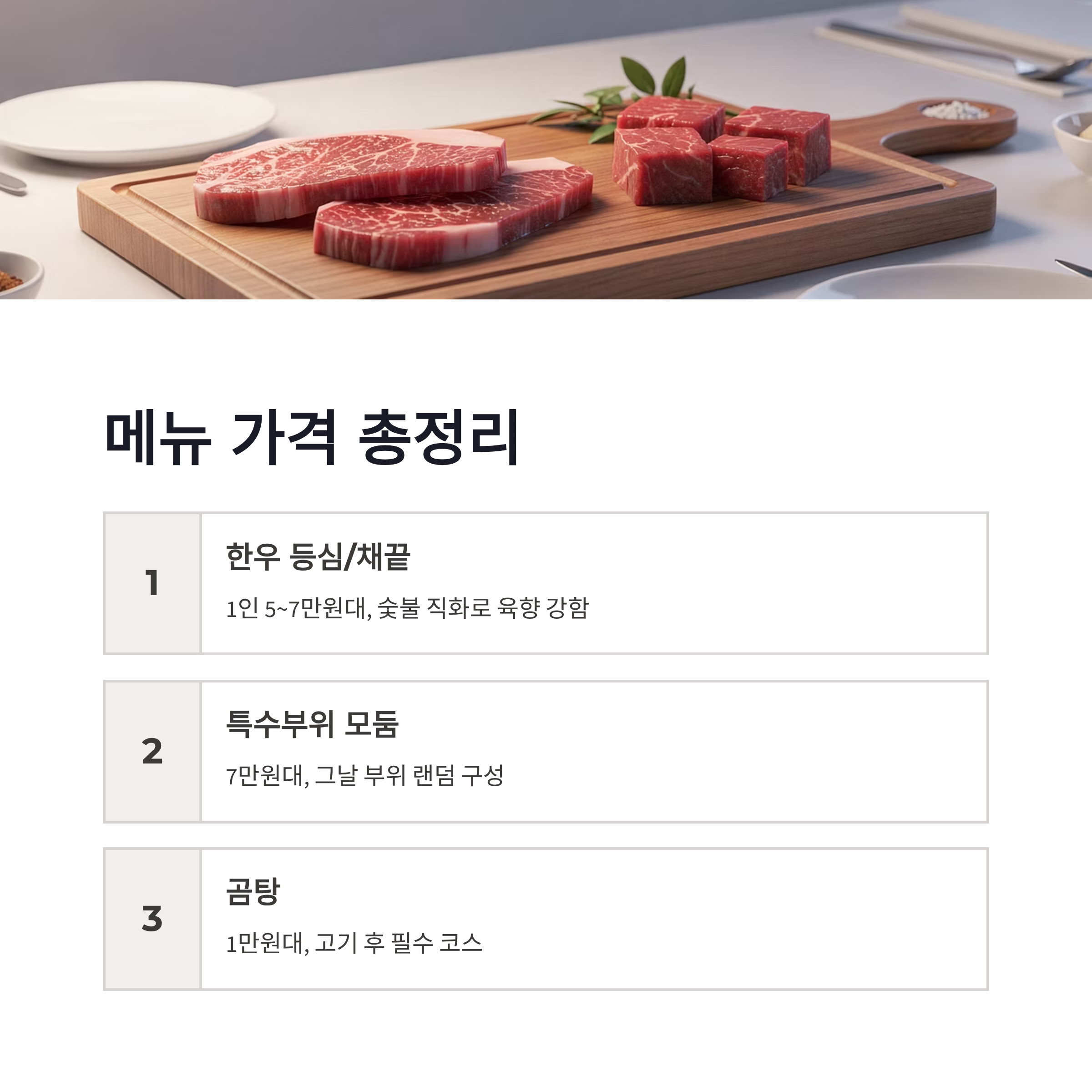 | 한우 구이 | 한우 등심 / 채끝 | 1인 5~7만 | 숯불 직화, 육향 강함 |