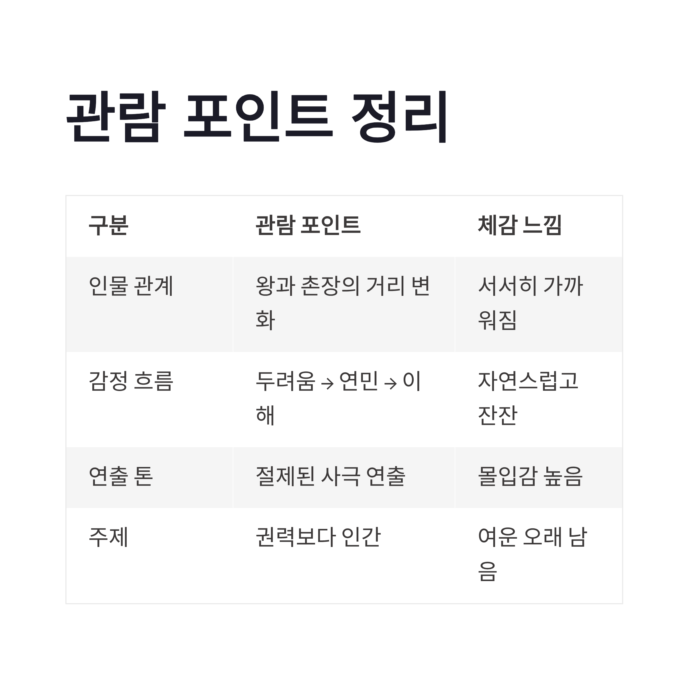 이 영화의 포인트를 한 번 정리해보면 생각보다 명확합니다. 제가 보면서 느낀 기준으로 표로 정리해봤어요.
