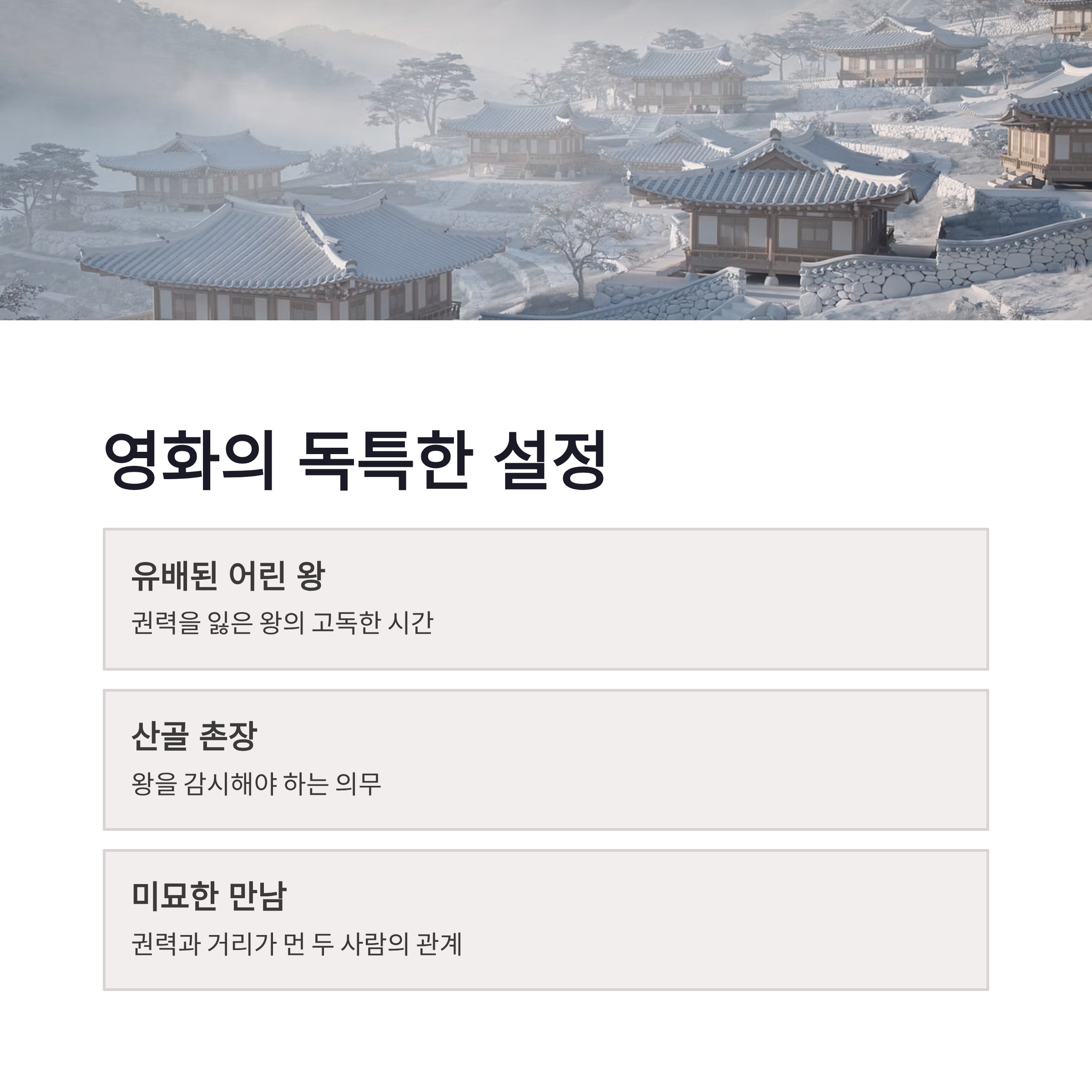 처음 이 영화를 접했을 때, 솔직히 말하면 “또 사극이네?” 이런 생각이 먼저 들었는데요. 근데 왕과 사는 남자는 결이 좀 달랐습니다. 유배된 어린 왕과 그를 감시해야 하는 산골 촌장. 이 설정부터가 묘하게 마음을 건드리더라구요. 권력을 잃은 왕과, 권력과는 거리가 먼 촌장의 만남이라니… 이건 시작부터 감정선이 생길 수밖에 없겠쥬. 시간이 흐르면서 두 사람 사이에 생기는 미묘한 변화, 처음엔 경계와 의무였던 관계가 점점 사람 대 사람으로 바뀌는 과정이 꽤 잔잔하게 그려집니다. 화려한 액션이나 큰 사건보다는, 눈빛·침묵·말 사이의 공백 같은 게 오래 남는 스타일이었어요. 개인적으로 이런 사극, 요즘 더 끌리더라구요 ㅎㅎ