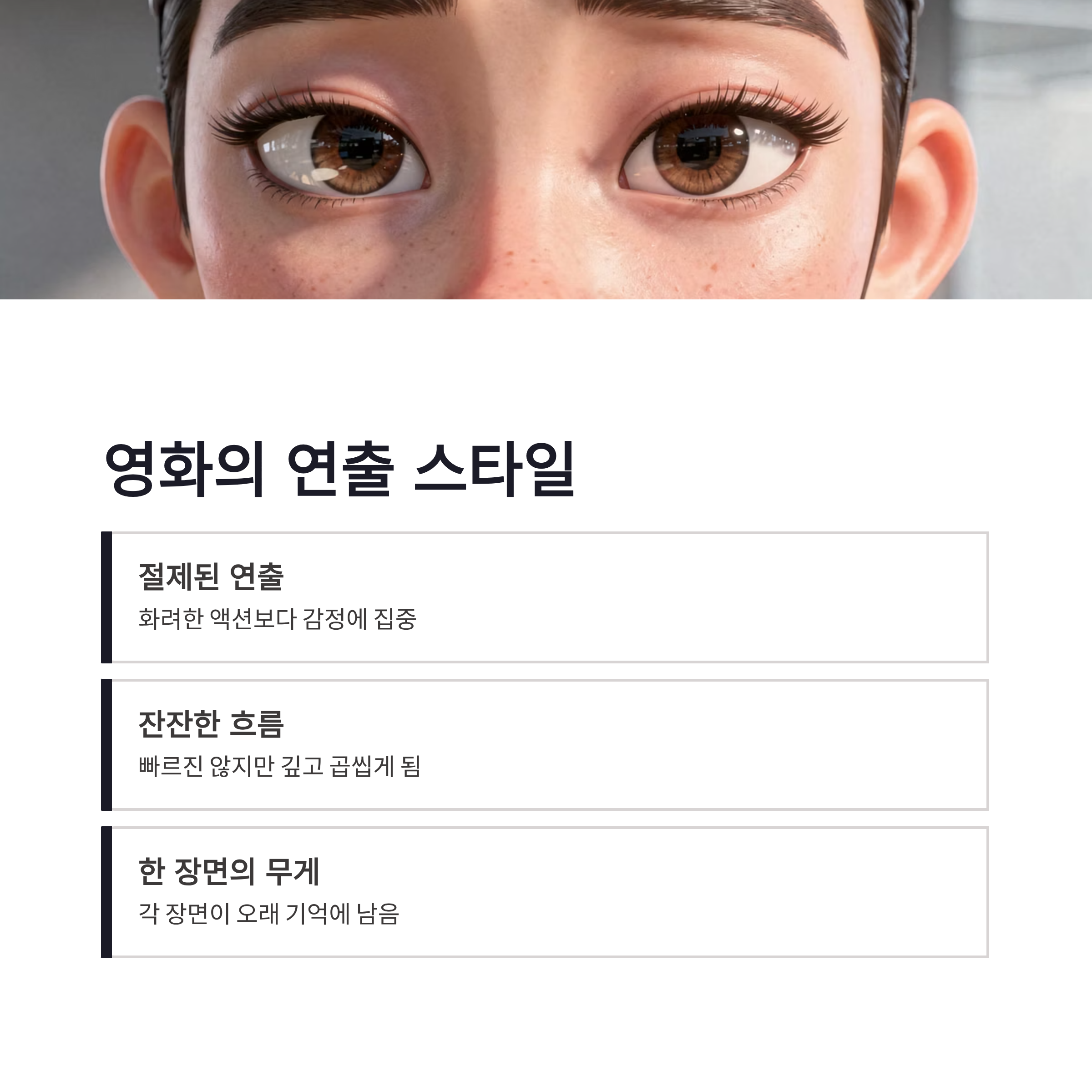 | 감정 흐름 | 두려움 → 연민 → 이해 | 자연스럽고 잔잔 |
