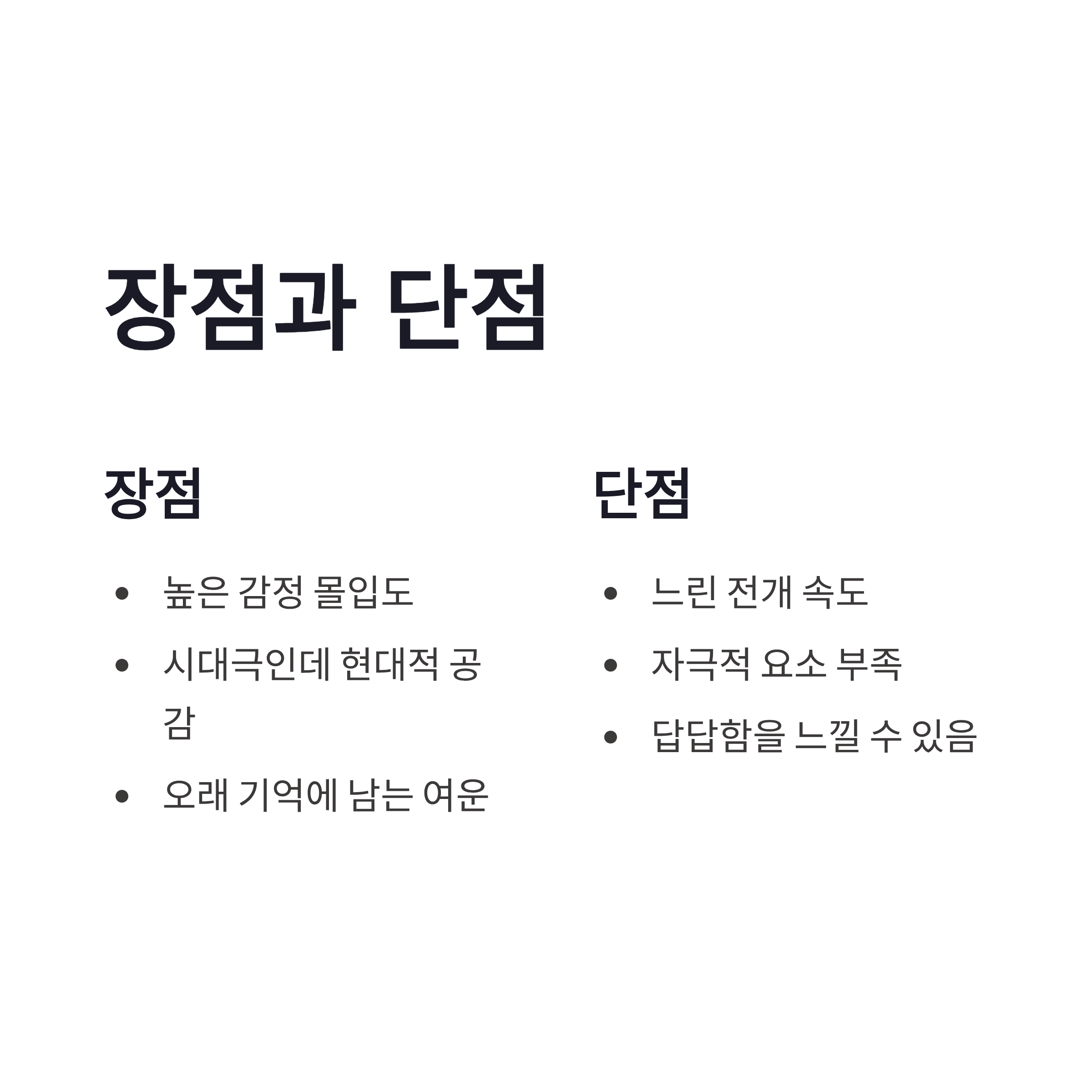 | 연출 톤 | 절제된 사극 연출 | 몰입감 높음 |