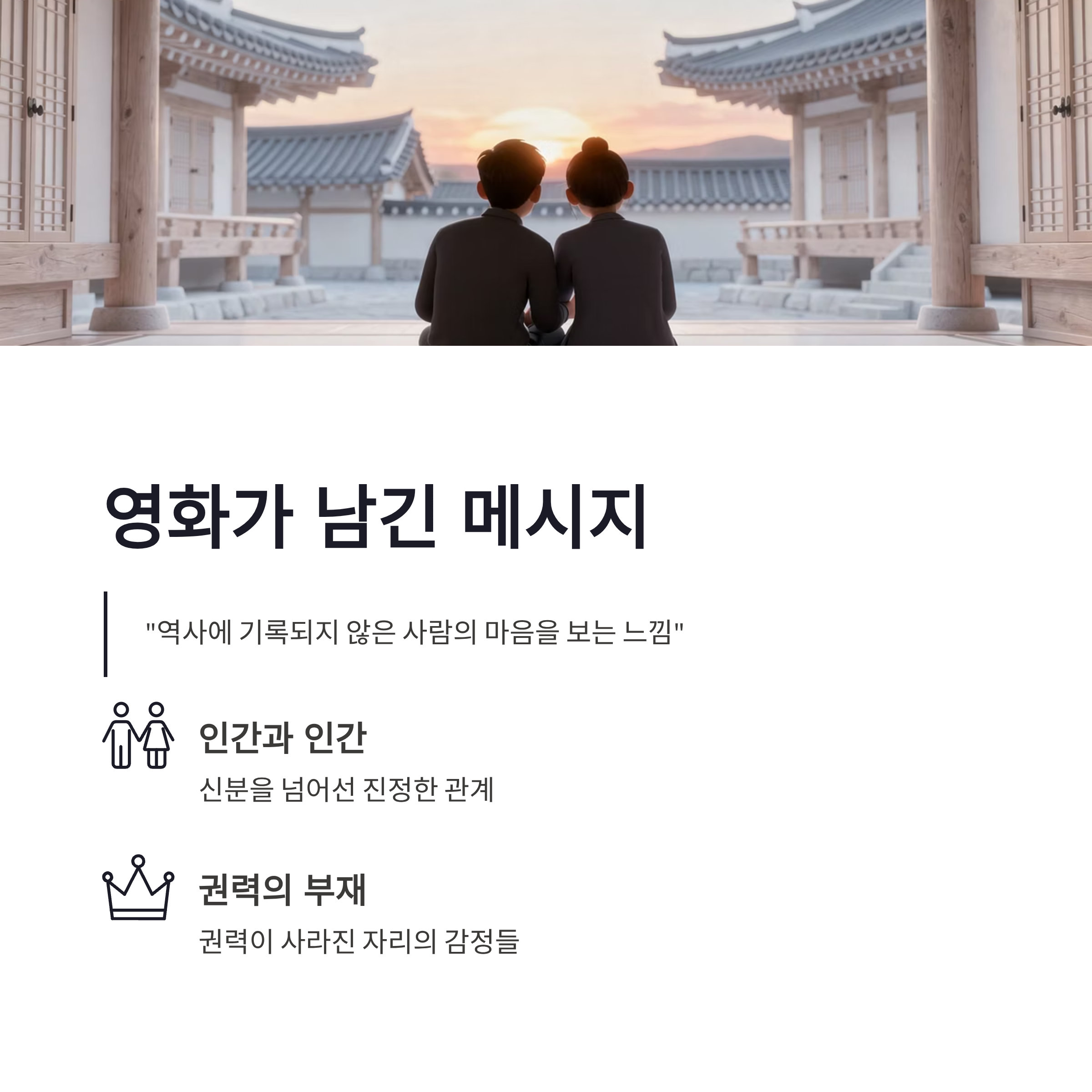 2025~2026년 들어 사극 트렌드가 꽤 바뀌고 있잖아요. 왕권·전쟁 중심에서 벗어나, 개인의 선택과 감정에 초점을 맞추는 작품들이 늘었는데요. 이 영화도 그 흐름 안에 정확히 들어가 있습니다. 장점이라면 감정 몰입도가 높고, 시대극인데도 지금 이야기처럼 느껴진다는 점. 반대로 단점이라면, 속도감 있는 전개를 기대하면 살짝 답답할 수도 있다는 점이겠쥬. 그래도 저는 이런 사극이 오히려 더 오래 기억에 남더라구요. “역사에 기록되지 않은 사람의 마음”을 보는 느낌이라서요.