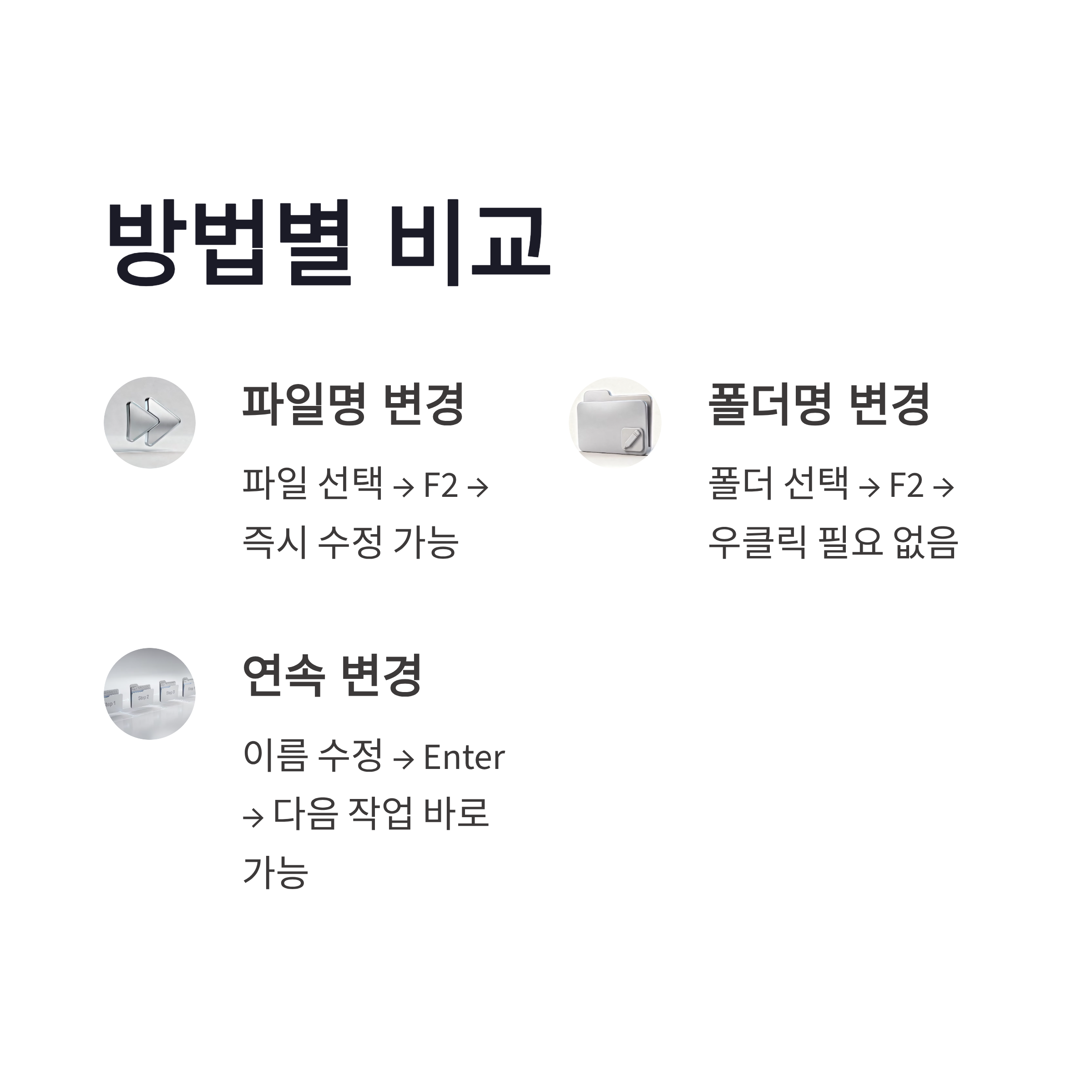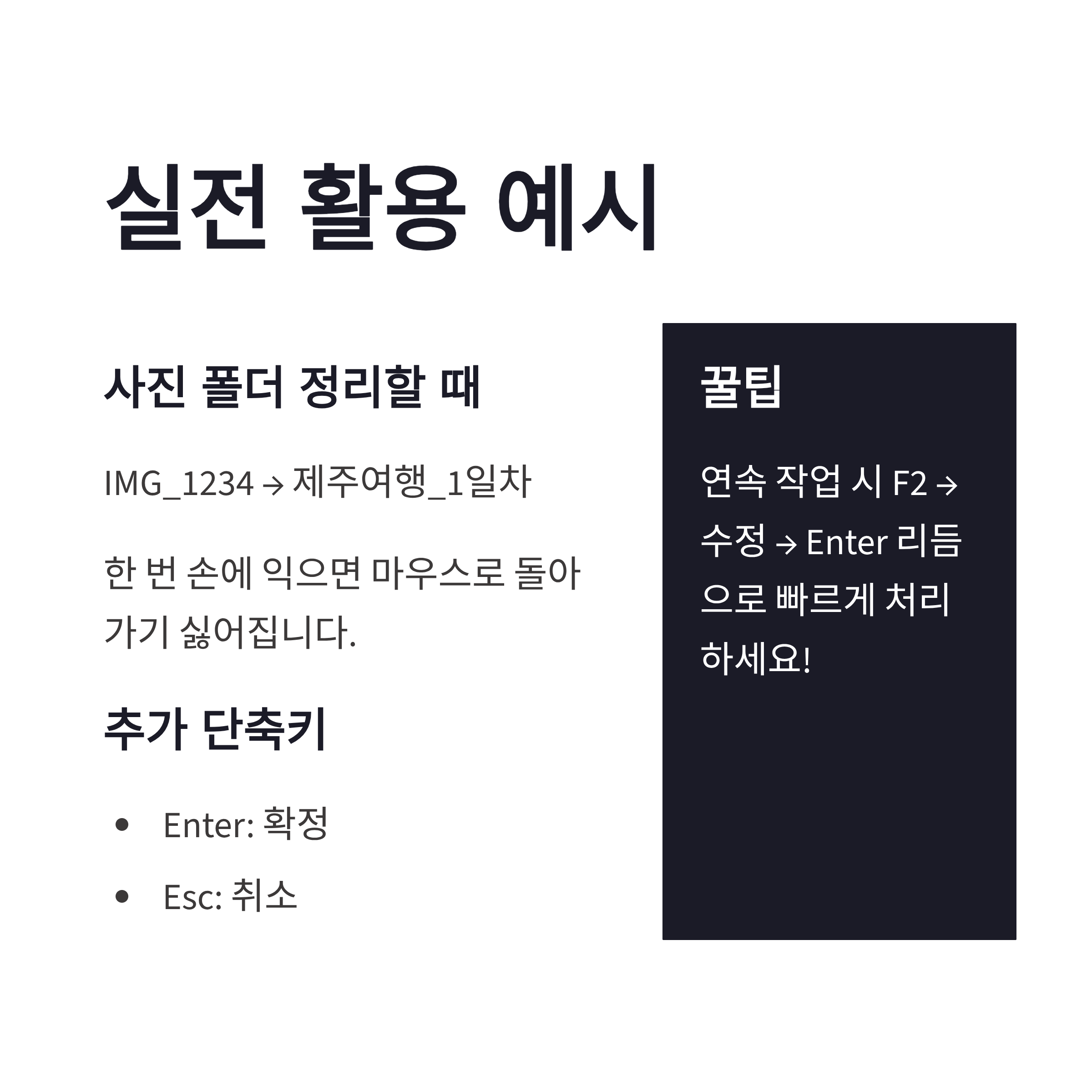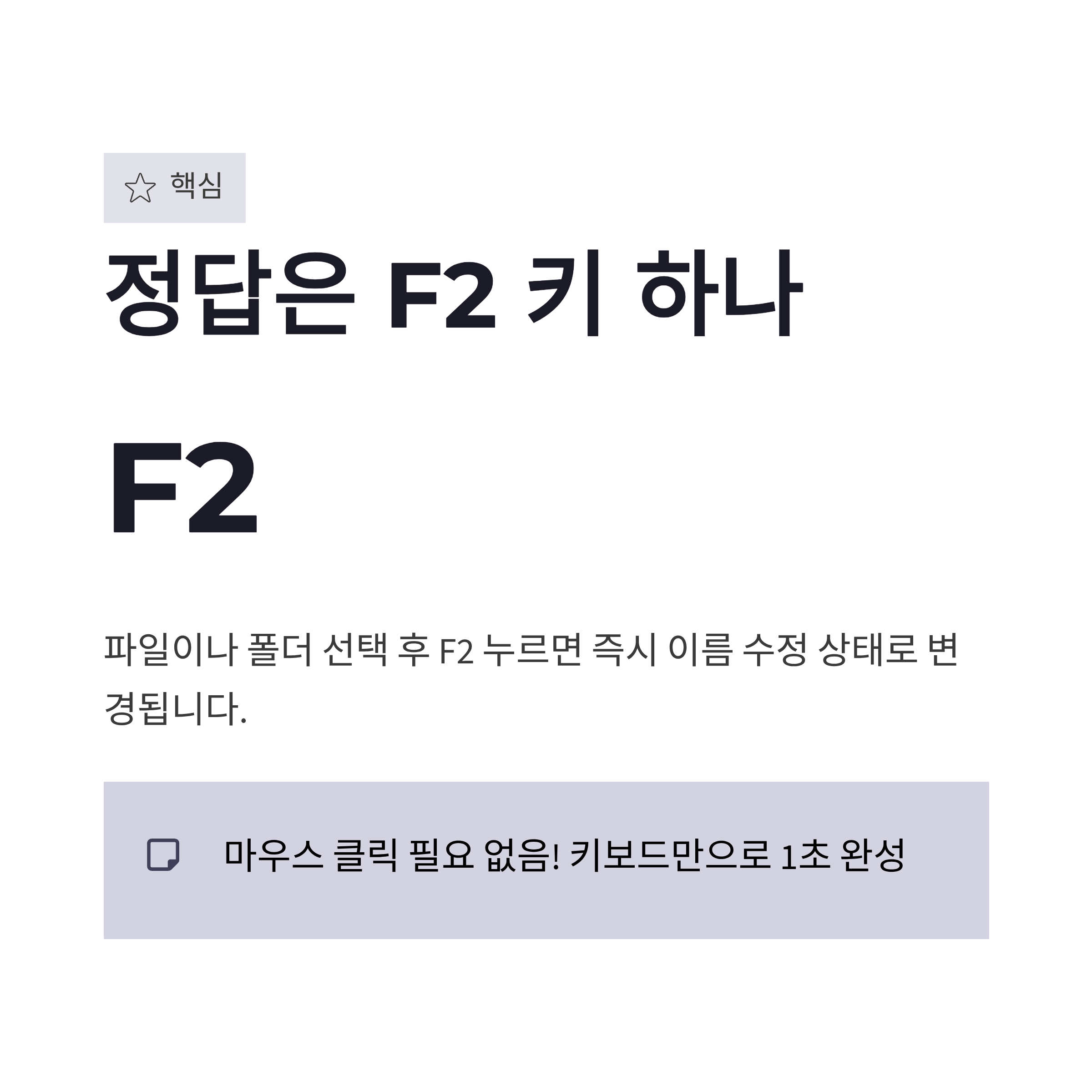 | 폴더명 변경 | 폴더 선택 → F2 | 우클릭 필요 없음 |
