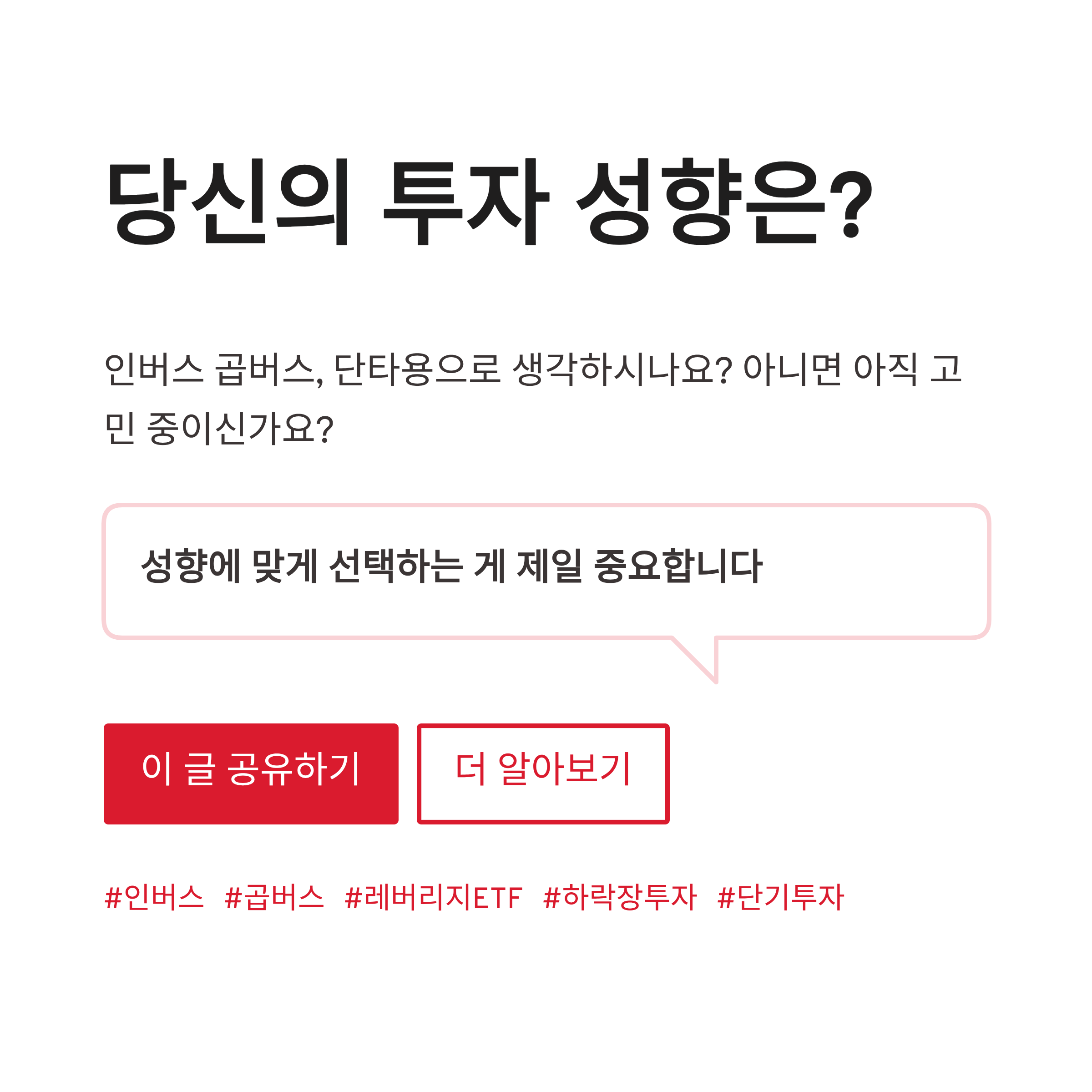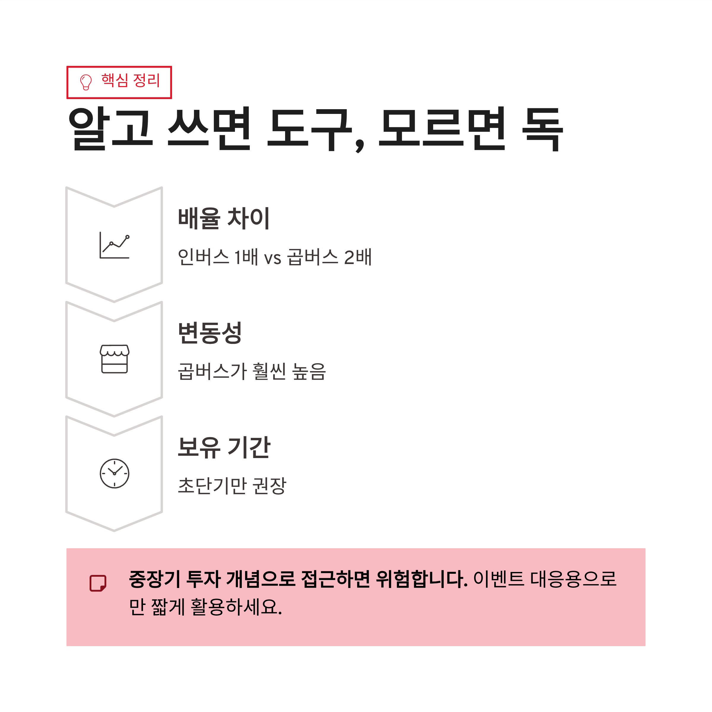 정리해보면 인버스 곱버스 차이는 배율과 변동성, 그리고 보유 기간에서 갈립니다. 하락장 대비용 도구로는 분명 유용하지만, 중장기 투자 개념으로 접근하면 위험해요. 저는 이제 이벤트 대응용으로만 아주 짧게 쓰는 편이구요. 괜히 욕심내면 멘탈부터 털리더라구요 ㅠㅠ 여러분은 인버스 곱버스, 단타용으로 생각하고 계신가요? 아니면 아직 고민 중이신가요? 성향에 맞게 선택하는 게 제일 중요하더라구요.
