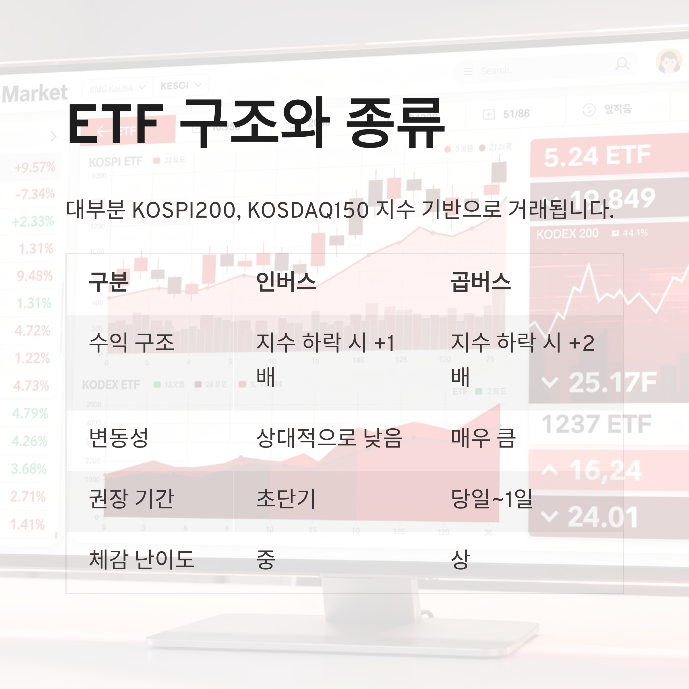 인버스 곱버스는 대부분 ETF 형태로 거래됩니다. 기준은 보통 KOSPI200, KOSDAQ150 같은 지수구요. 인버스는 -1배, 곱버스는 -2배 수익률을 목표로 설계돼요. 문제는 하루 수익률 기준으로 리셋된다는 점… 이거 진짜 중요함다.