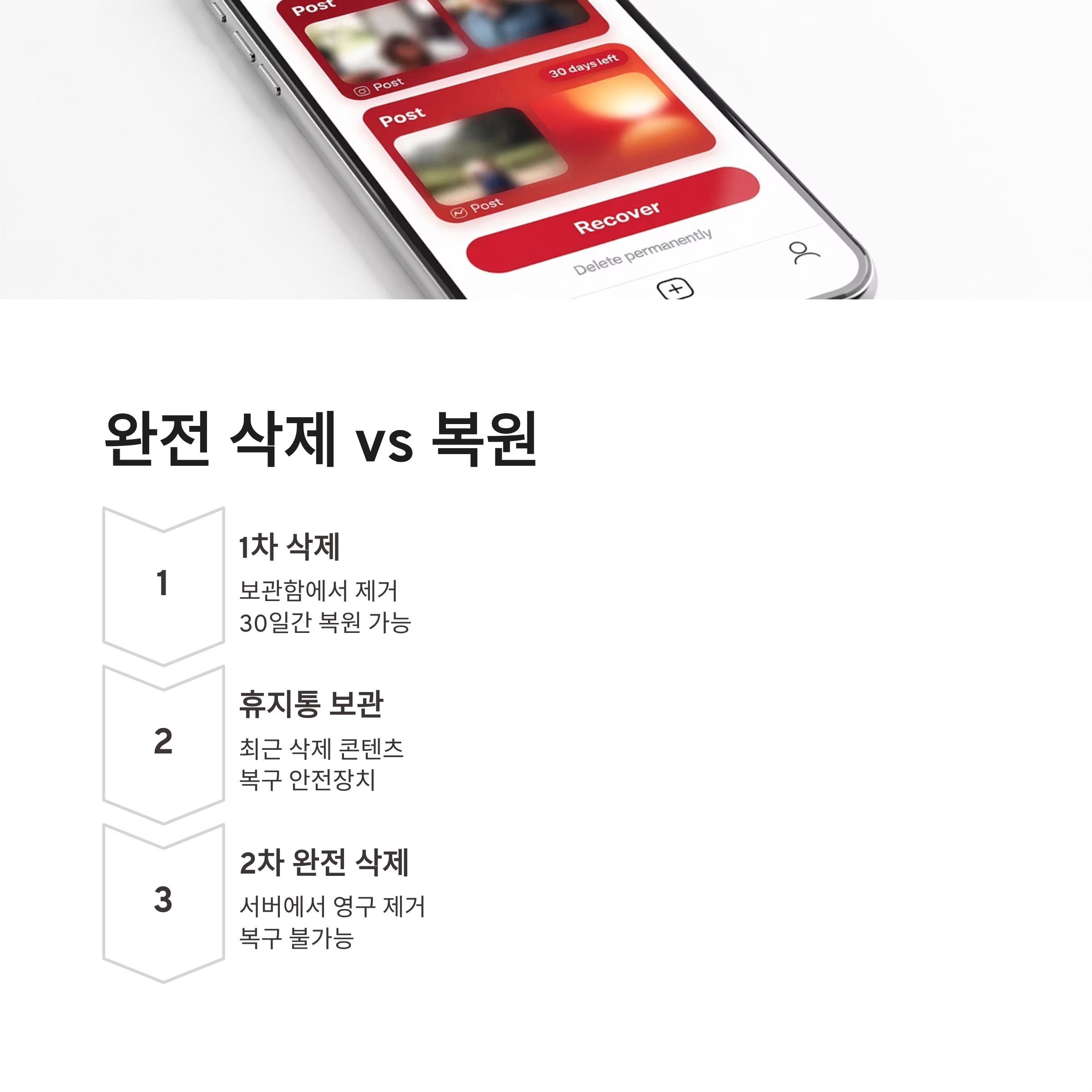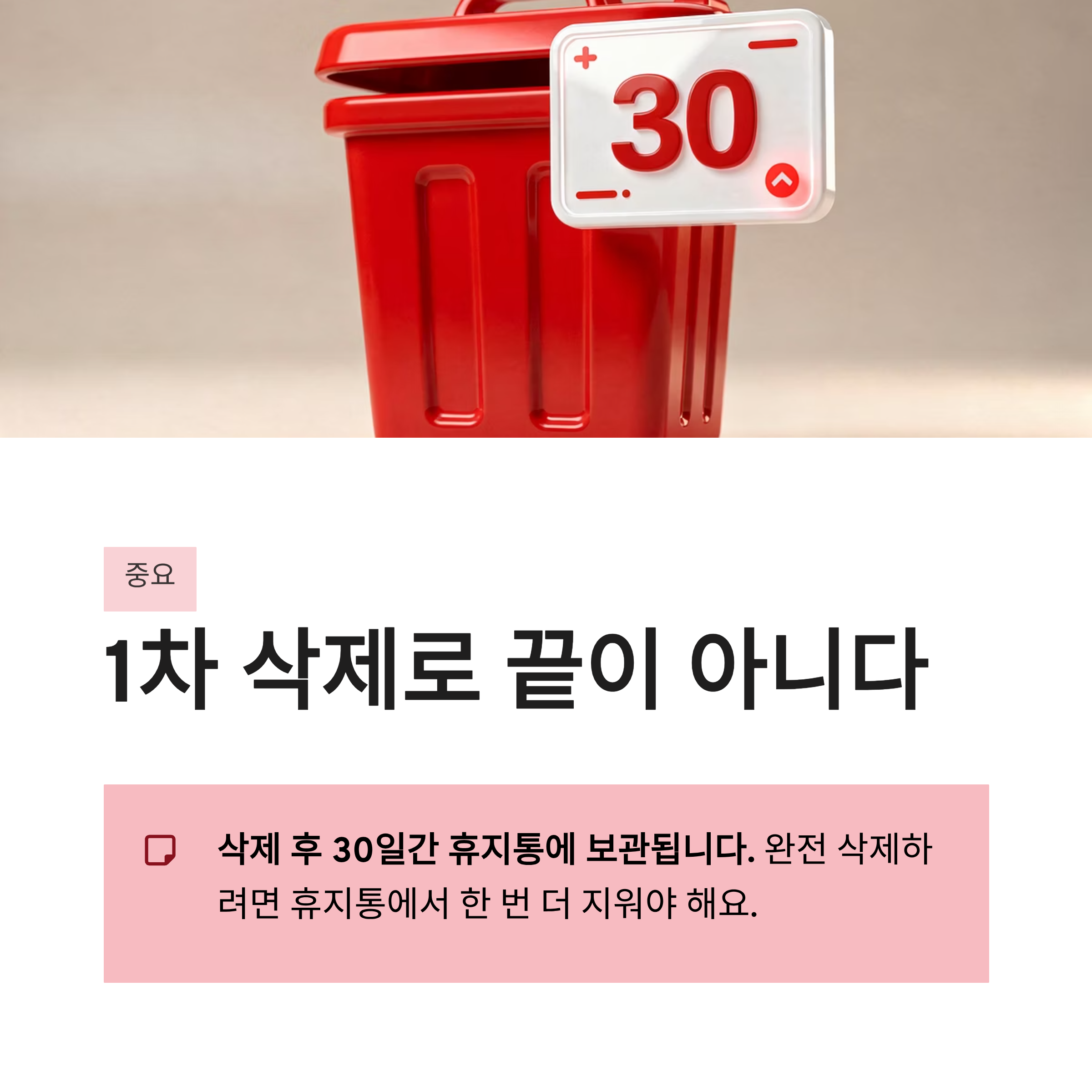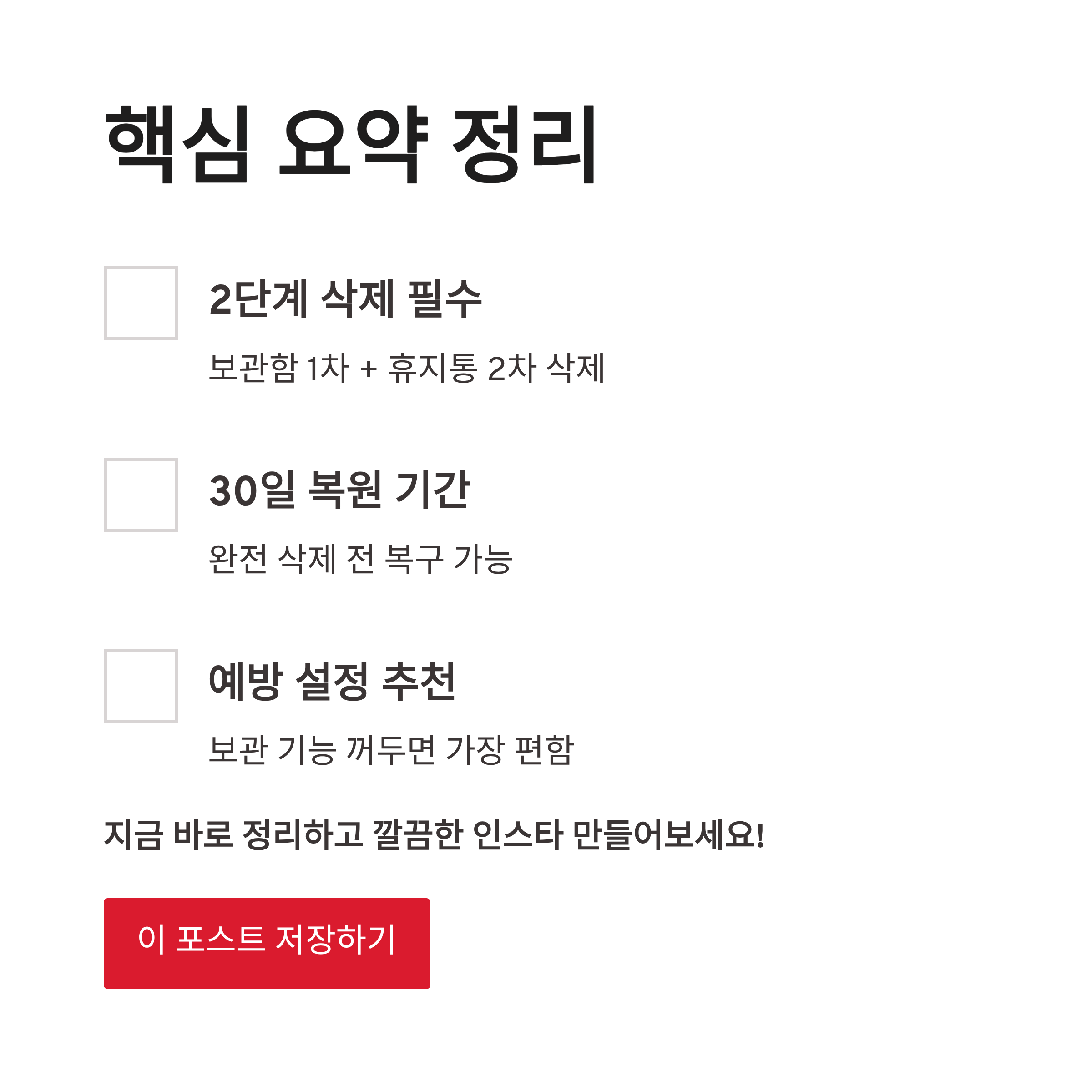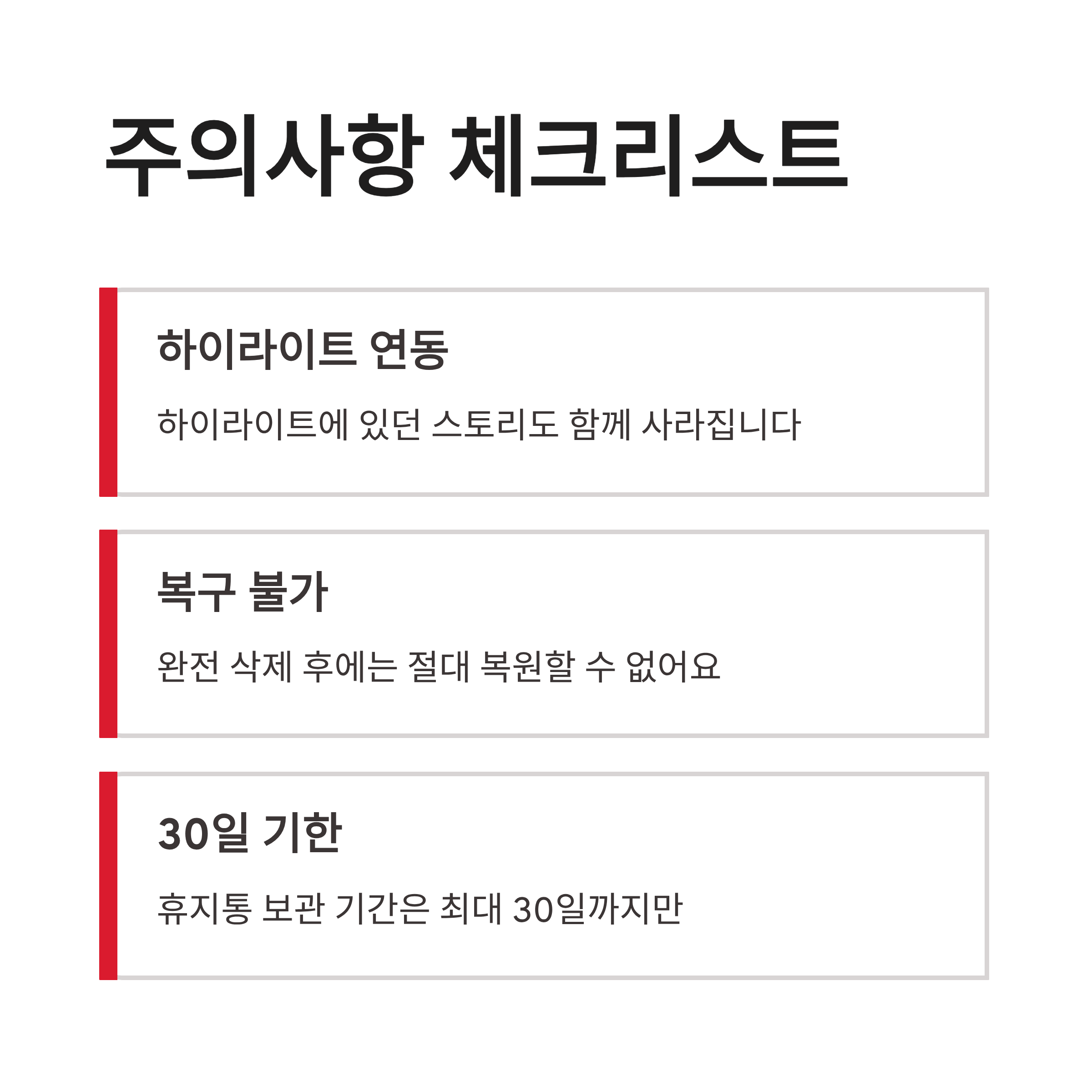 이렇게 삭제하면 보관함에서는 사라지는데요, 여기서 끝이 아니라는 게 포인트입니다. 인스타 보관된 스토리 삭제 후에도 30일 동안은 휴지통에 남아 있어요. 이걸 모르고 “어? 왜 아직 있지?” 하는 분들 많더라구요.