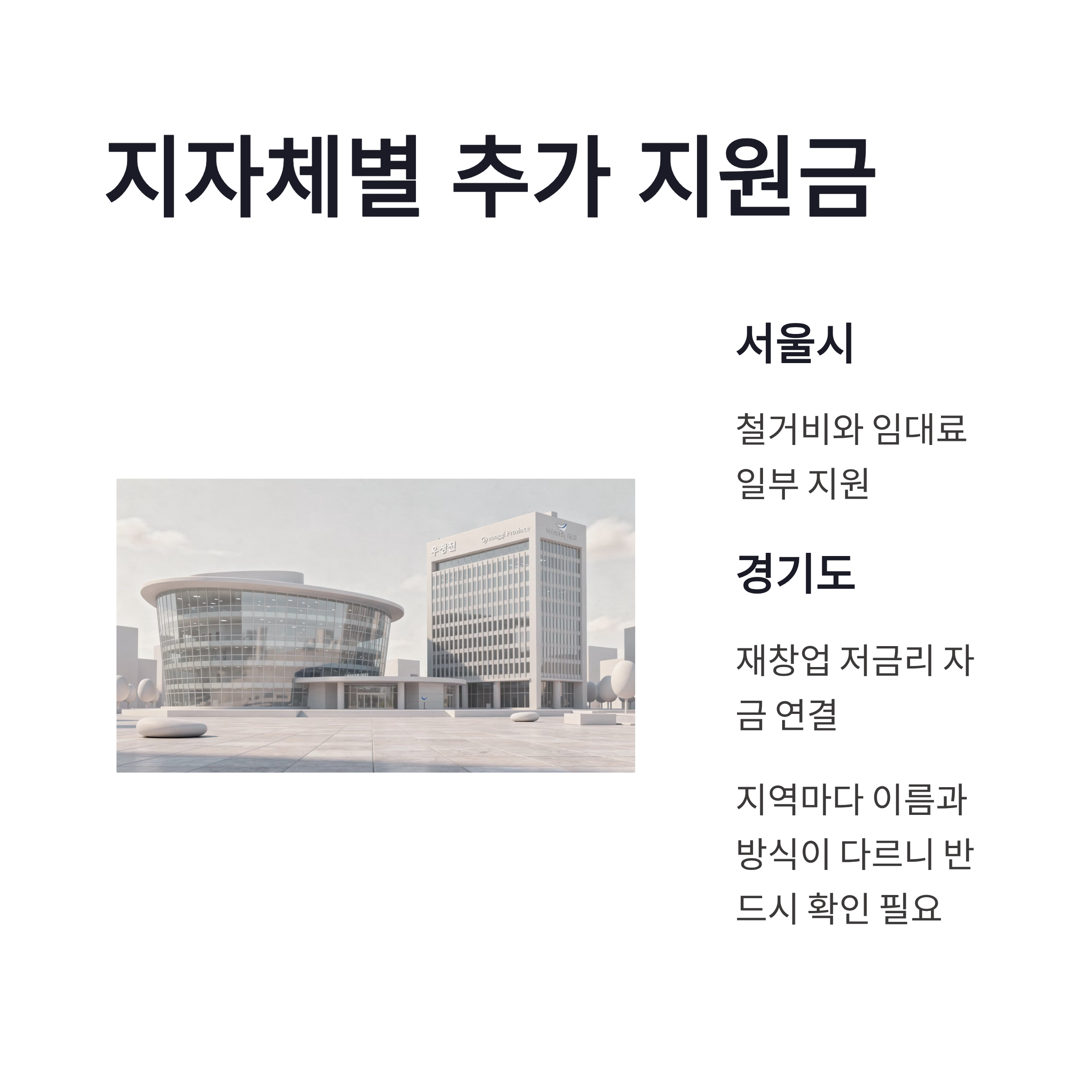 중앙정부 말고도 지자체별 자영업자 폐업 지원금이 따로 있어요. 이게 은근히 쏠쏠합니다. 서울시는 사업정리 지원으로 철거비 + 임대료 일부까지 묶어서 지원하는 경우가 있고, 경기도는 폐업 이후 재창업 저금리 자금을 연결해주는 방식이 많았어요. 지역마다 이름도 다르고 방식도 달라서 꼭 확인이 필요합니다.