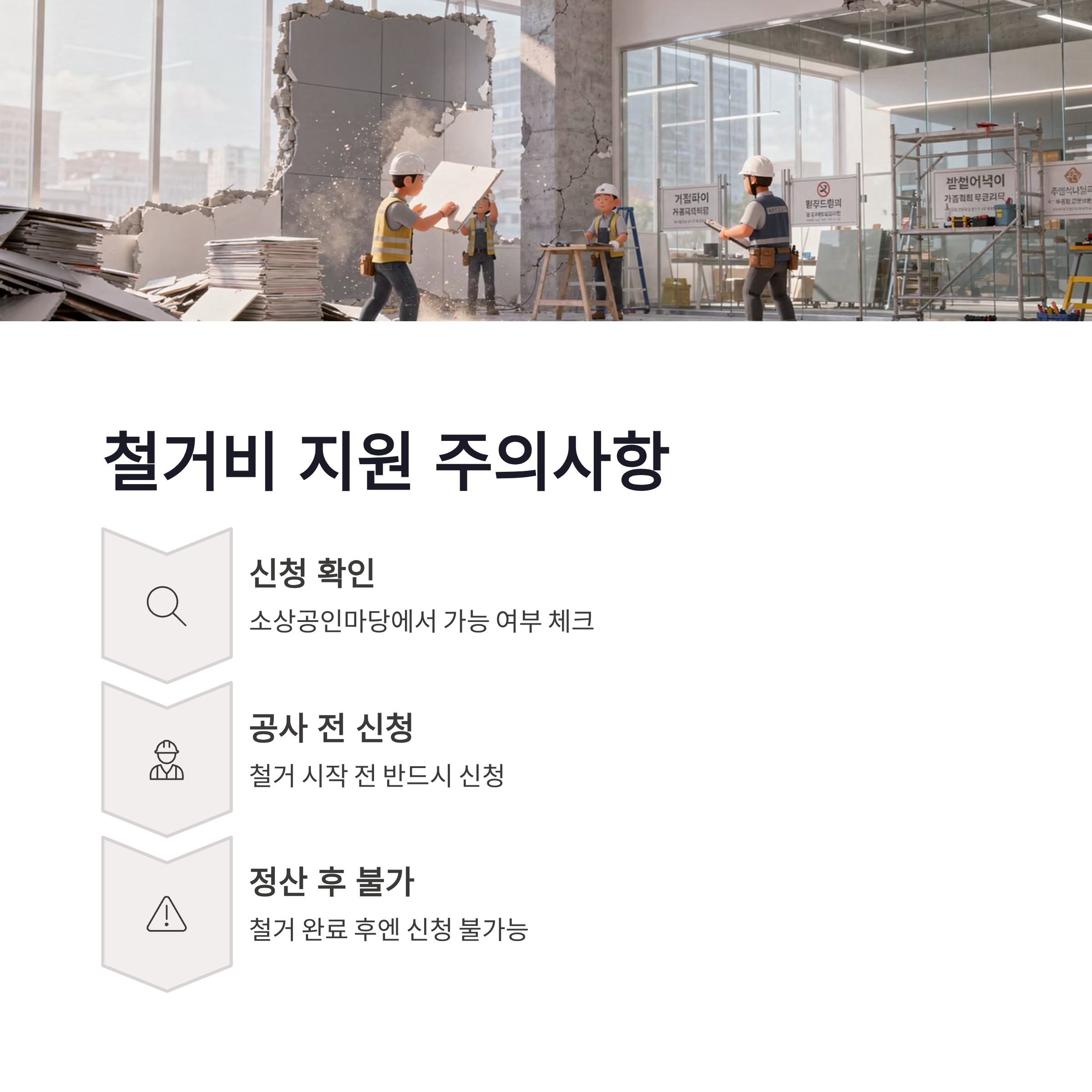 요기서 제일 중요한 포인트 하나. 이미 철거 다 끝내고 정산까지 해버리면 신청 불가인 항목이 많습니다. 무조건 공사 전에 소상공인마당 통해서 신청 가능 여부부터 확인해야 해요. 이거 모르고 날리는 분들 진짜 많더라구요…