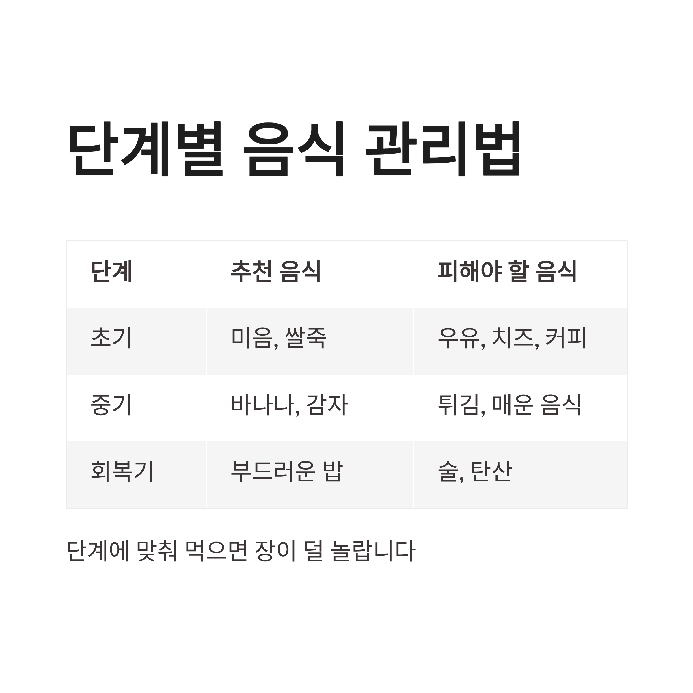 | 단계 | 추천 음식 | 피해야 할 음식 |