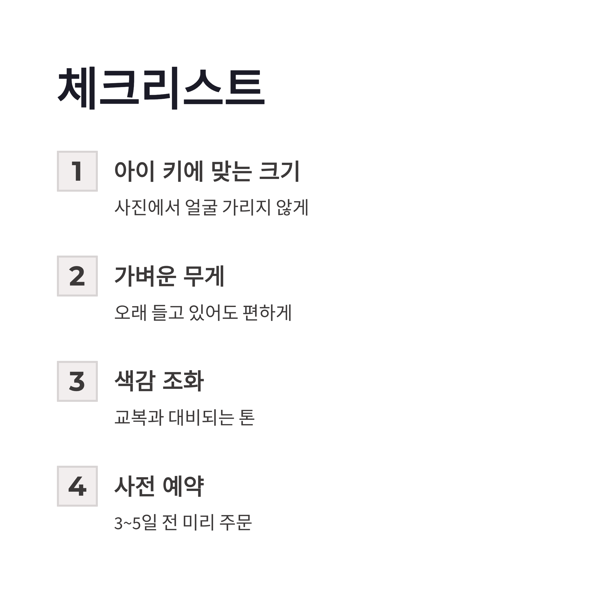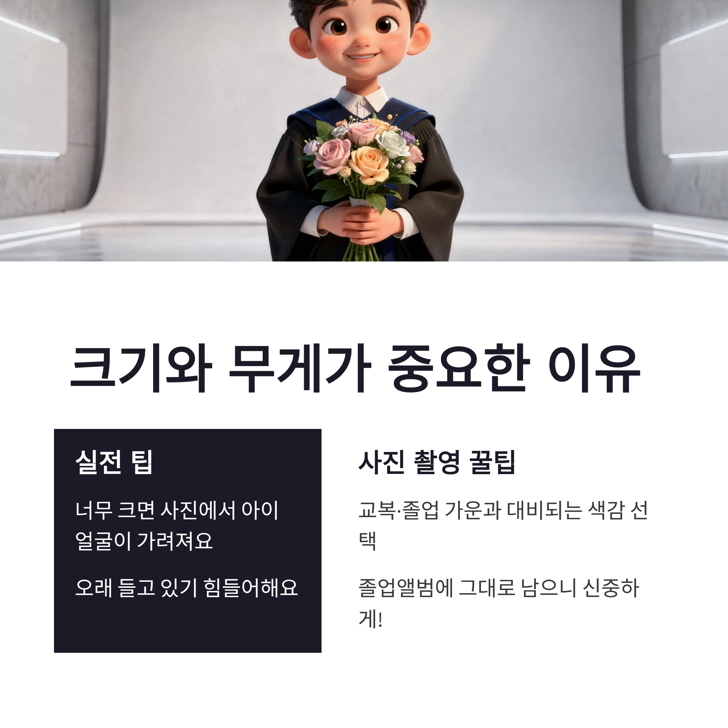 연관 키워드로 많이 찾는 게 ‘어린이집 졸업식 꽃다발’, ‘유치원 졸업식 준비물’인데, 실제로는 아이 체형에 맞는 크기와 가벼움이 제일 중요했슴다.