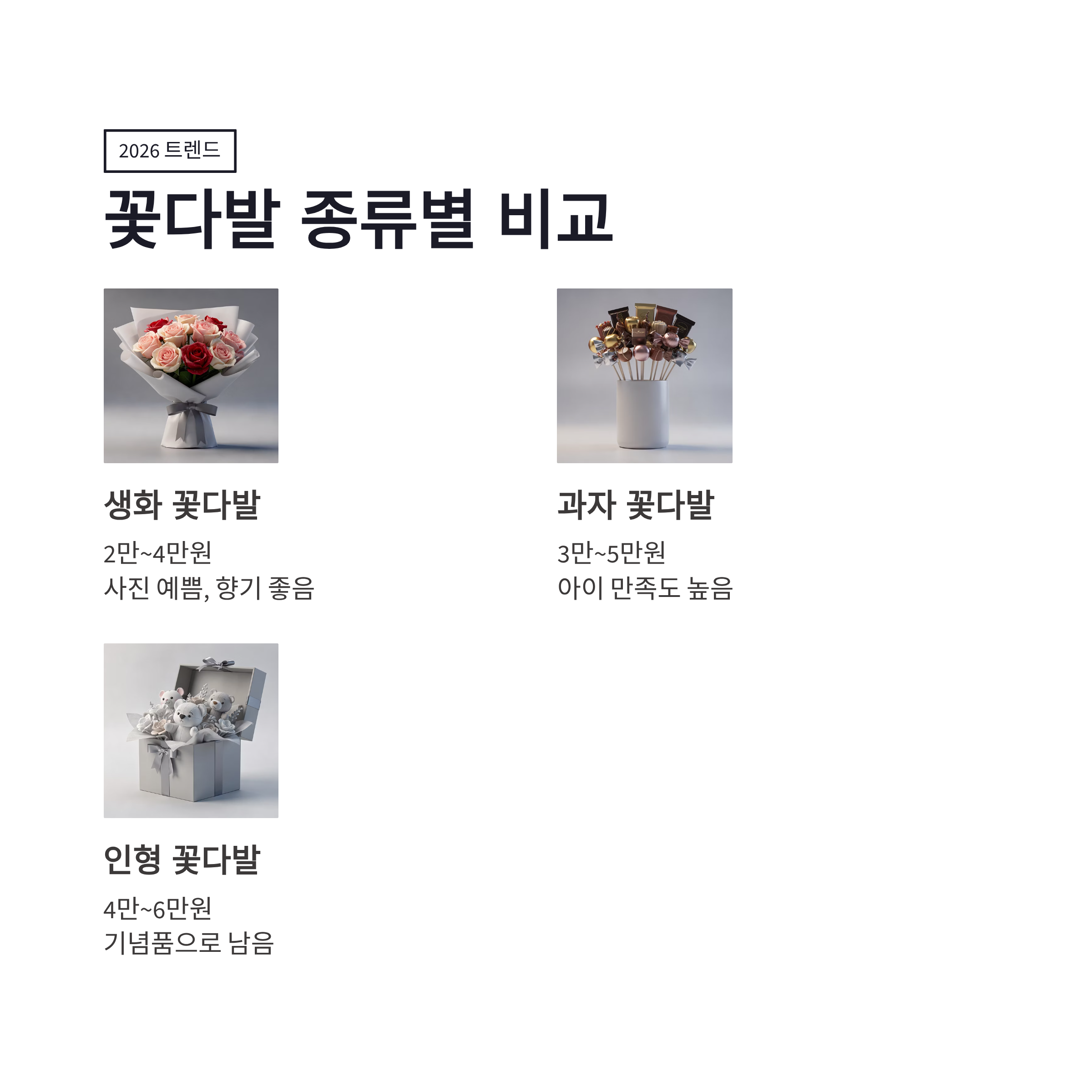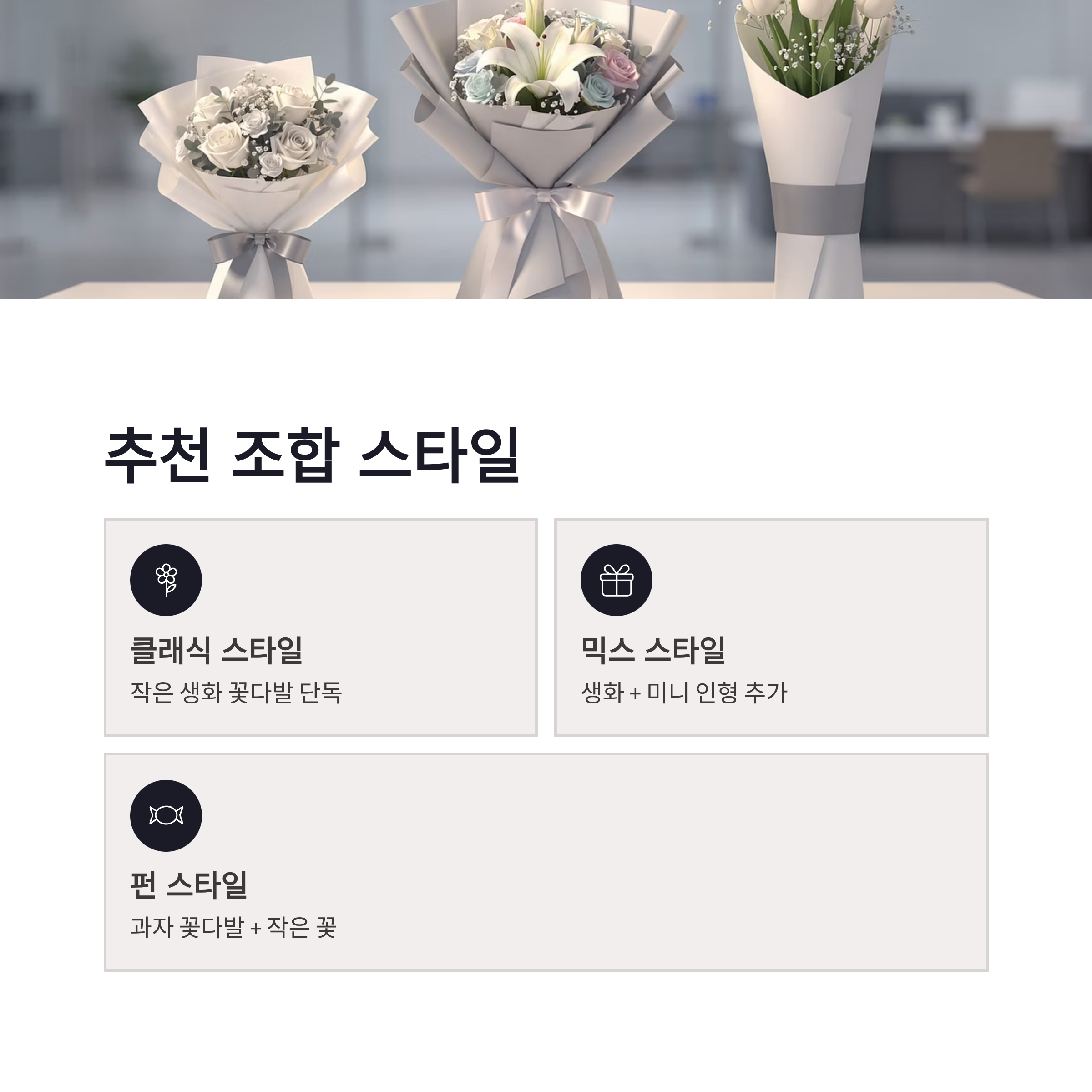| 인형 꽃다발 | 4만~6만원 | 기념품으로 남음 | 가격 부담 |