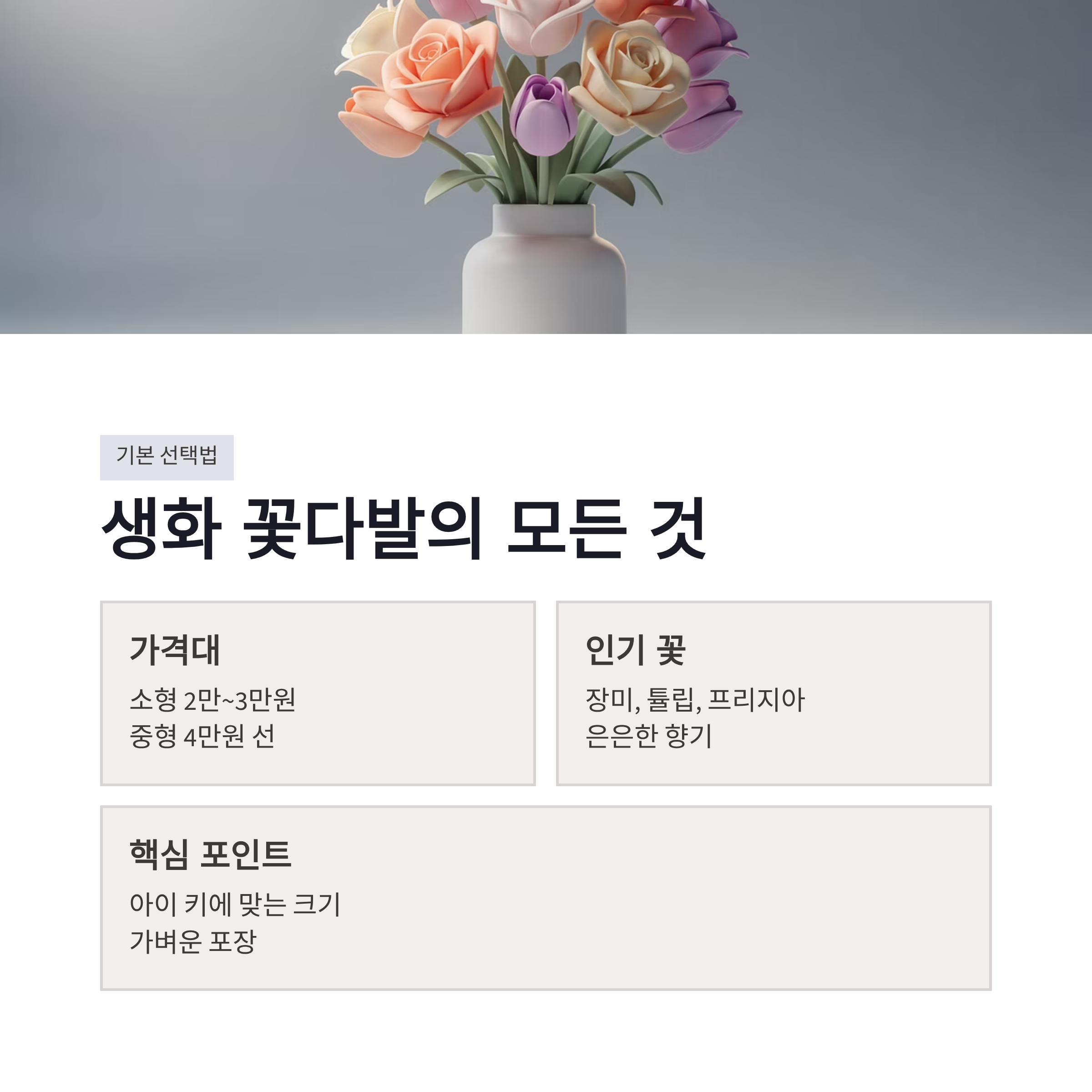 | 생화 꽃다발 | 2만~4만원 | 사진이 예쁨, 향기 좋음 | 시들 수 있음 |