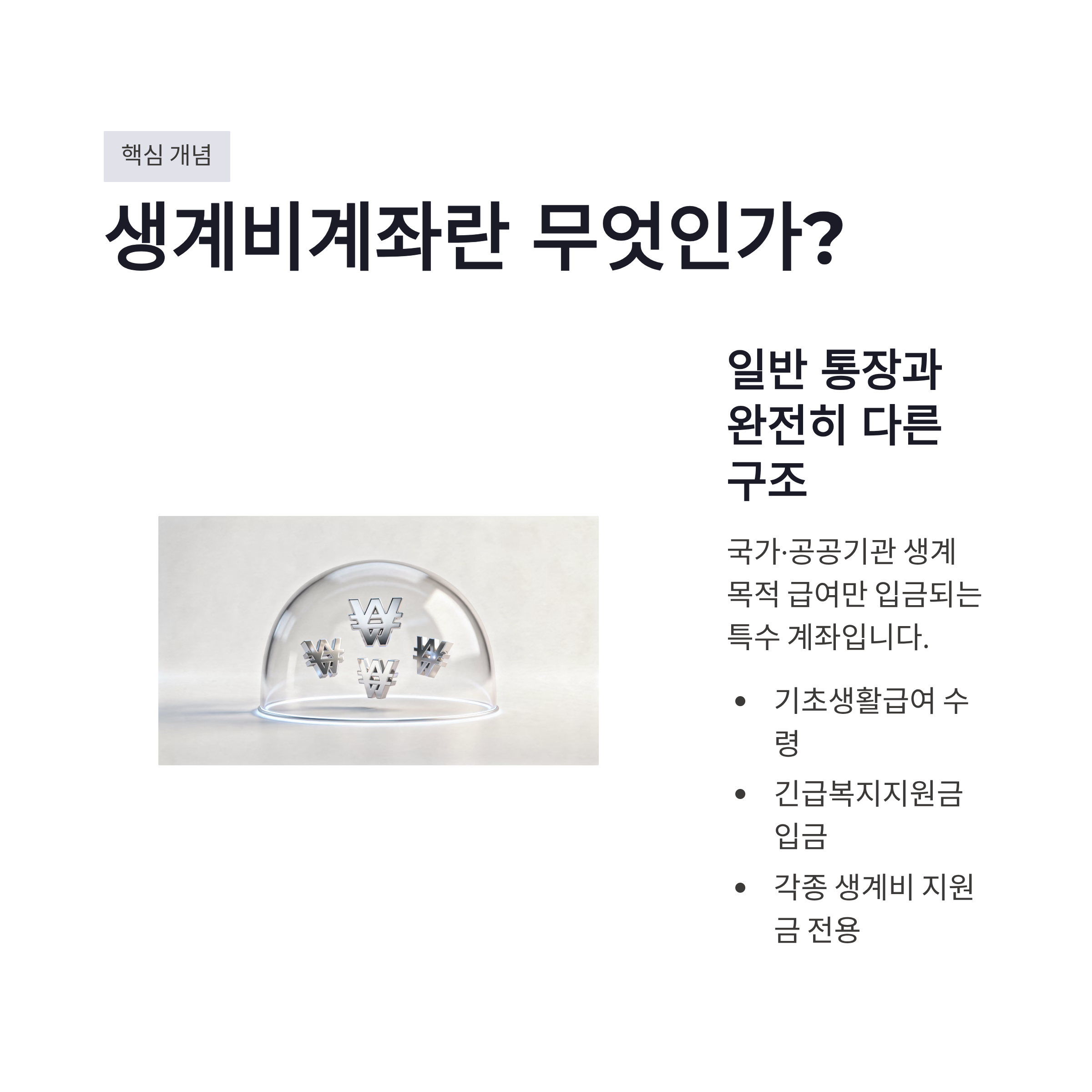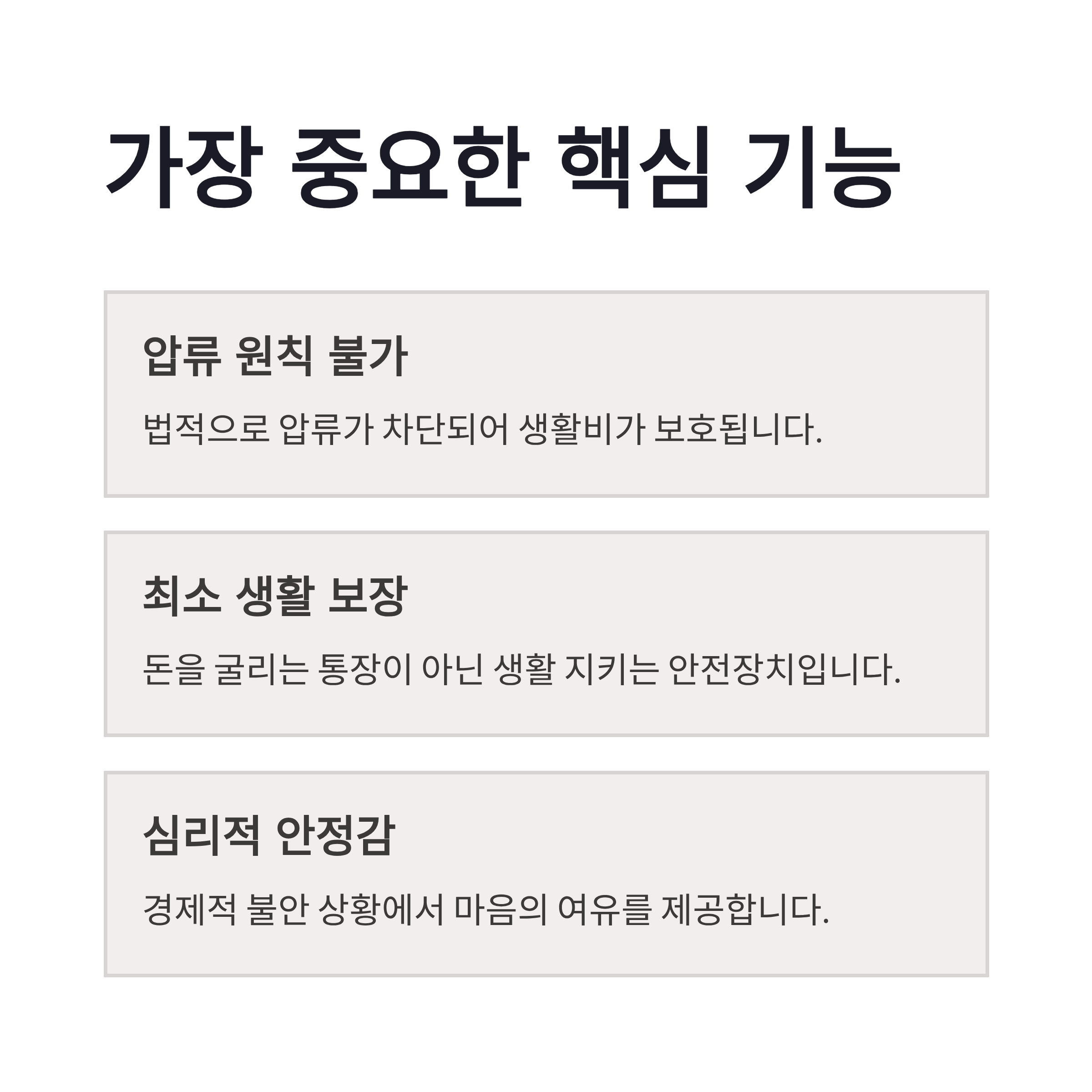 처음엔 저도 “이게 그냥 통장이랑 뭐가 다른데?” 싶었는데요. 카카오뱅크 생계비계좌는 일반 입출금 통장하고 성격이 완전히 다릅니다. 이 계좌는 국가·공공기관에서 지급하는 생계 목적 급여만 입금되도록 설계된 계좌예요. 기초생활급여, 긴급복지지원금, 각종 생계비 지원금 같은 것들이 여기에 들어옵니다. 가장 중요한 포인트는 압류가 원칙적으로 불가하다는 점이구요. 제가 알아보면서 가장 크게 느낀 건, 이 계좌는 “돈을 굴리는 통장”이 아니라 최소한의 생활을 지키는 안전장치 같은 느낌이더라구요. 솔직히 이런 통장 하나쯤은 있어야 마음이 덜 불안해짐니다.