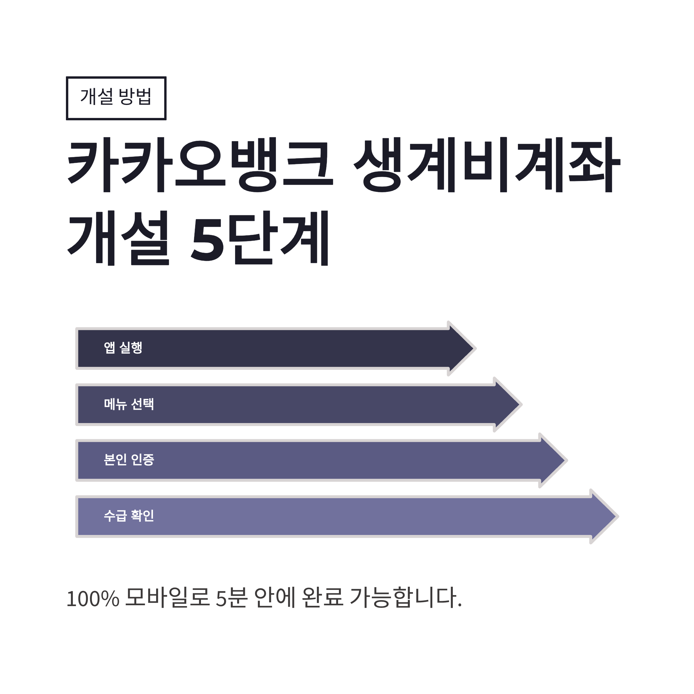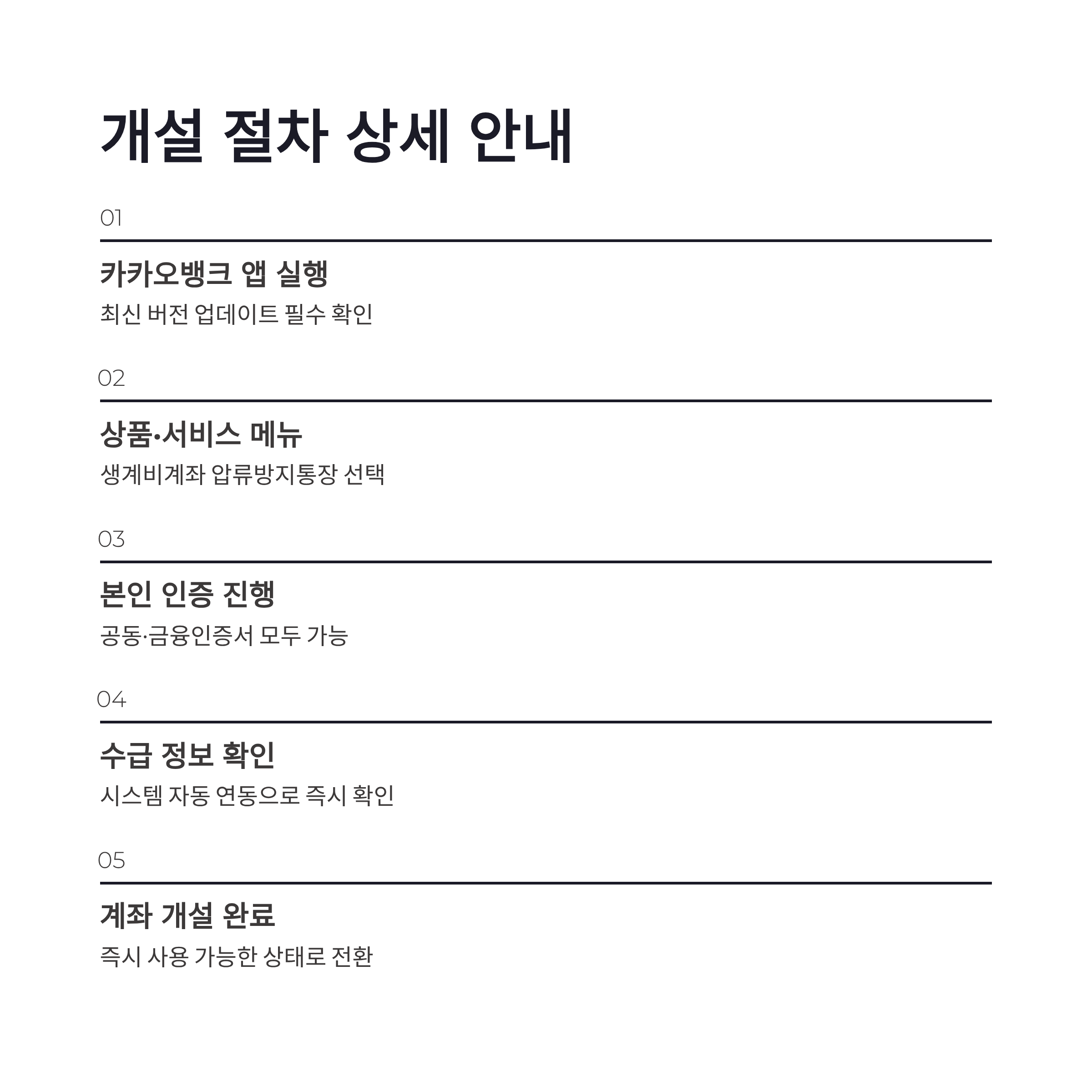 | 단계 | 진행 내용 | 체크 포인트 | | -- | -------------- | ------------- | | 1 | 카카오뱅크 앱 실행 | 최신 버전 업데이트 필수 | | 2 | 상품·서비스 → 생계비계좌 | 압류방지통장 메뉴 선택 | | 3 | 본인 인증 | 공동·금융인증서 가능 | | 4 | 수급 정보 확인 | 자동 연동으로 확인됨 | | 5 | 계좌 개설 완료 | 즉시 사용 가능 |