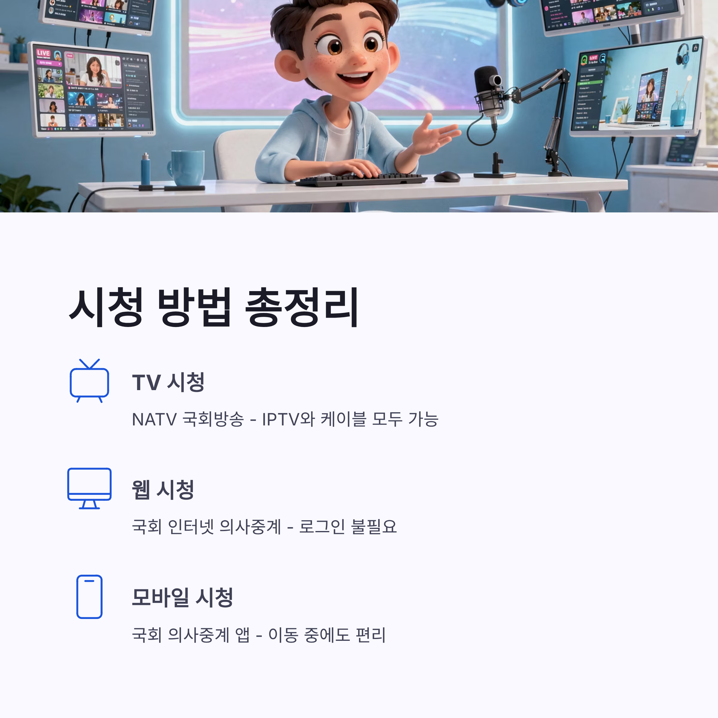 | TV | NATV 국회방송 | IPTV·케이블 모두 가능 |