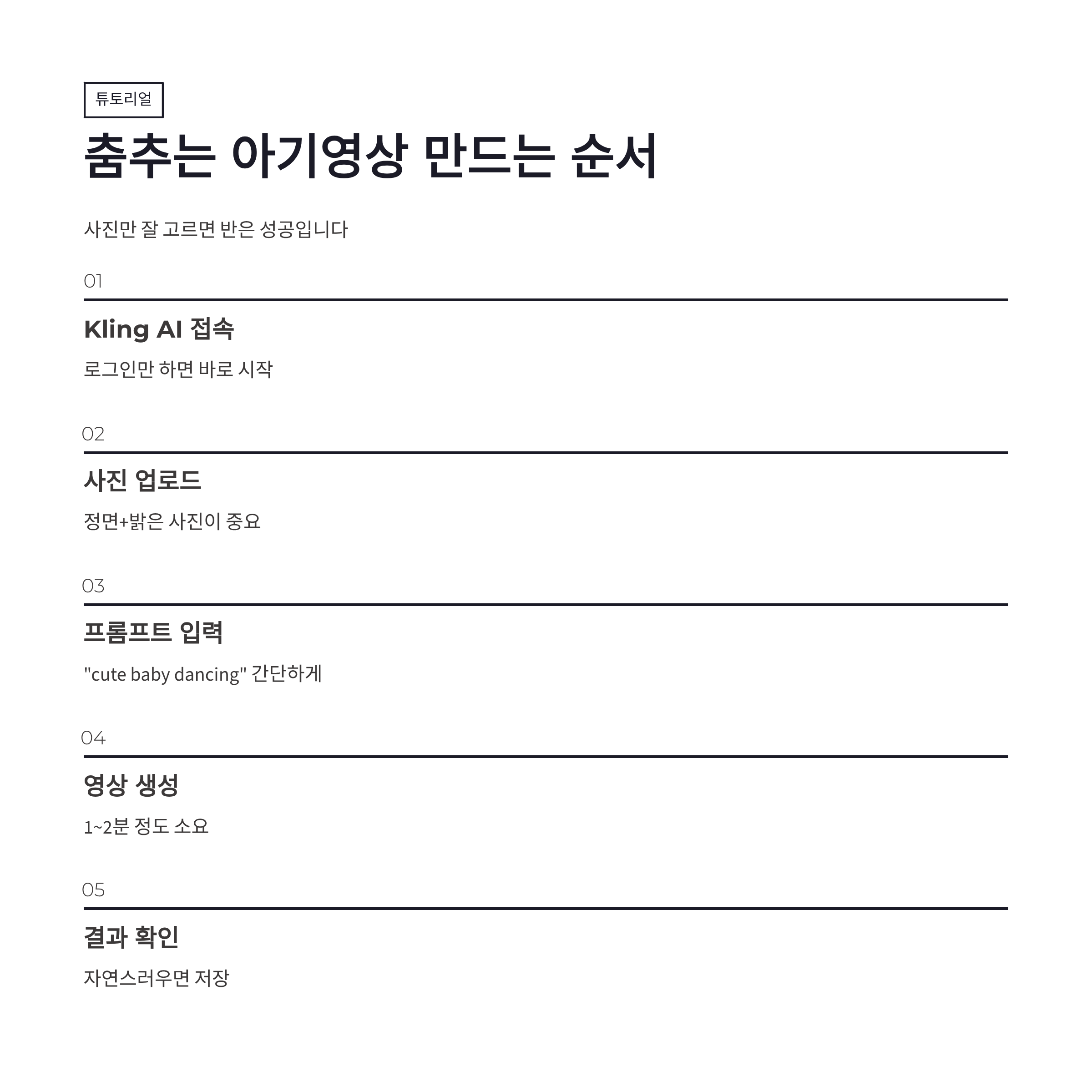 | 단계 | 내용 | 체감 포인트 | | -- | ------------- | ------------------------ | | 1 | Kling AI 접속 | 로그인만 하면 바로 시작 | | 2 | 강아지/아기 사진 업로드 | 정면+밝은 사진이 중요 | | 3 | 프롬프트 입력 | “cute baby dancing” 이런 식 | | 4 | 영상 생성 클릭 | 1~2분 정도 소요 | | 5 | 결과 확인 | 자연스러우면 저장 ㄱㄱ |