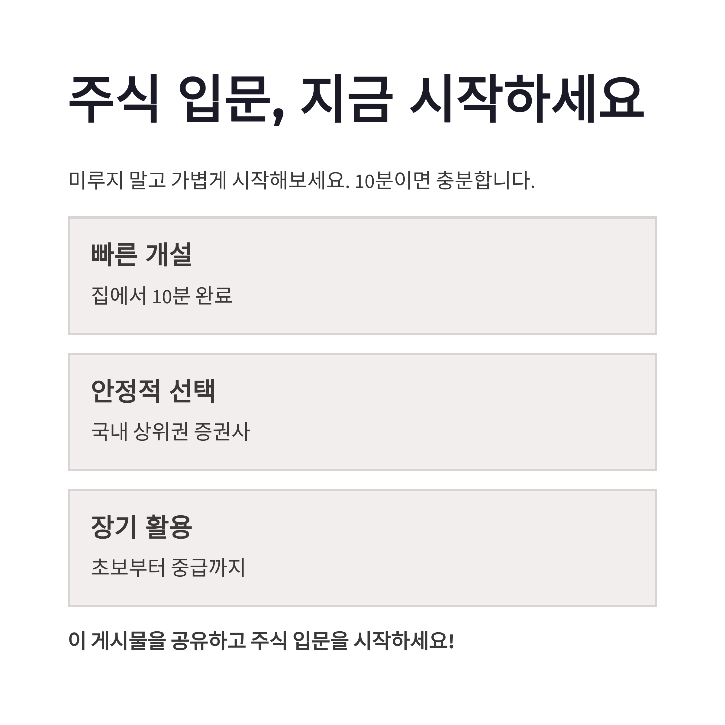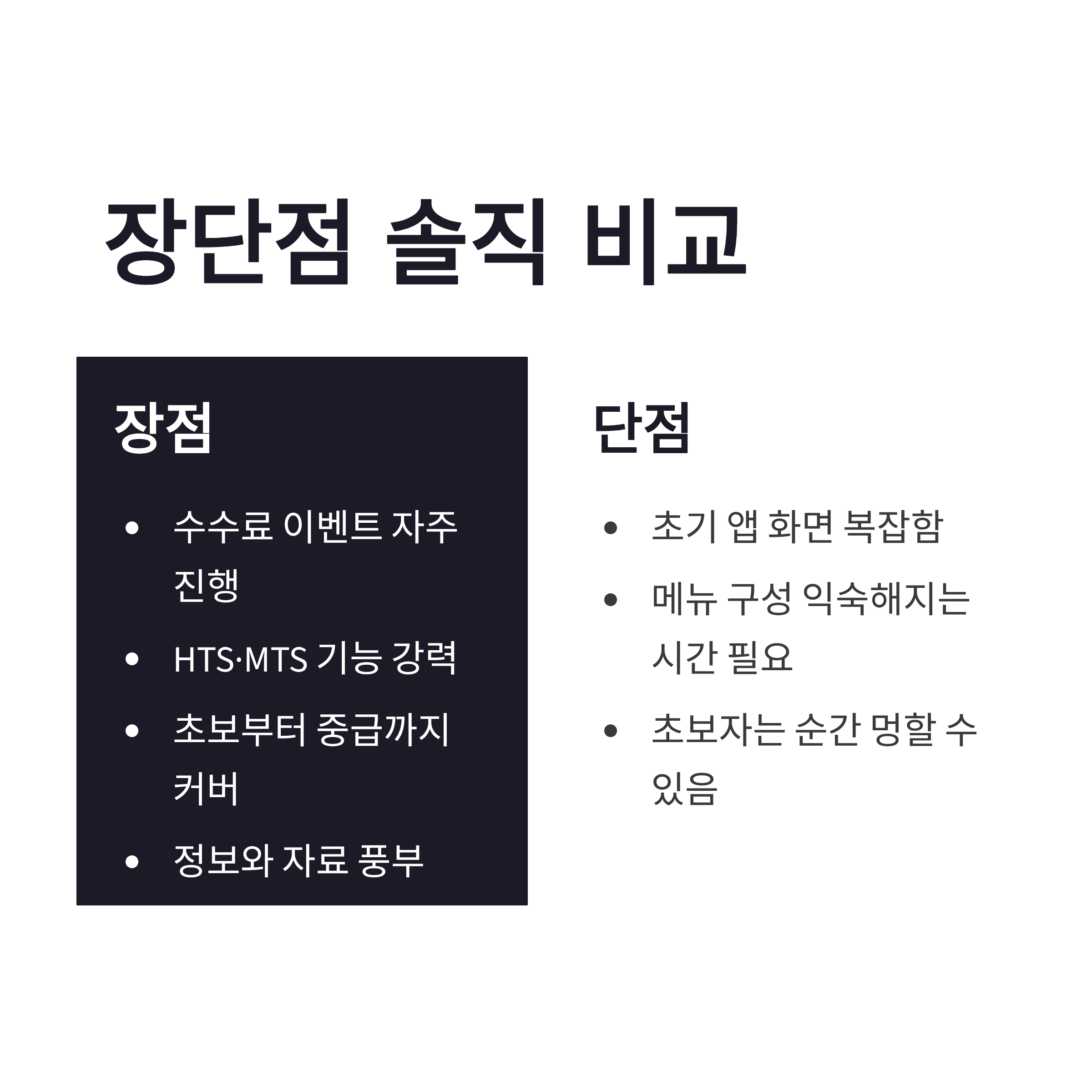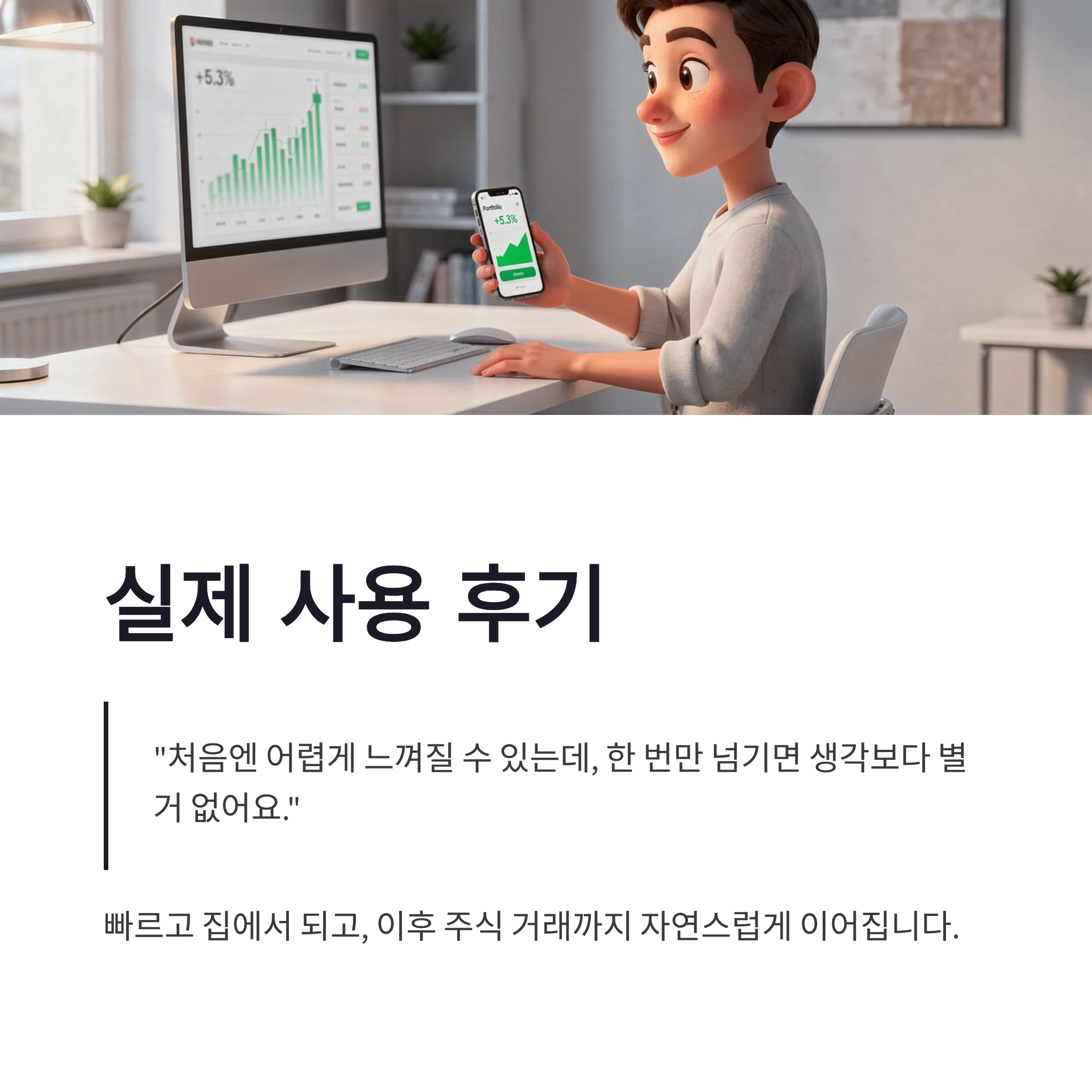 장점은 일단 수수료 이벤트가 자주 있음, 그리고 HTS·MTS 기능이 워낙 세서 나중에 주식 익숙해져도 계속 쓰게 돼요. 단점이라면… 처음 앱 화면이 살짝 복잡하다는 점? 초보자는 메뉴가 많아서 순간 멍해질 수 있음다 ㅎㅎ 그래도 장기적으로 보면 키움증권 비대면 계좌개설은 초보→중급 넘어갈 때까지 충분히 커버되는 느낌이었어요.