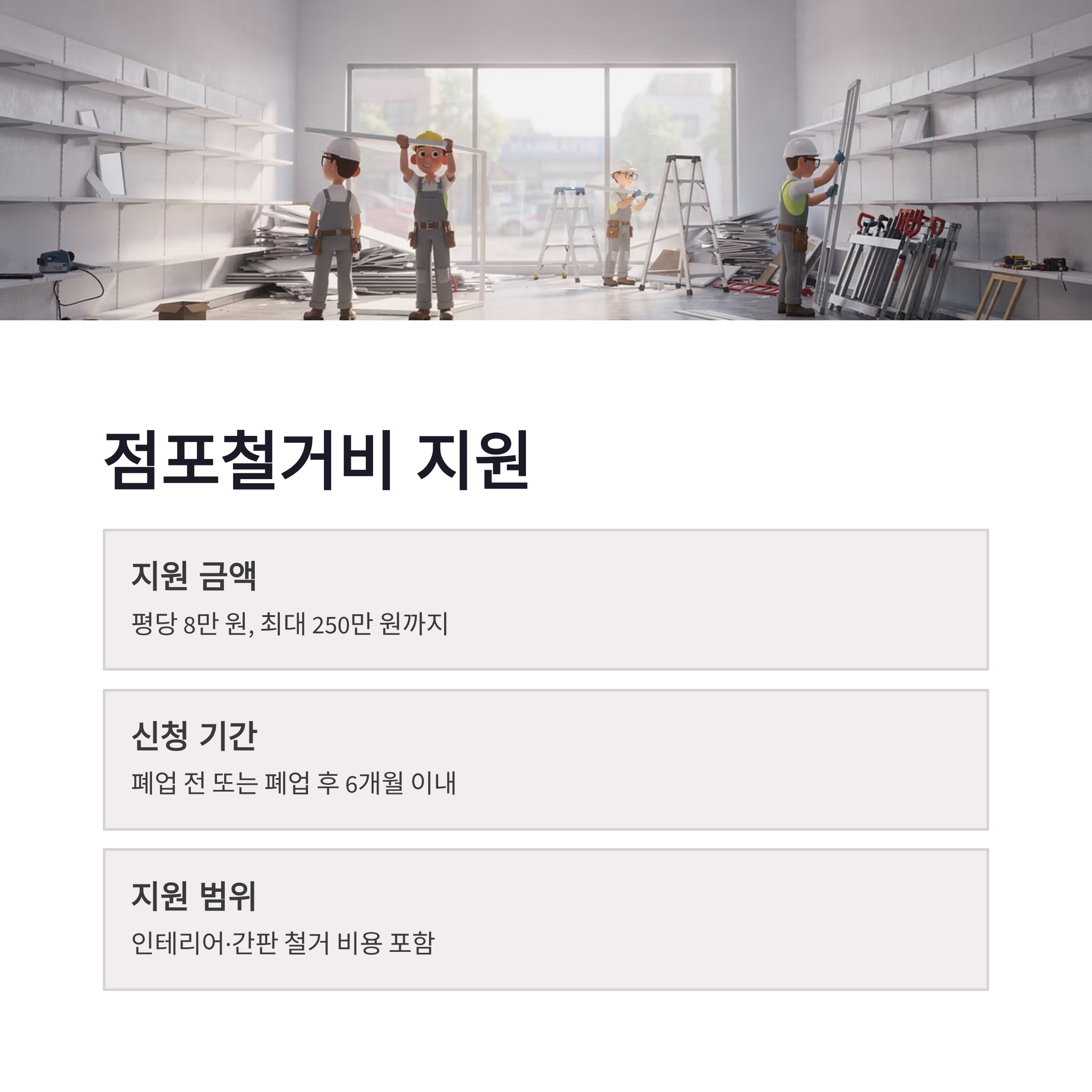 | 점포철거비 | 평당 8만 원, 최대 250만 원 | 부가세 제외 |
