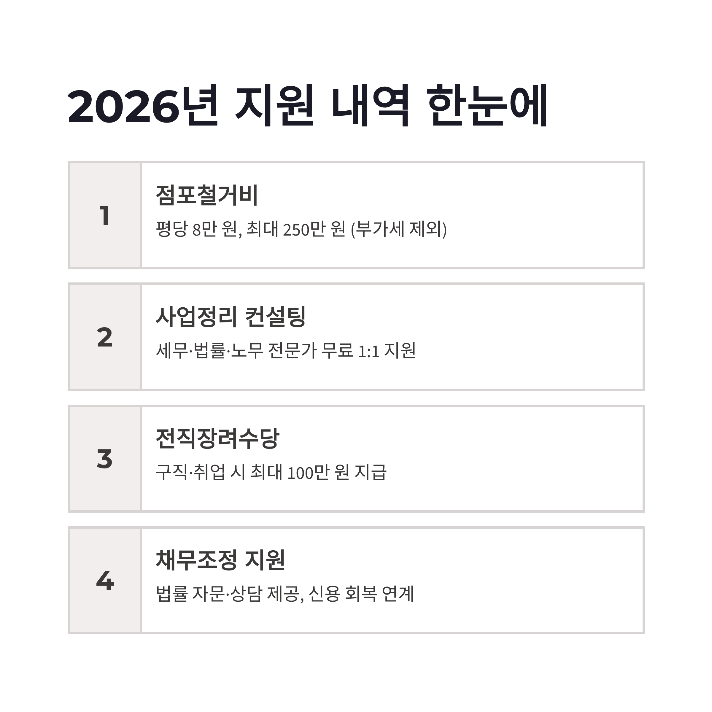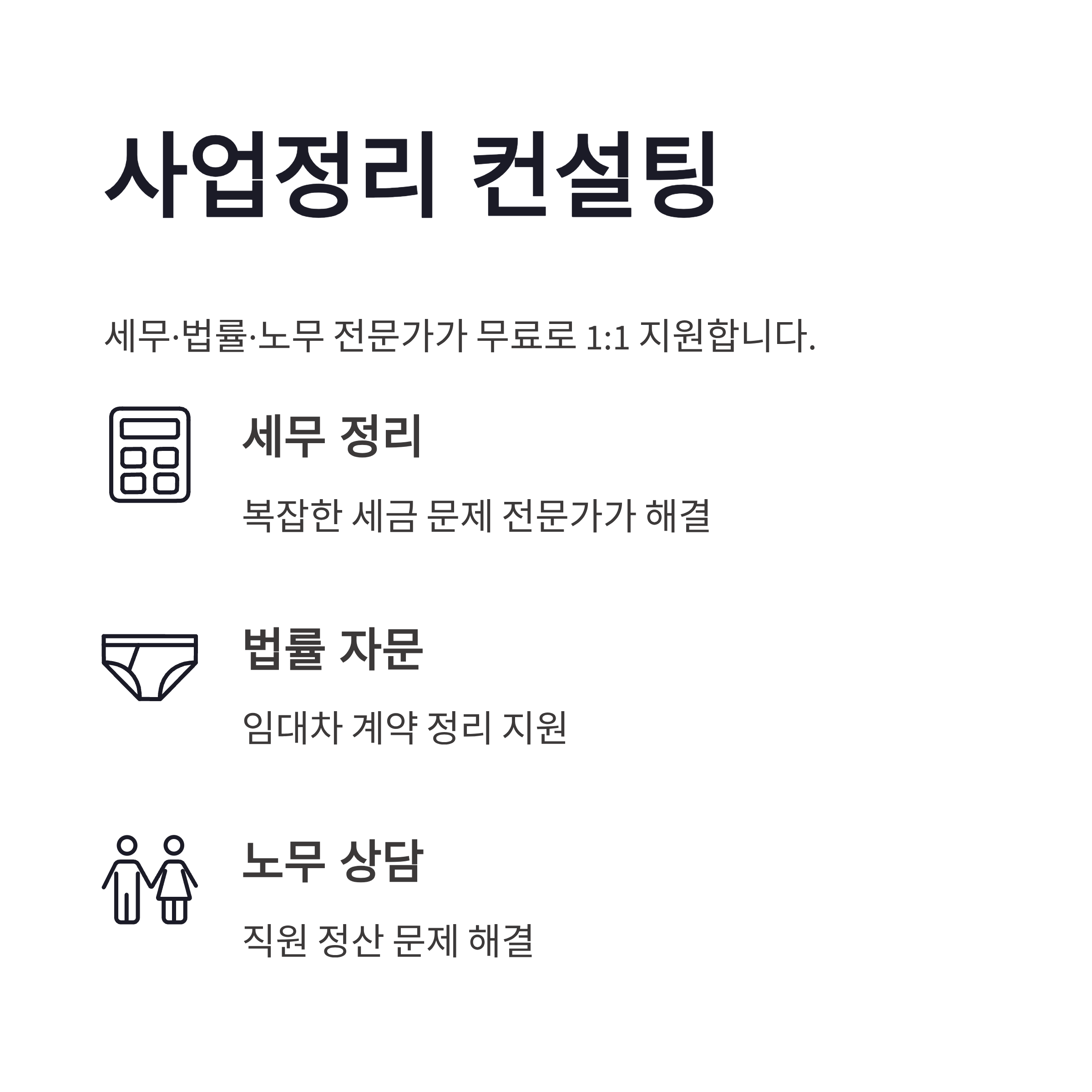 | 사업정리 컨설팅 | 세무·법률·노무 무료 지원 | 전문가 1:1 |
