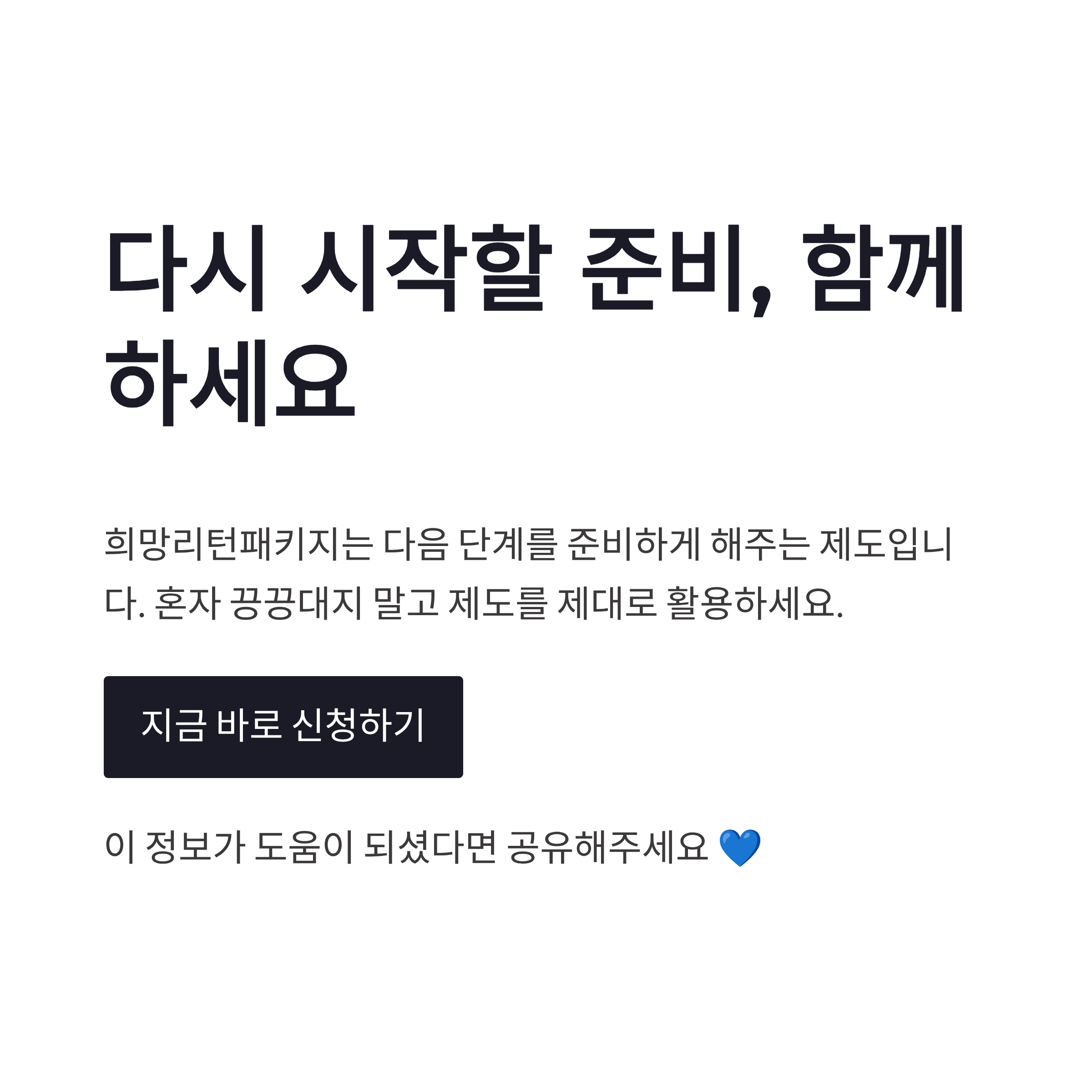 취업 준비하거나 실제로 취업하면 최대 100만 원, 금액 자체보다 “나 혼자 아니다”라는 느낌이 꽤 컸습니다. 희망리턴패키지가 단순 지원금이 아니라 흐름을 만들어주는 구조 같았어요.
