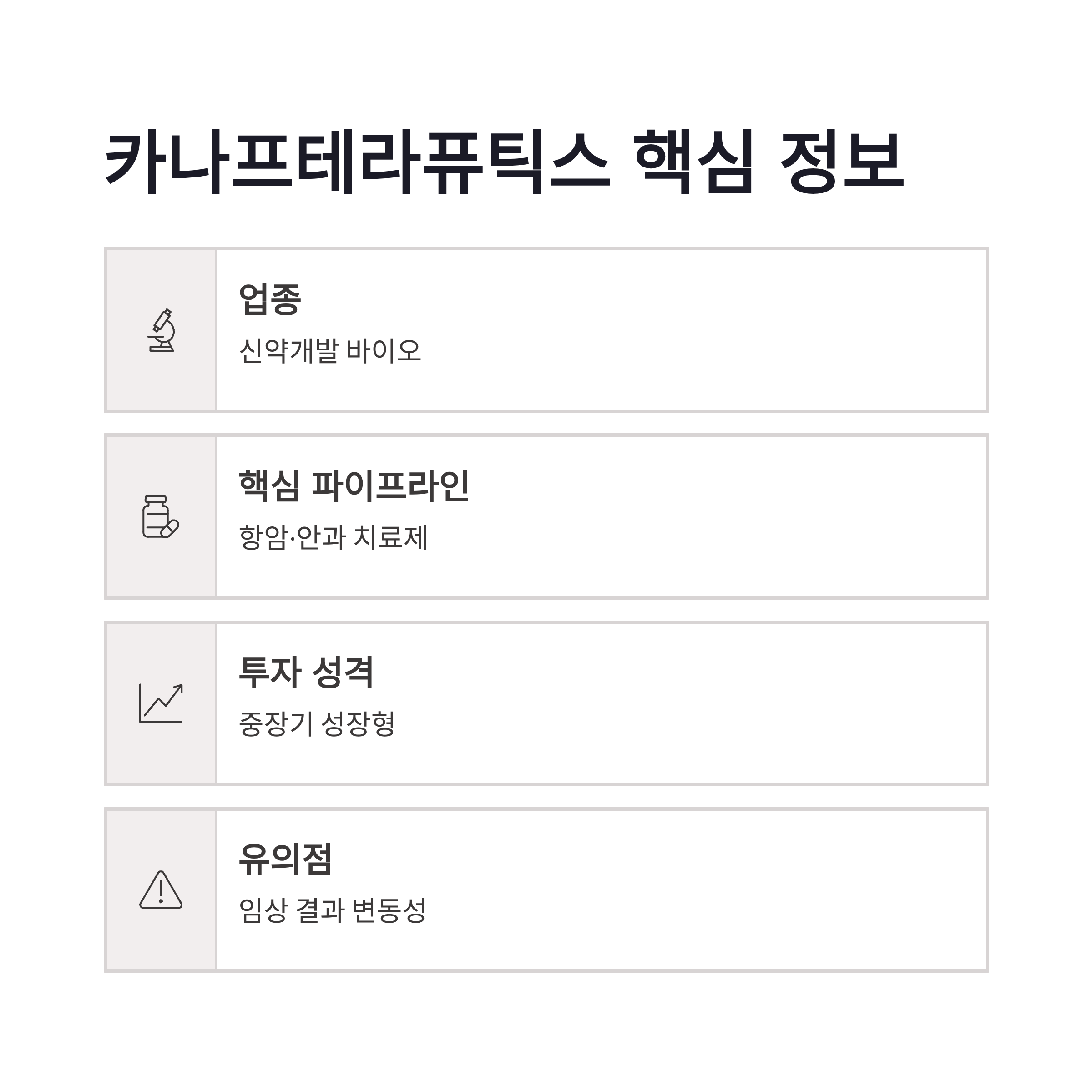 카나프테라퓨틱스는 2019년 설립된 신약 개발 바이오 기업입니다. 항암제랑 안과 질환 치료제 쪽 파이프라인이 핵심이구요. 요즘 바이오 공모주 볼 때 다들 제일 먼저 보는 게 임상 단계랑 기술이전 가능성이잖아요. 저도 자료 보면서 느낀 건, 단기 실적보단 중장기 스토리형 공모주라는 점이었어요. 솔직히 이런 종목은 상장 직후 변동성은 각오해야 합니다 ㅠㅠ 그래도 2026년 공모주 시장에서 신약개발 테마는 여전히 살아 있는 편이라 관심은 꽤 쏠리는 분위기였어요.