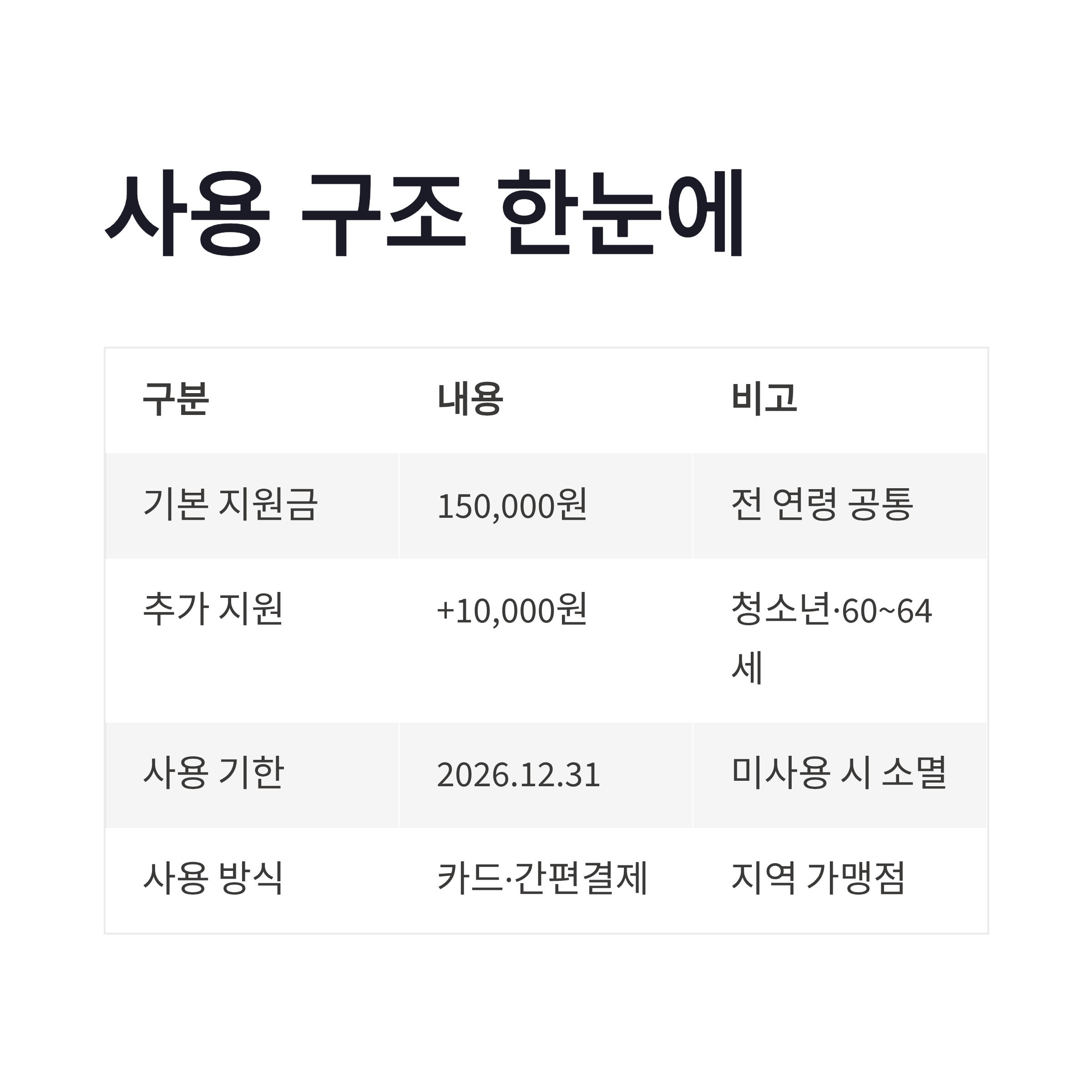| 사용 방식 | 카드·간편결제 | 지역 가맹점 |