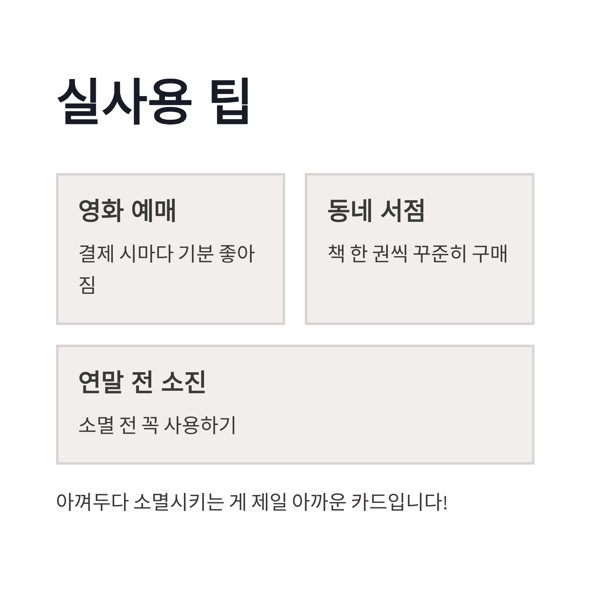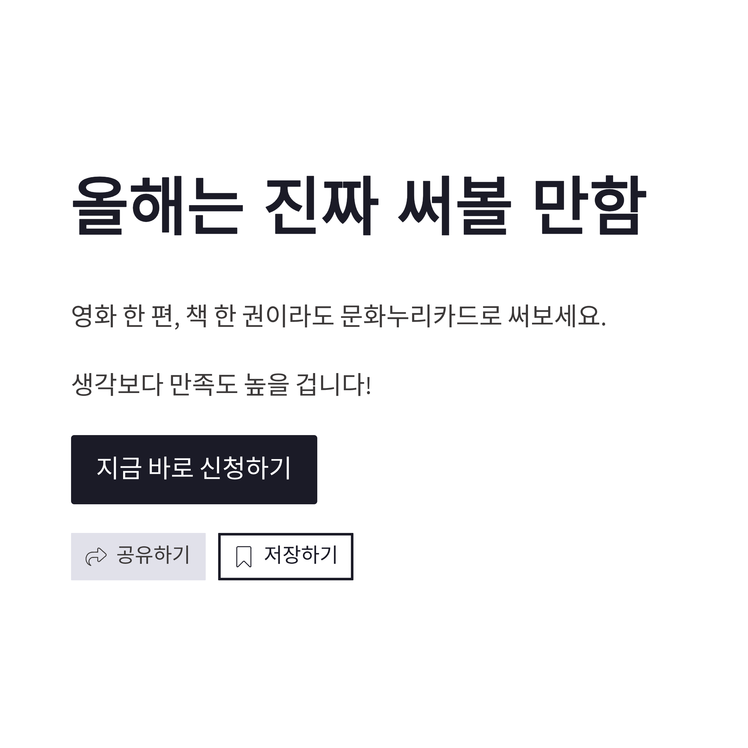 정리해보면 2026년 문화누리카드는 지원금, 편의성, 사용처까지 전반적으로 좋아졌습니다. 자동 재충전 여부만 한 번 확인해두고, 연말 전에만 잘 쓰면 손해 볼 일은 없겠더라구요. 괜히 아껴두다 소멸시키는 게 제일 아까운 카드라서요. 올해는 영화 한 편, 책 한 권이라도 문화누리카드로 써보는 거… 생각보다 만족도 높을지도 모르겠쥬? ㅎㅎ