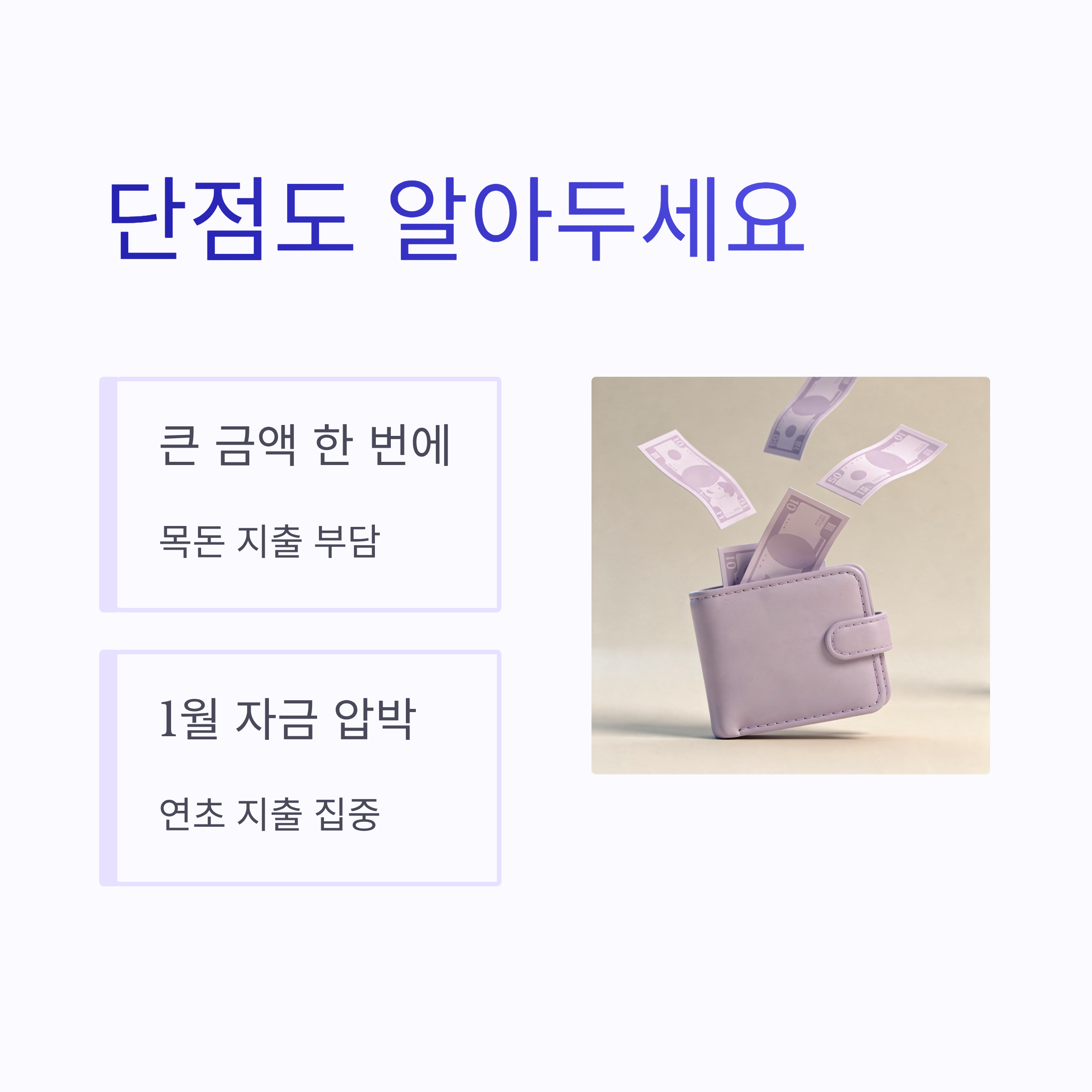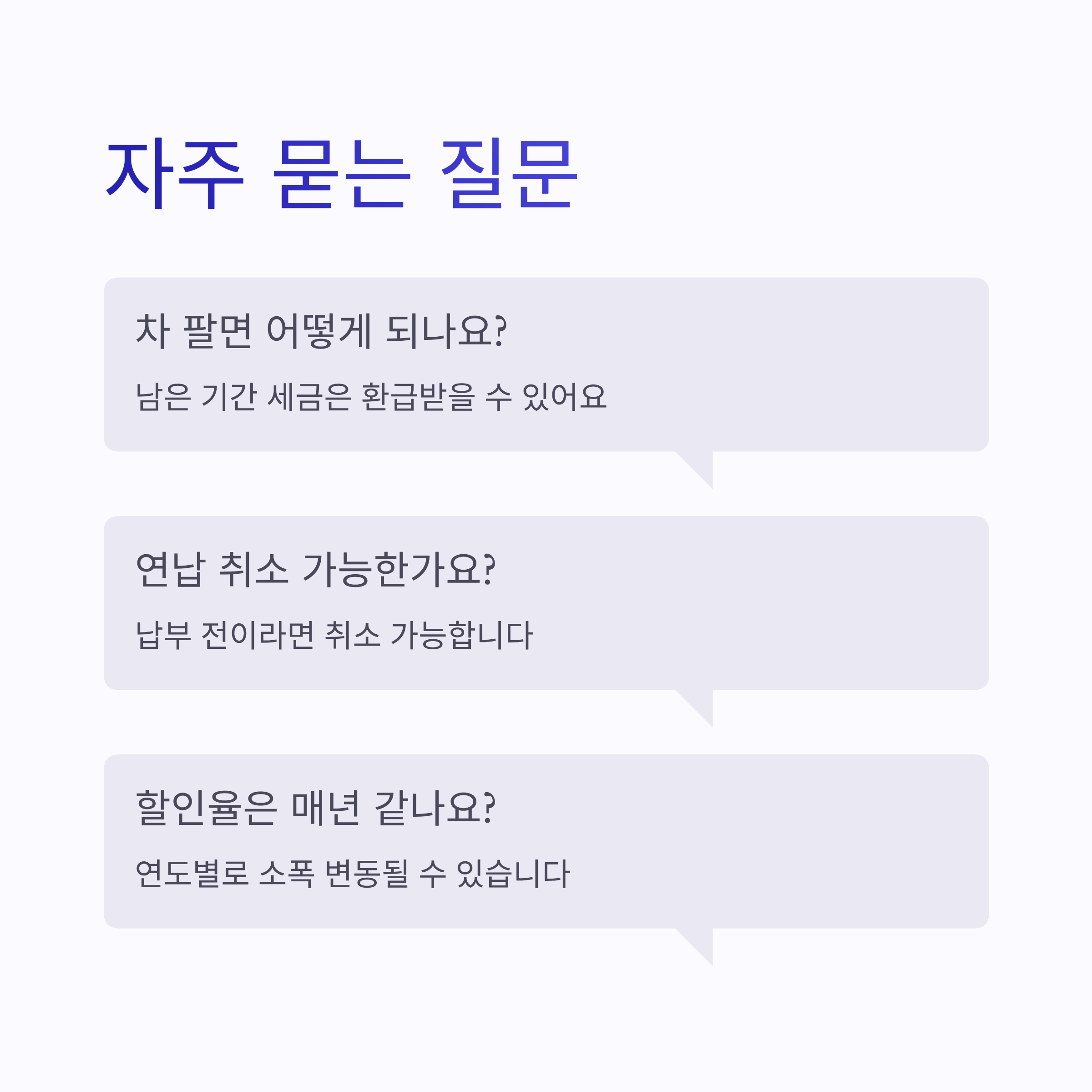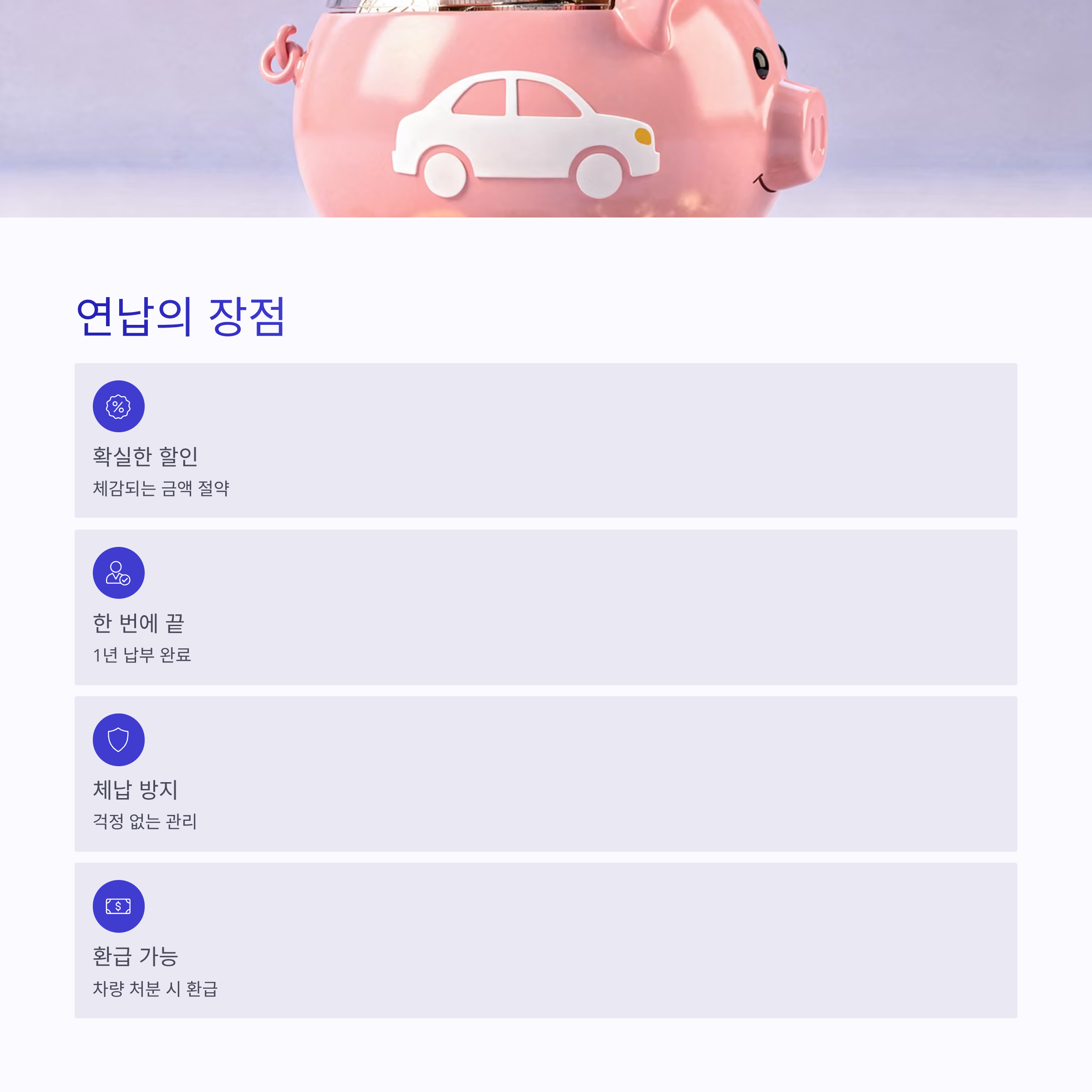 * 할인 확실함, 체감됨 * 납부 한 번으로 1년 끝 * 체납 걱정 없음 * 차량 처분 시 환급 가능