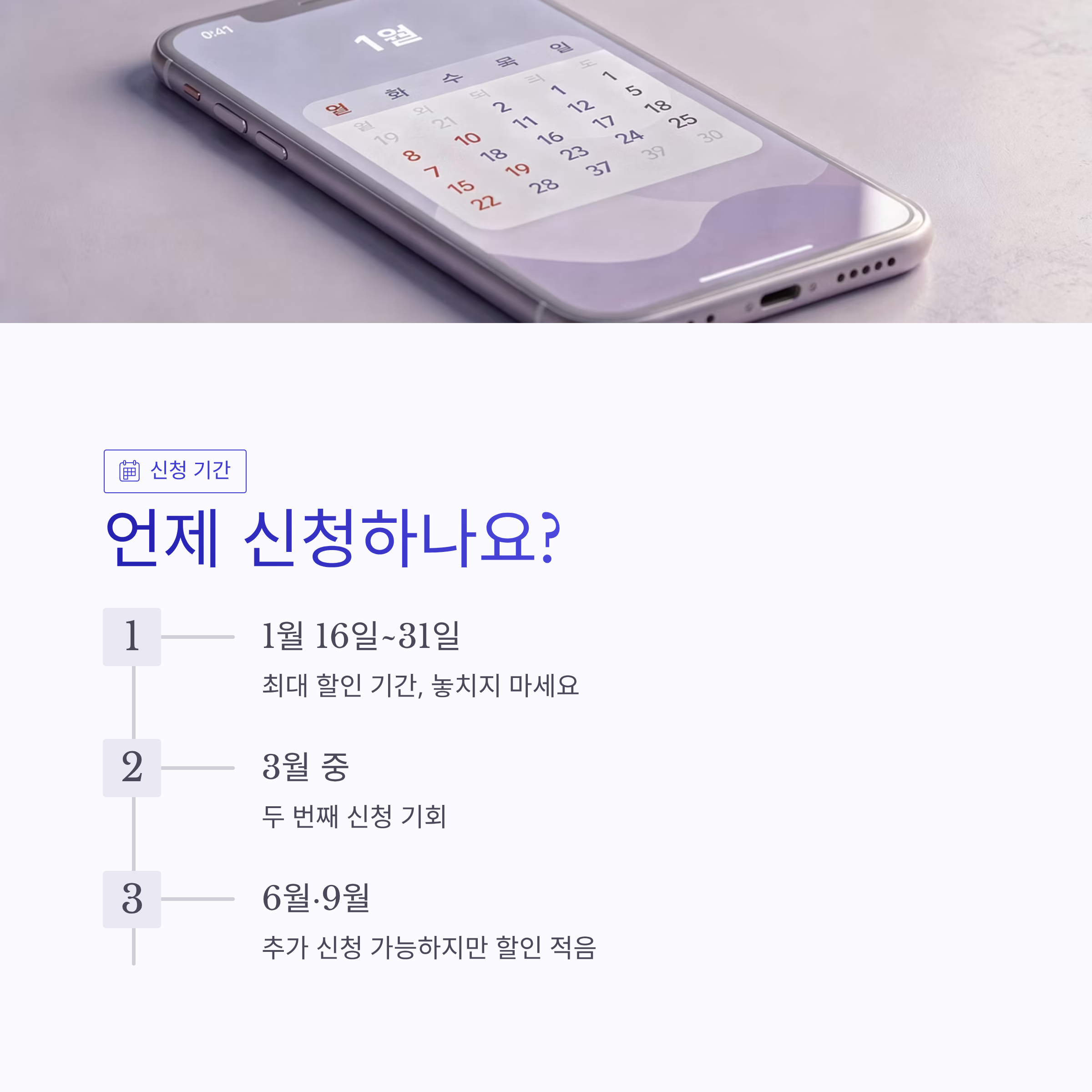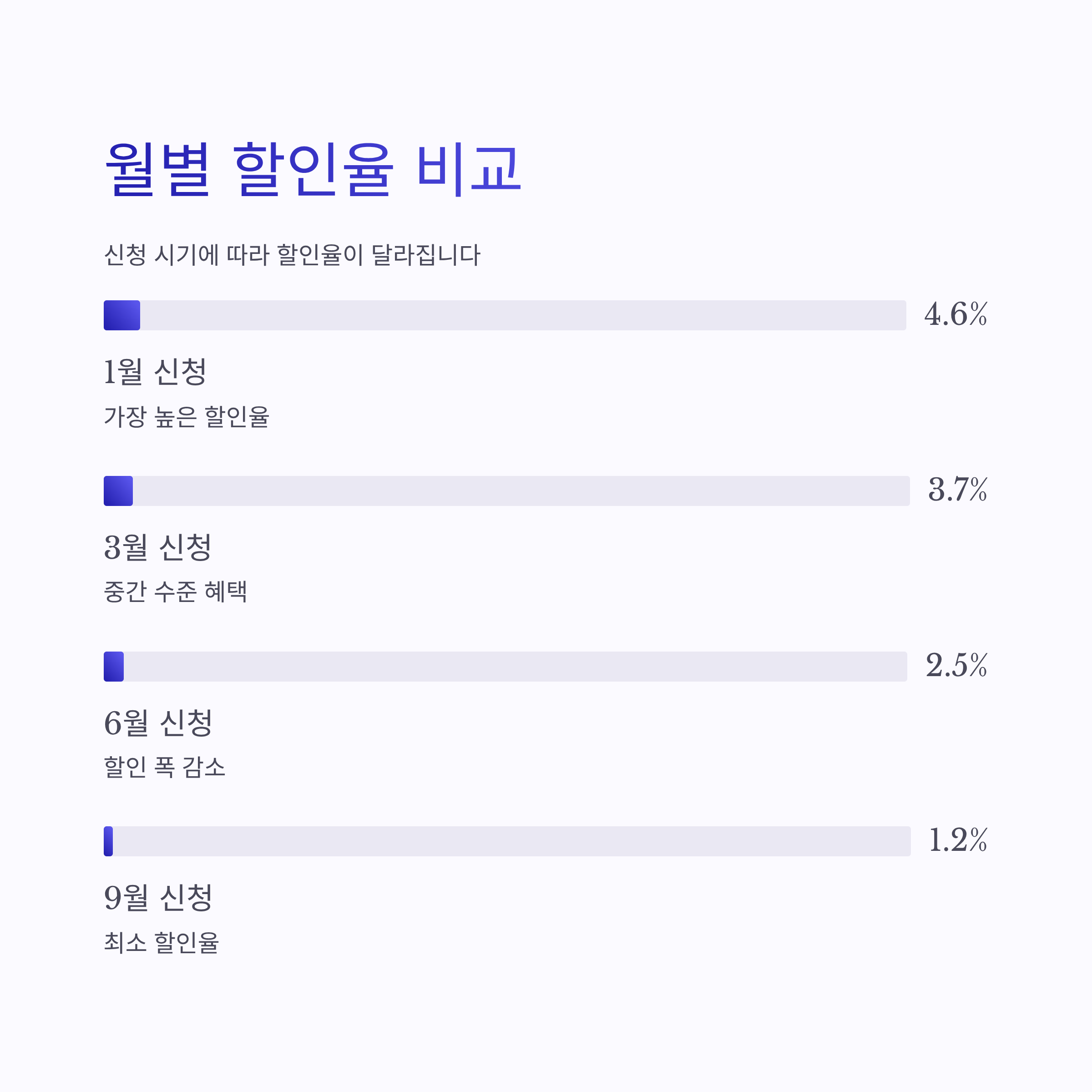| 구분 | 신청 가능 시기 | 할인율(2026년) | 특징 | | -- | ---------- | ---------- | ----- | | 1월 | 1월 16일~31일 | 약 4.6% | 할인 최대 | | 3월 | 3월 중 | 약 3.7% | 중간 수준 | | 6월 | 6월 중 | 약 2.5% | 혜택 감소 | | 9월 | 9월 중 | 약 1.2% | 거의 없음 |