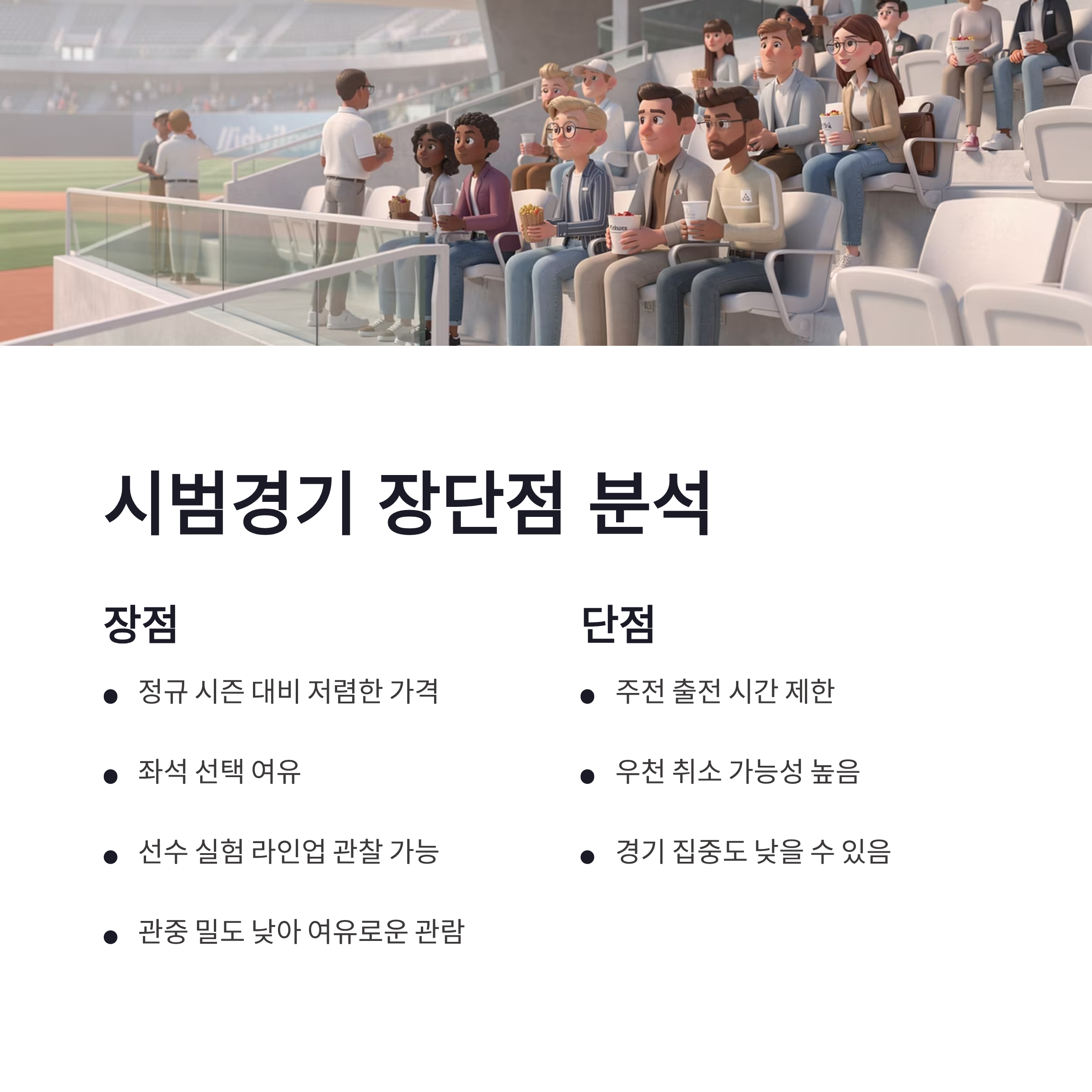 * 정규 시즌 대비 저렴한 가격 * 좌석 선택 여유 * 선수 실험 라인업 관찰 가능