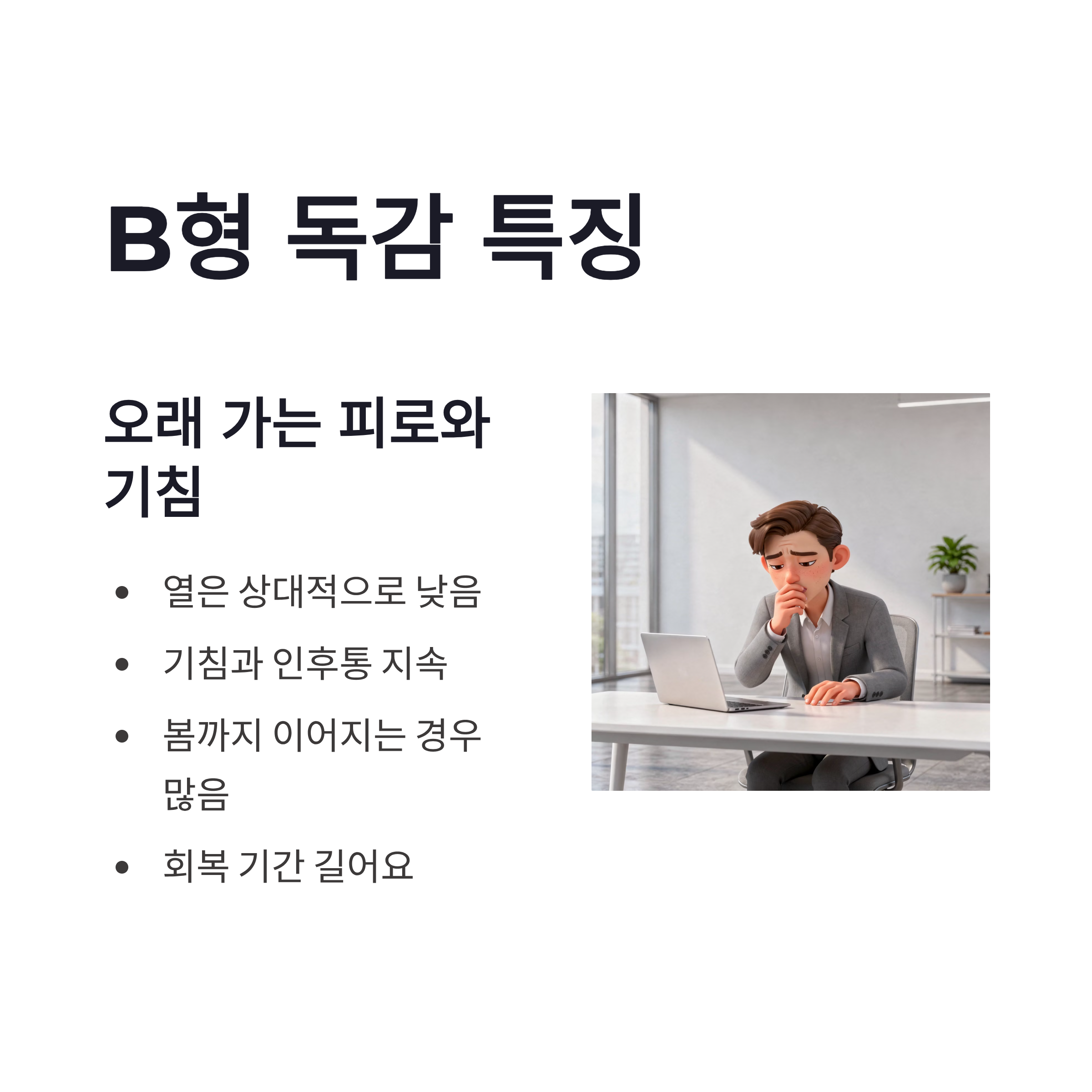 제가 직접 겪어본 느낌으로 말하자면, A형은 진짜 갑자기 옵니다. 아침엔 멀쩡했는데 점심 지나면서 고열, 오한, 근육통이 한꺼번에 몰려오더라구요. 반면 B형은 열은 조금 덜한데 기침, 인후통, 피로감이 오래 가는 타입이었어요. 그래서 A형 B형 독감 차이를 증상만 봐도 어느 정도 감이 옵니다.