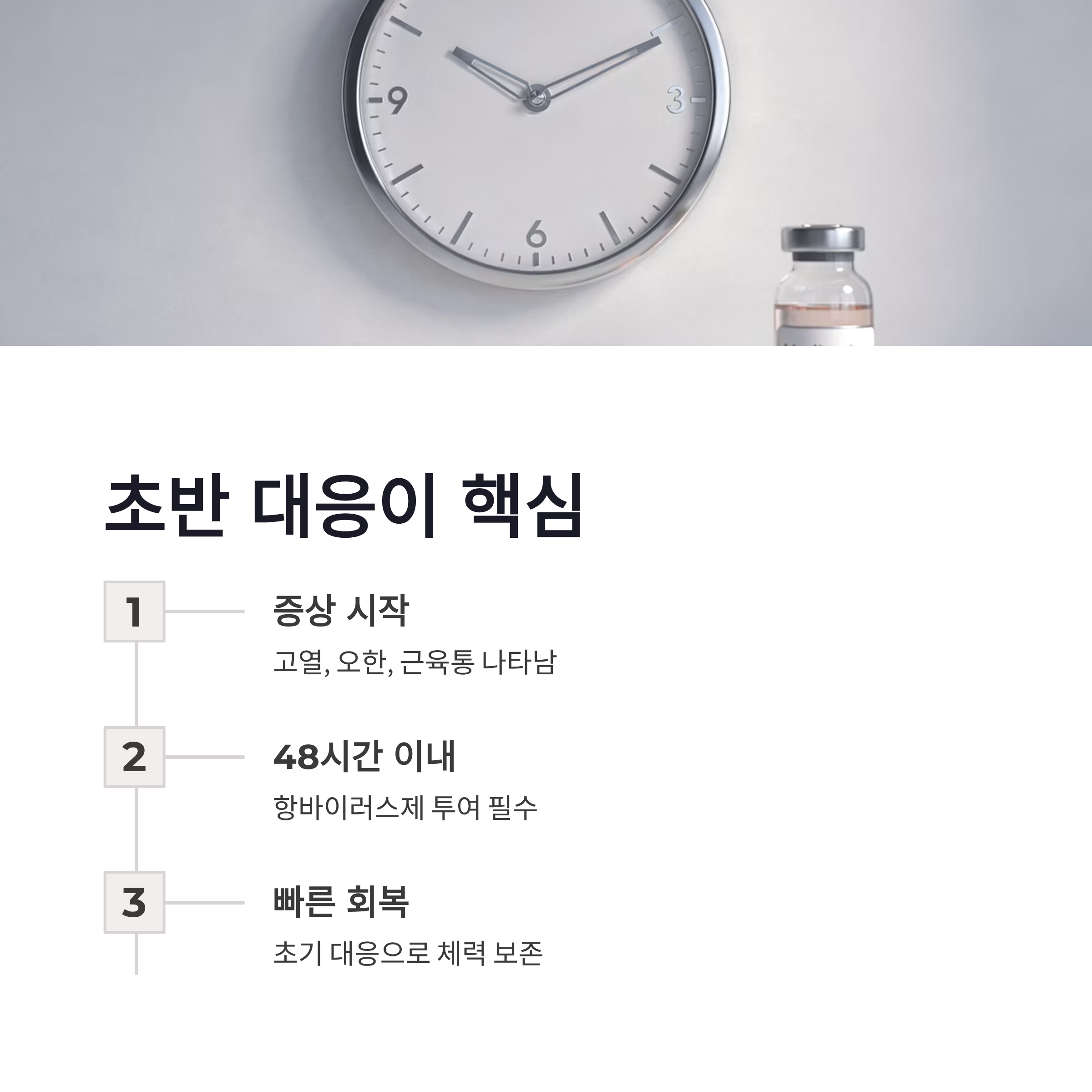 | 증상 특징 | 고열·몸살 강함 | 기침·피로 오래감 |