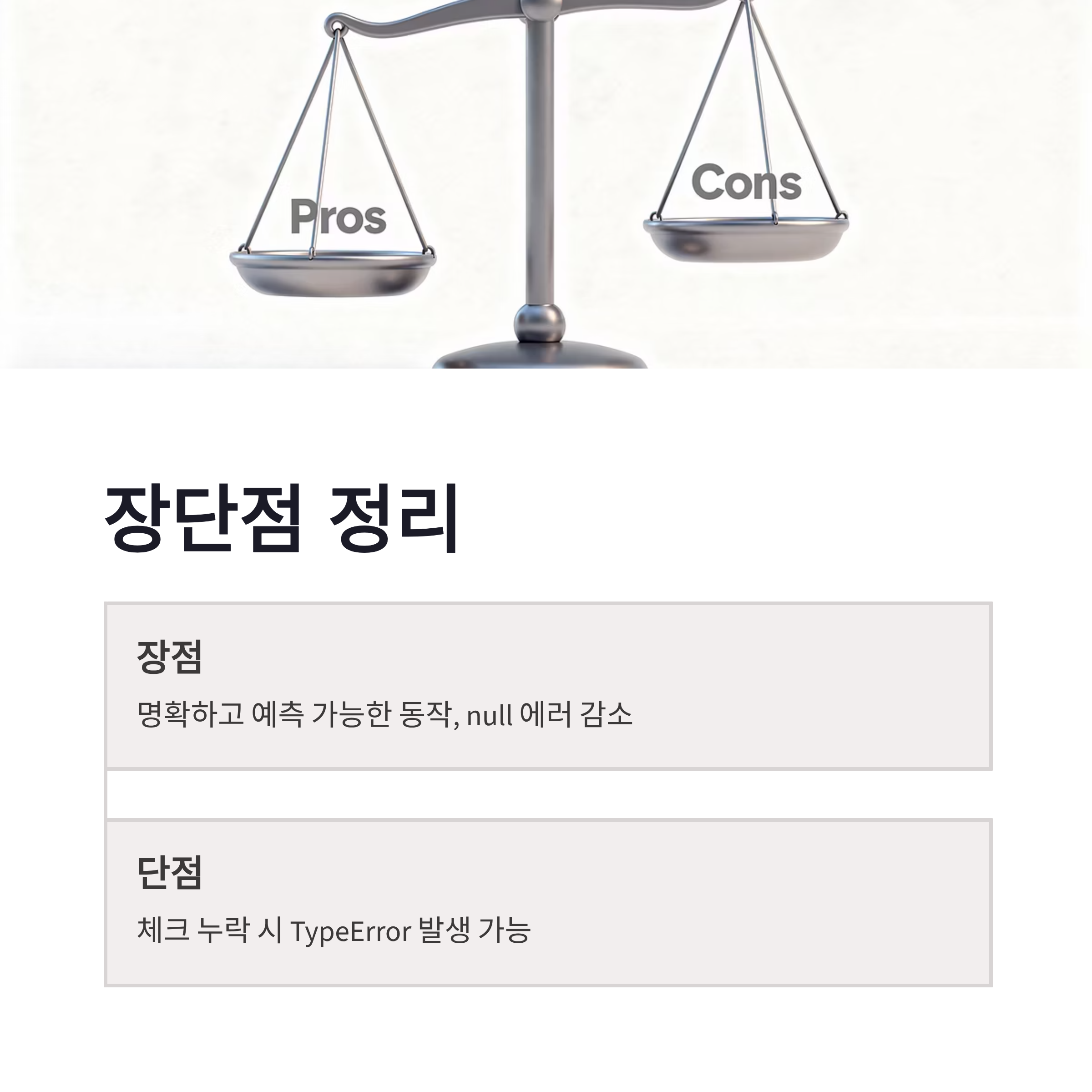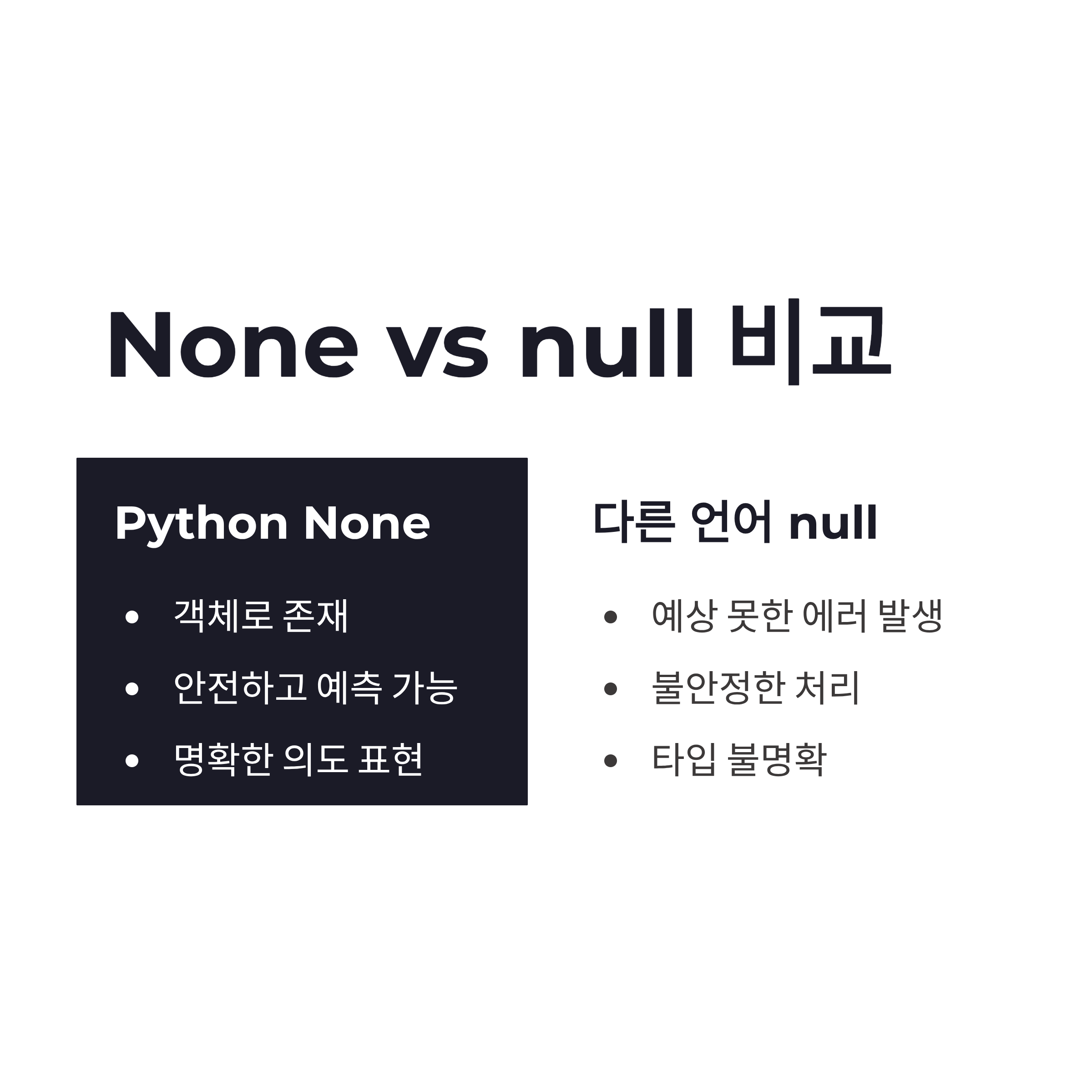 다른 언어에서 나오는 null이랑 Python의 None은 비슷해 보이지만 결은 좀 달라요. Python의 None은 객체라서 더 안전한 편입니다. 장점부터 보면, 명확하고 예측 가능하다는 점이 제일 큽니다. 예상 못한 null 에러로 터지는 경우가 확 줄어들어요. 반면 단점은, None 체크를 깜빡하면 TypeError가 날 수 있다는 점… 이건 진짜 많이 겪어봤습니다 ㅠㅠ 2026년 기준으로는 타입 힌트(Optional)랑 같이 쓰는 패턴도 거의 기본처럼 자리 잡았고, 코드 가독성 면에서는 None을 적극적으로 쓰는 쪽이 훨씬 깔끔하더라구요.