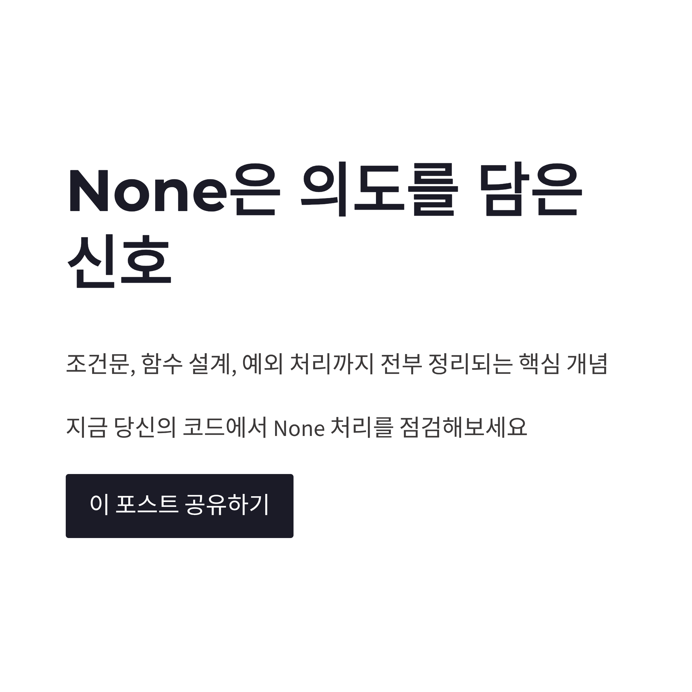 프로그래밍 하다 보면 진짜 자주 마주치는 게 None입니다. 처음엔 이게 값인지, 에러인지 헷갈렸는데요. 결론부터 말하면 None은 값이 없다는 걸 명확하게 표현하는 하나의 객체입니다. Python에서는 NoneType이라는 고유한 타입을 가지구요. 변수에 아무것도 안 담긴 상태를 그냥 비워두는 게 아니라, “의도적으로 비어 있음”을 표시하는 느낌이라 보면 이해가 빠르더라구요. 저도 초반엔 None이랑 0이랑 헷갈려서 조건문에서 계속 삽질했는데요 ㅠㅠ None은 0도 아니고, 빈 문자열도 아니고, False도 아닙니다. 이 차이만 알아도 코드가 훨씬 또렷해집니다. 특히 함수에서 반환값이 없을 때 자동으로 None이 반환되는 구조, 이거 은근 중요했구요.