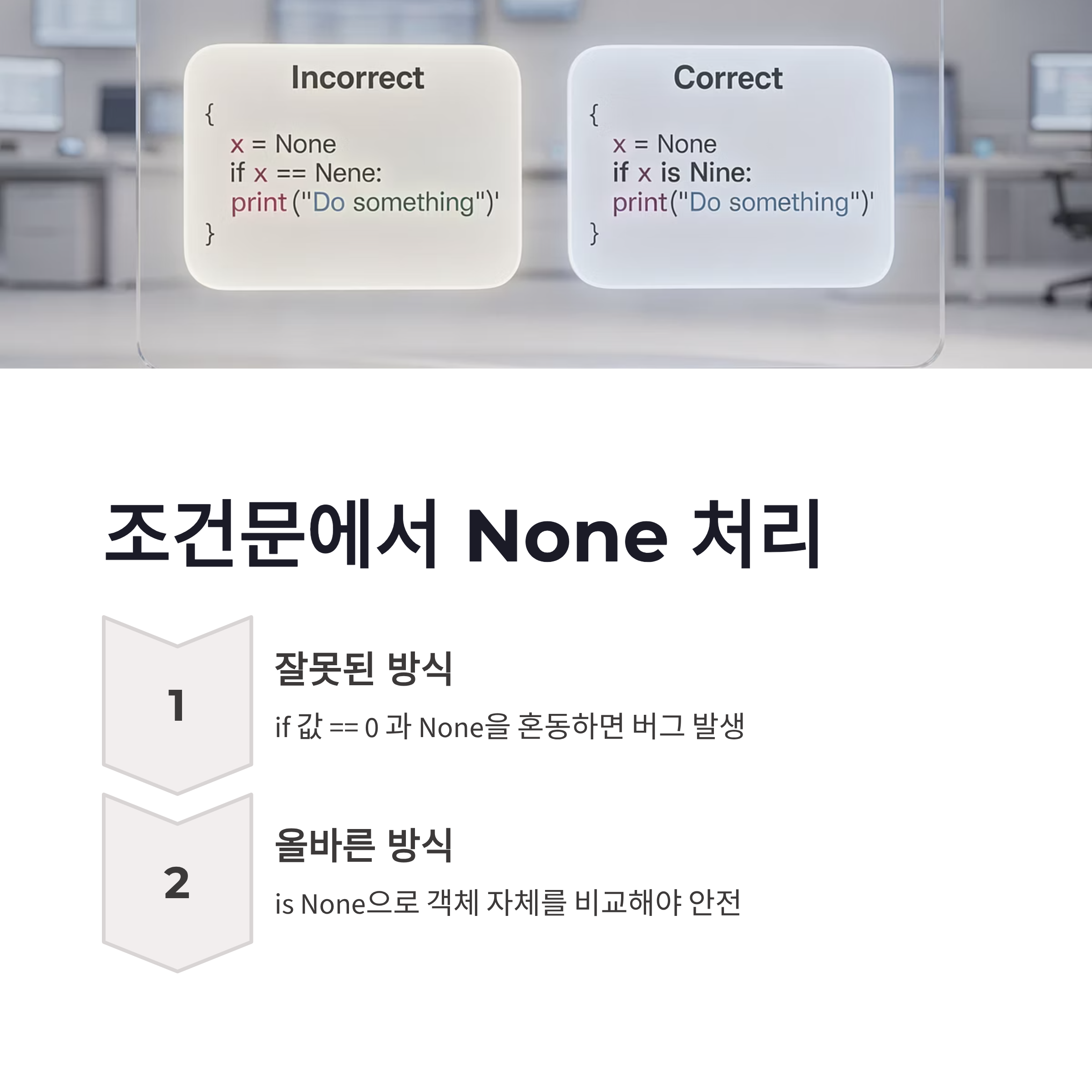 2026년 기준으로 파이썬 코드들 보면, None을 전제로 한 구조가 훨씬 많아졌어요. 함수 반환값으로 None을 쓰고, 이후에 조건 분기로 처리하는 방식이 거의 기본처럼 느껴집니다. None 이해가 부족하면 이런 코드 읽을 때도 막히더라구요. 장점부터 보면, 코드 의도가 진짜 명확해요. “아직 결과 없음”, “값이 존재하지 않음”이 딱 드러나거든요. 반대로 단점은, None 체크를 빼먹으면 바로 에러로 이어진다는 점… 이거 은근 자주 당합니다 ㅋㅋ 그래서 요즘은 `is None` 비교를 습관처럼 쓰는 게 거의 기본이에요. `== None` 말고 `is None` 쓰는 이유도, 객체 자체를 비교하기 때문이구요. 이런 작은 습관 하나가 에러를 확 줄여줍니다.