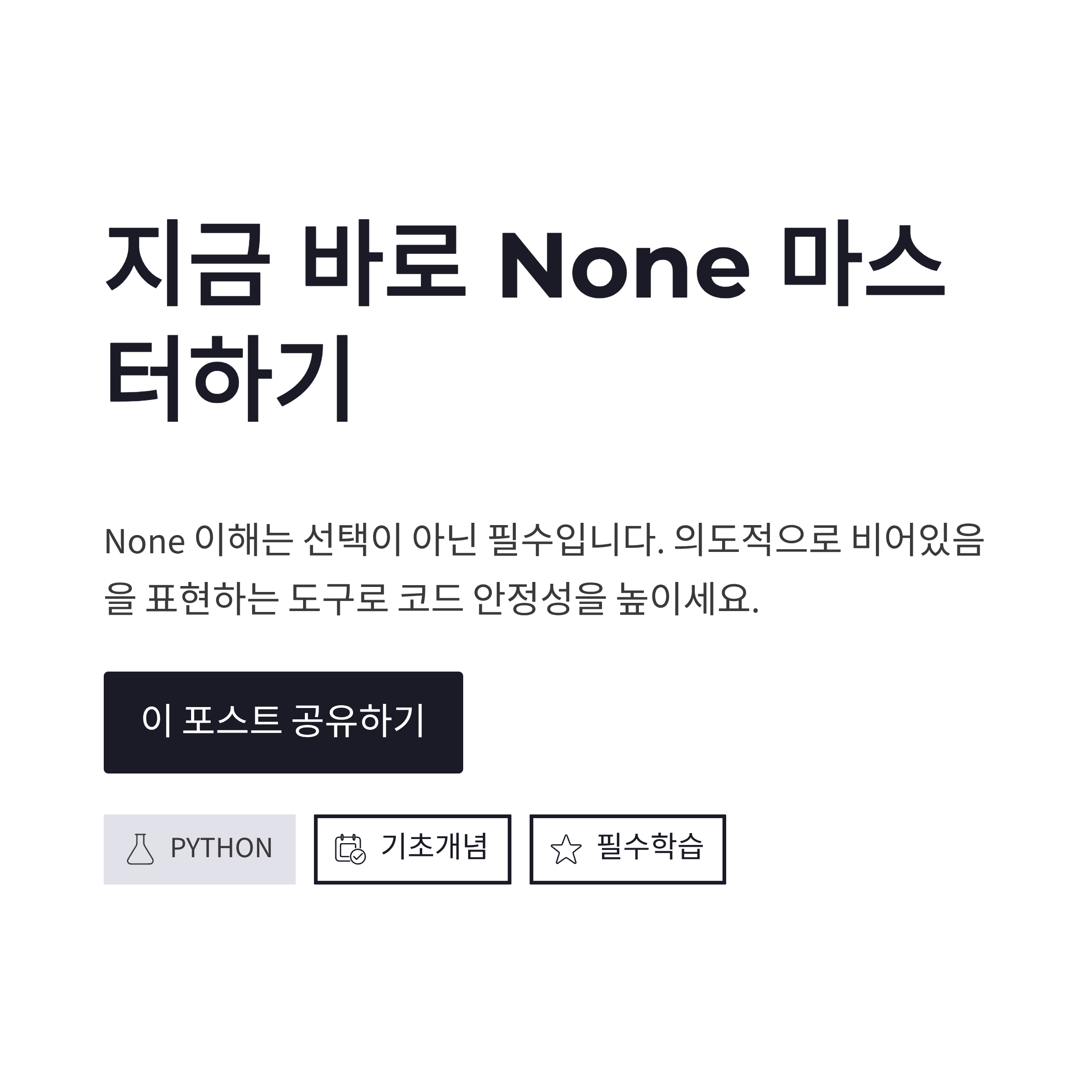 정리해보면 None 이해는 선택이 아니라 필수 같아요. 파이썬에서 None은 그냥 비어 있는 값이 아니라, *의도적으로 비어 있음을 표현하는 도구*거든요. 이걸 제대로 쓰면 코드가 읽기도 쉽고, 버그도 줄어듭니다. 저도 None 개념 정리하고 나서 조건문이 훨씬 단순해졌구요. 괜히 애매하게 0이나 빈 문자열로 처리하던 습관도 자연스럽게 사라졌습니다. 혹시 아직 None이 헷갈린다면, 지금이라도 None 이해부터 다시 잡아보는 거 추천드려요. 생각보다 체감 차이 큽니다 ㅎㅎ