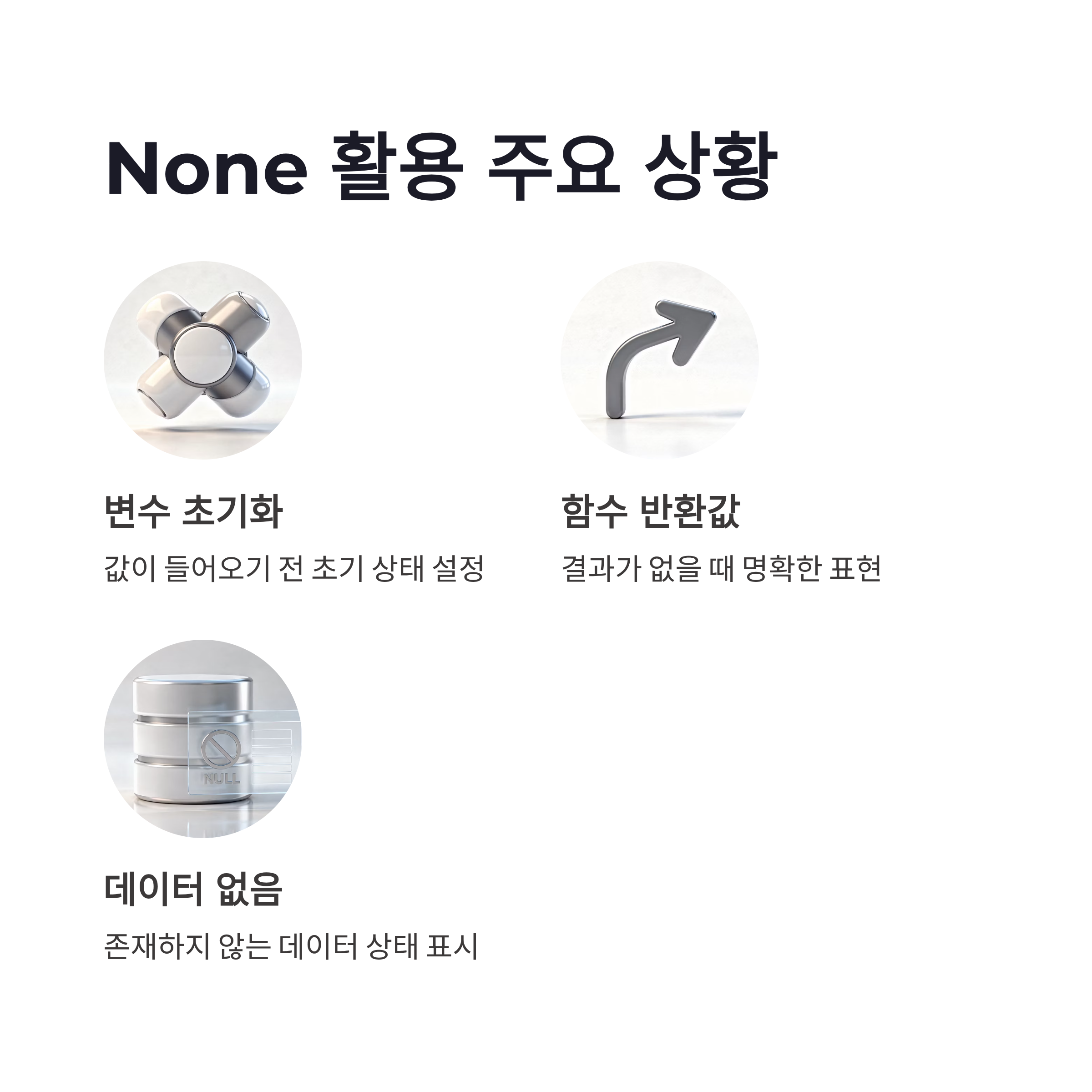 이렇게 비교해보면 None 이해가 왜 중요한지 바로 느껴지더라구요. 특히 데이터베이스에서 값이 없는 컬럼, 사용자 입력이 아직 안 들어온 상태를 표현할 때 None을 쓰면 코드가 훨씬 깔끔해집니다. 연관해서 많이 쓰이는 개념이 *null 처리, 초기값 설정, 예외 분기* 이런 쪽이었어요.