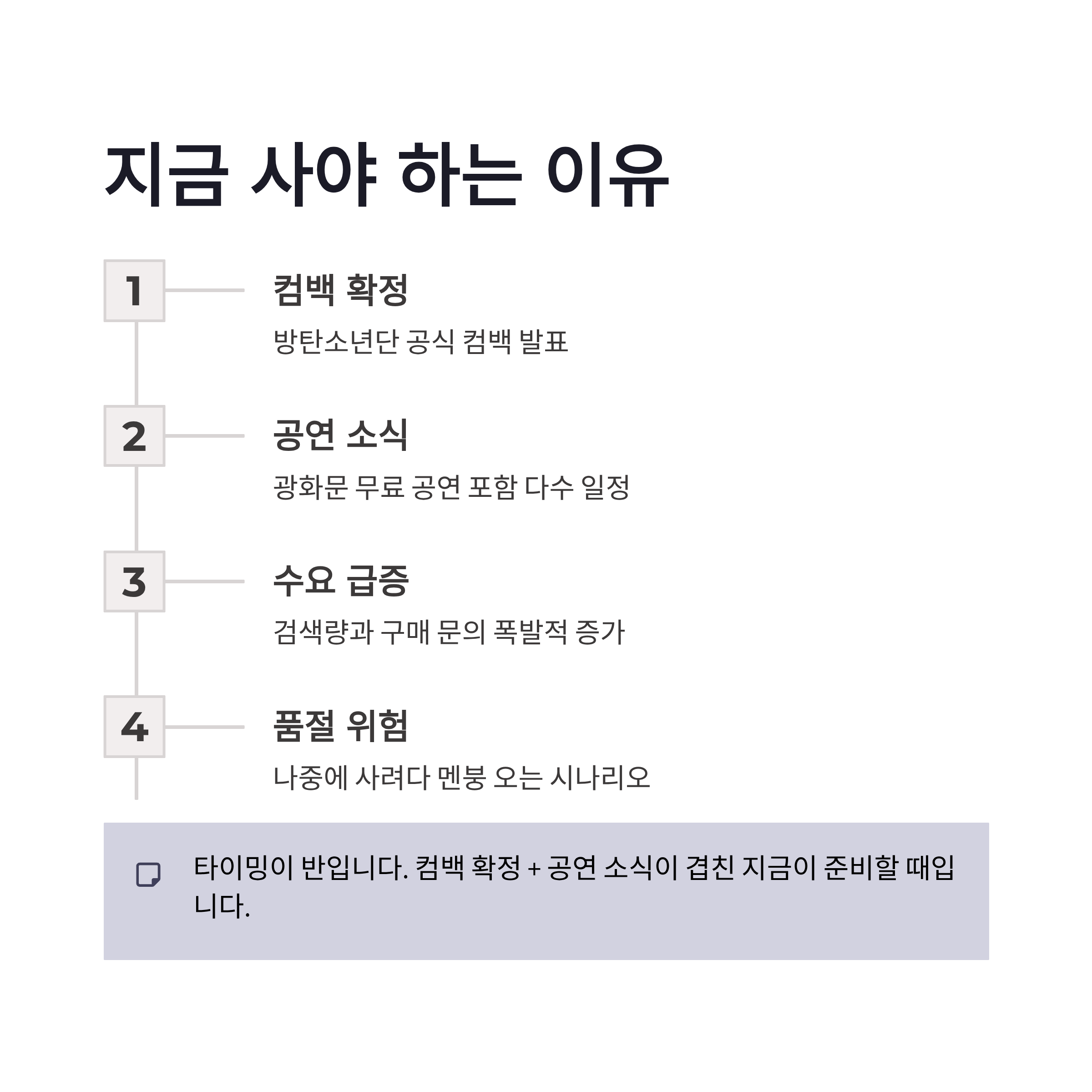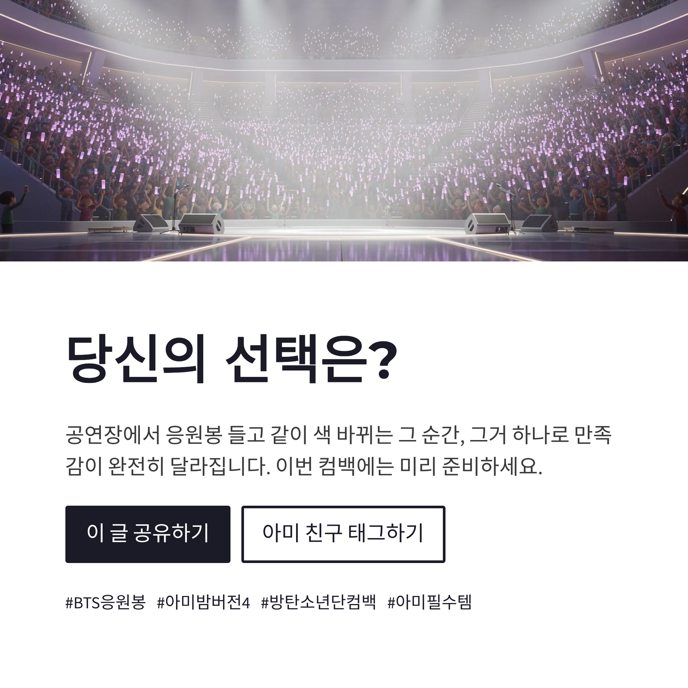 정리해보면, bts 응원봉 아미밤 버전4 구매 사는법은 타이밍이 반입니다. 컴백 확정 + 공연 소식 + 무료 광화문 무대까지 겹친 지금은 수요가 확 올라간 상태예요. 나중에 사야지 했다가 품절 나면 진짜 멘붕 옵니다 ㅠㅠ 저는 이번엔 미리 준비해두는 쪽으로 마음 굳혔구요. 공연장에서 응원봉 들고 같이 색 바뀌는 그 순간, 그거 하나로 만족감이 다르더라구요. 여러분은 이번 컴백에 bts 응원봉 준비해둘 생각이신가요?