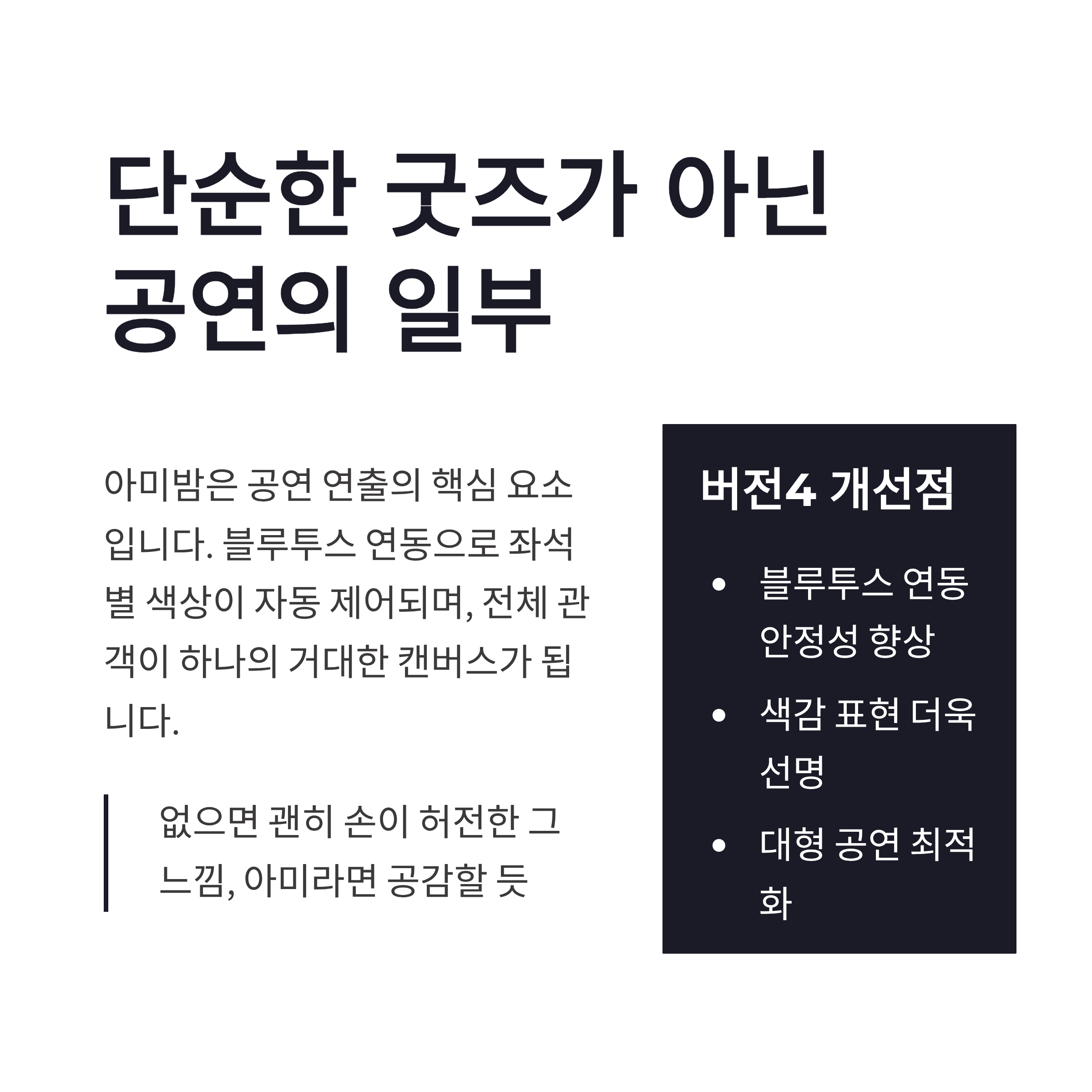 2026년 기준으로 보면 bts 응원봉 아미밤 버전4는 확실히 완성도가 올라갔습니다. 공연장 자동 연동 속도도 빠르고, 좌석별 색상 제어도 더 자연스럽더라구요. 특히 대형 야외 공연에서 체감 차이가 큽니다.