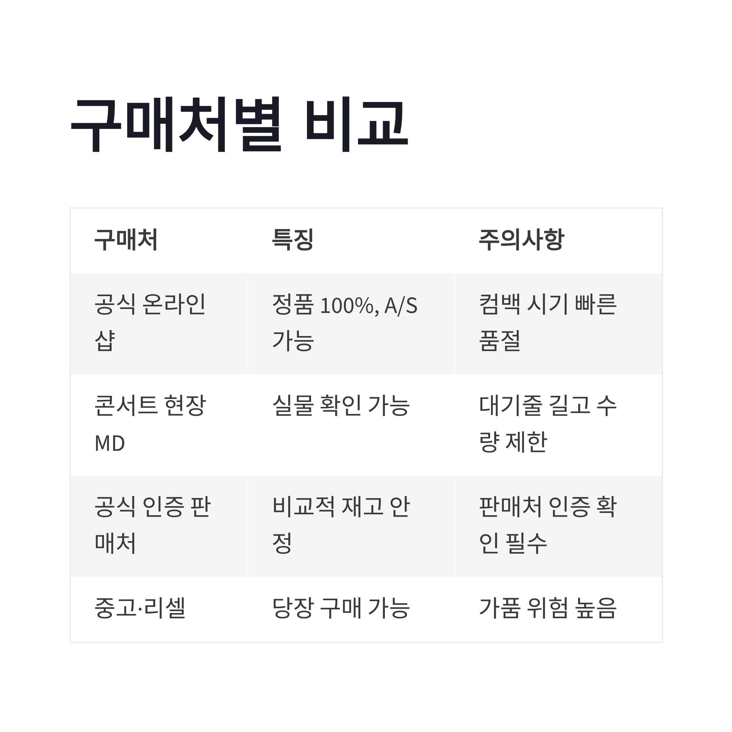 | 콘서트 현장 MD | 실물 확인 가능 | 대기줄 길고 수량 제한 |