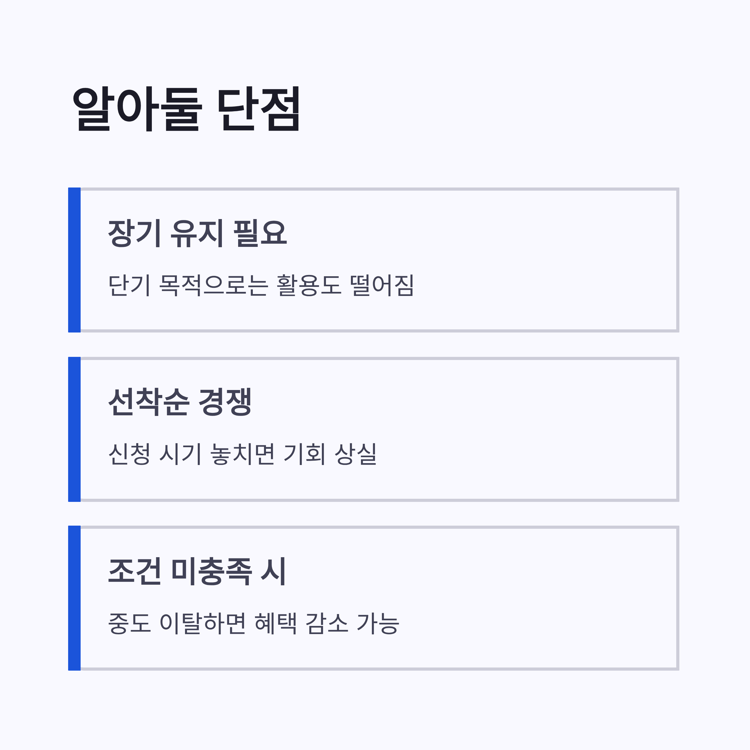 * 장기 유지 조건이 있어서 단기 목적엔 애매 * 선착순이라 경쟁 있음 * 중도에 조건 못 채우면 활용도가 떨어질 수 있음