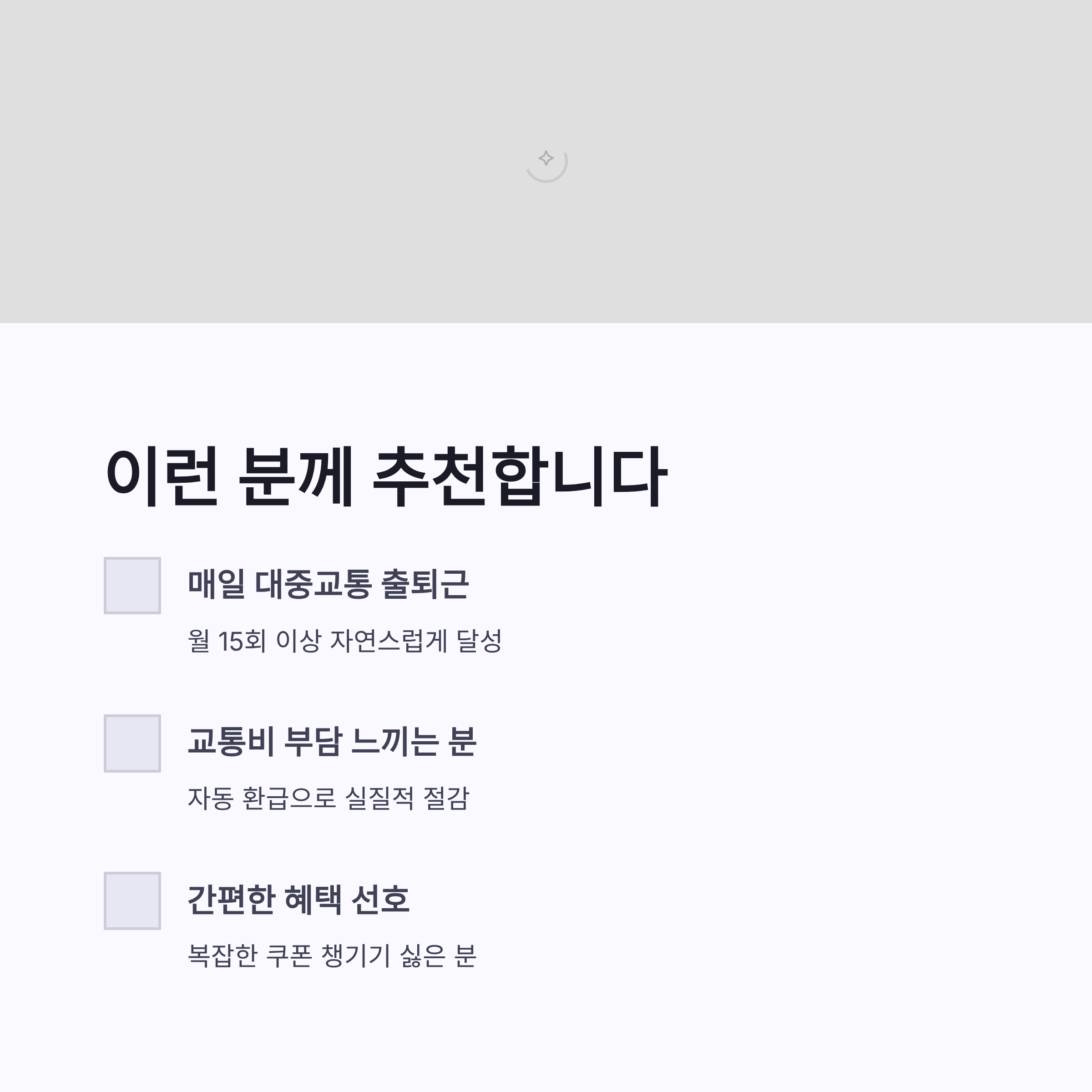 | 이용 조건 | 월 15회 이상 대중교통 이용 | 출퇴근이면 달성 쉬움 |