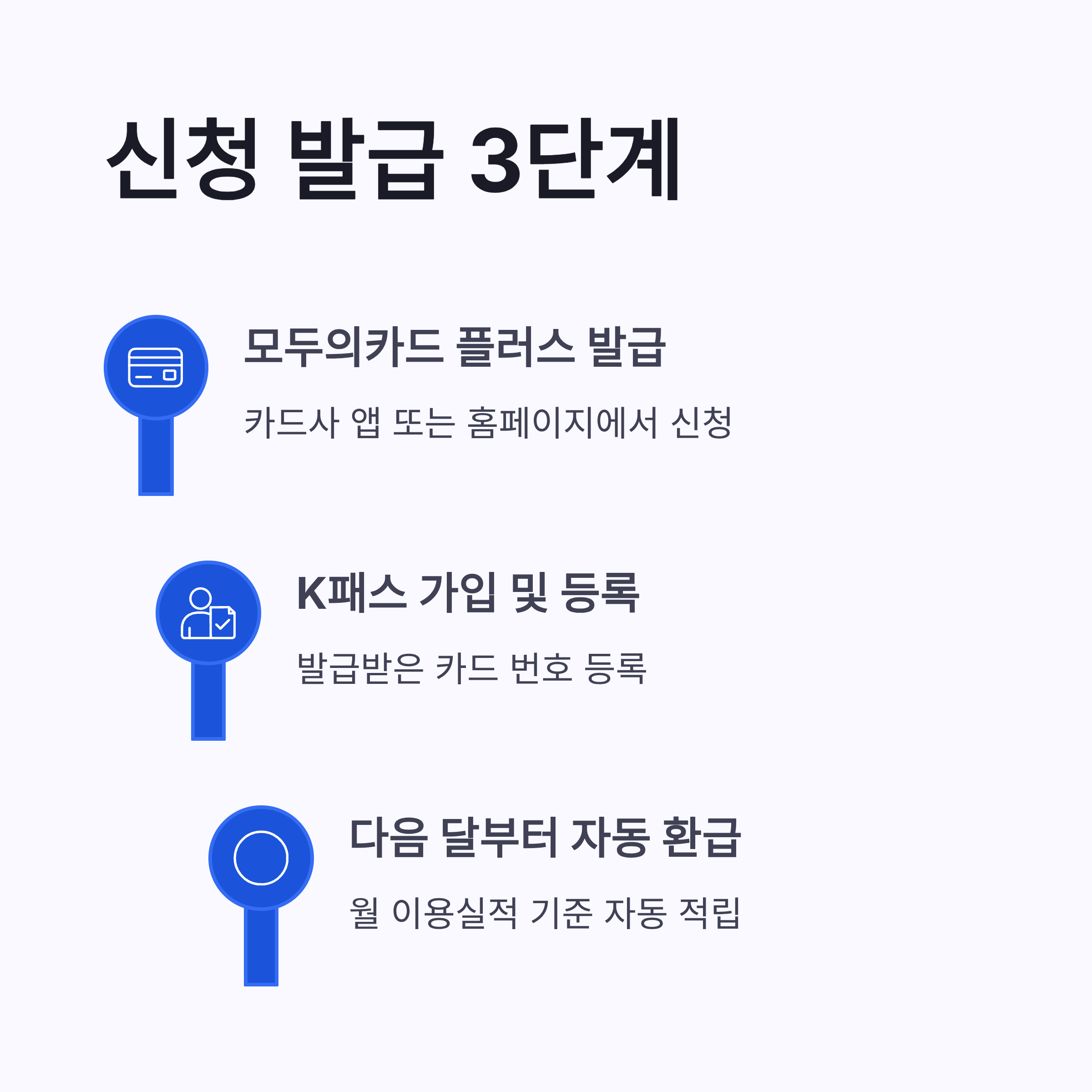 1. 모두의카드 플러스 카드 발급(카드사 앱/홈페이지) 2. K패스 가입 후 본인 카드 등록 3. 다음 달부터 월 이용실적 기준으로 자동 환급 확인