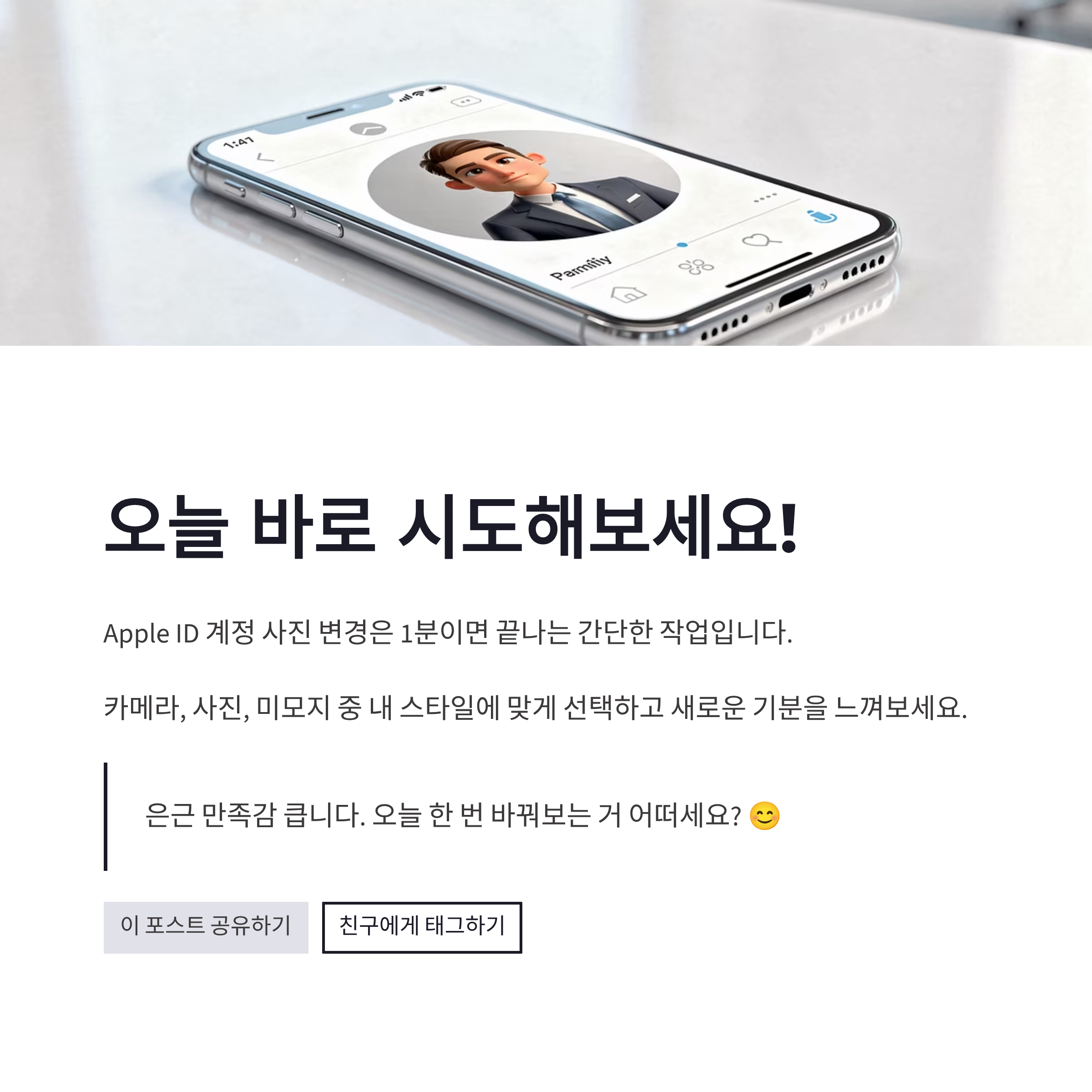 정리해보면 아이폰 Apple ID 계정 사진 변경은 설정 앱에서 1분이면 끝나는 작업이었어요. 카메라, 사진, 미모지 중에서 내 스타일에 맞게 고르면 되고, 바꾸고 나면 은근히 기분도 새로워지더라구요 혹시 아직 예전 사진 그대로라면 오늘 한 번 바꿔보는 거 어떠세요? 은근 만족감 큽니다 ㅎㅎ